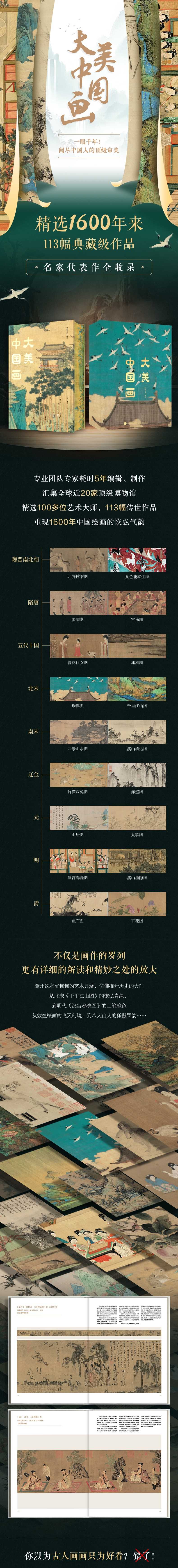 精选1600年来最美的113幅作品,名家代表作全收录专业团队专家耗时5年编辑、制作,汇集全球近20家顶级博物馆,精选100多位艺术大师,113幅传世作品,重现1600年中国绘画的恢弘气韵中国画经典风格全覆盖全面涵盖山水画、人物画与花鸟画,每个家庭应该拥有的一本典藏集中国艺术画册不仅是画作的罗列,更有详细的解读和精妙之处的放大每幅画作均有详细解读,文字流畅精炼,通俗易懂,详尽展现传世名作的绝妙细节,专业但不枯燥市面罕见的加长版大拉页为了全景式展现中国画的神韵和深远意境,特别在书中增加2幅作品的大拉页,展开后的画卷磅礴大气,为观者提供前所未有的震撼观画体验一眼千年!《大美中国画》带你沉浸式穿越中国美学巅峰翻开这本沉甸甸的艺术典藏,仿佛推开历史的大门从北宋《千里江山图》的恢弘青绿,到明代《汉宫春晓图》的工笔绝色;从敦煌壁画的飞天幻境,到八大山人的孤傲墨韵大16开,画作高清复刻,连绢帛的纹理、墨色的浓淡都清晰可见!