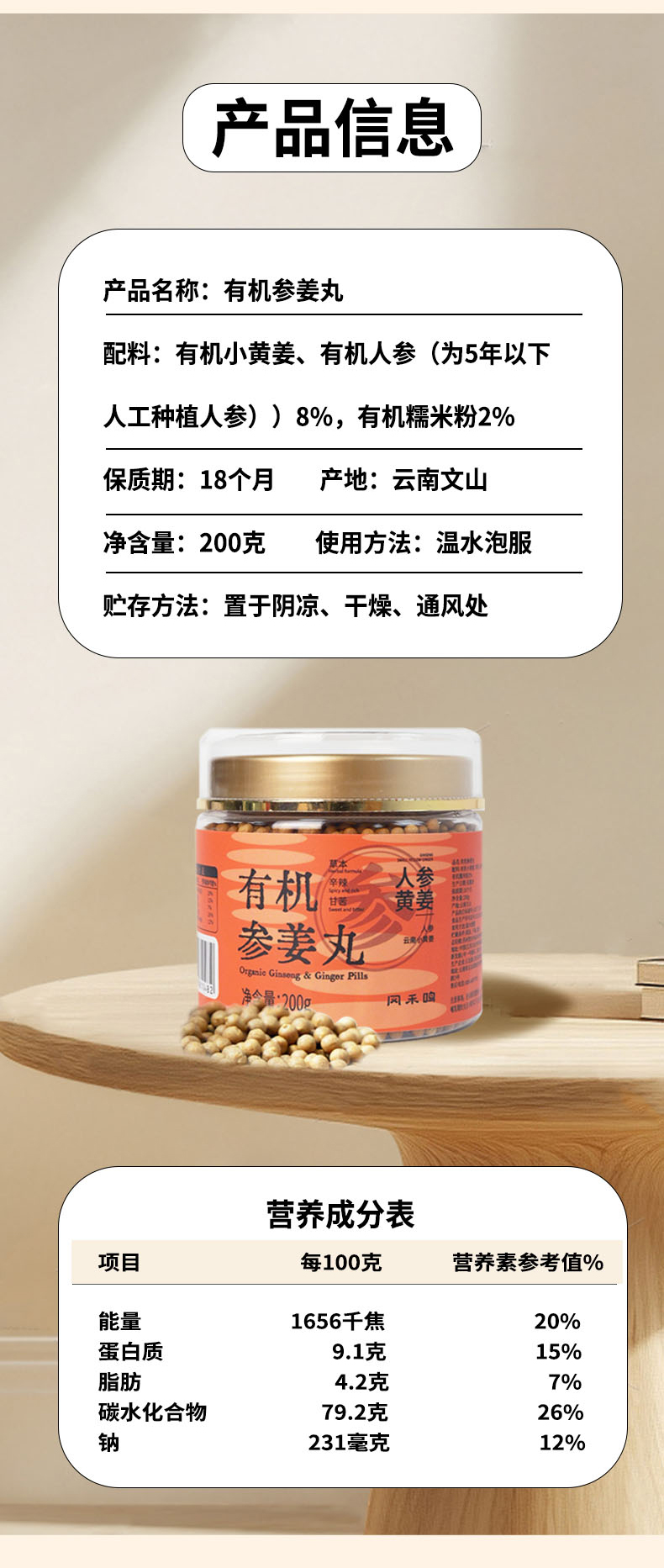 有机参姜丸200g|云南小黄姜人参熟姜粉丸子即食补充剂