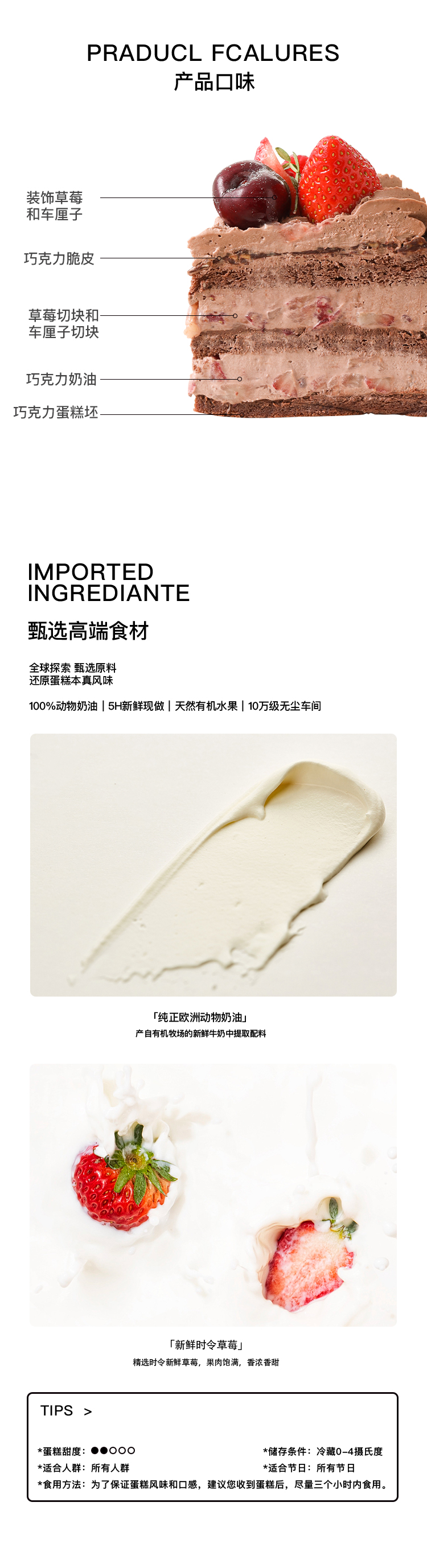 水果受季节影响,种类有变化,但总克重不变。夹心水果:青提。装饰水果:车厘子、树莓、黑树莓、蓝莓、草莓