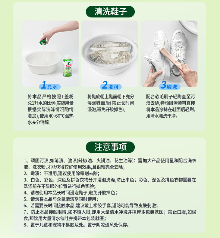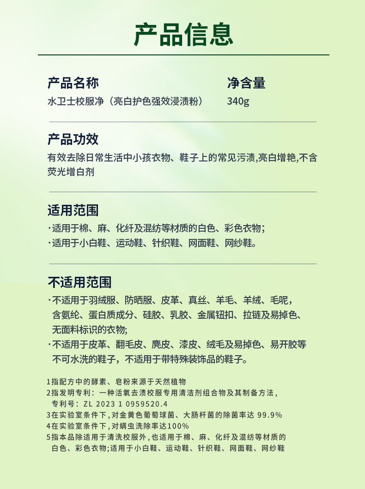 温馨小提示:校服净适用于白色或彩色校服清洁,棉、麻、化纤及混纺等材质、毛巾、鞋子等都可。但彩色衣物使用前请先在不明显部位做局部測试,遇水易褪色、易染色、串色的衣物不适用本品。同时,不适用于丝绸、羊毛、羽线、毛呢、皮革等材质的衣物,也不要与含氟的清洁剂同时使用哦!