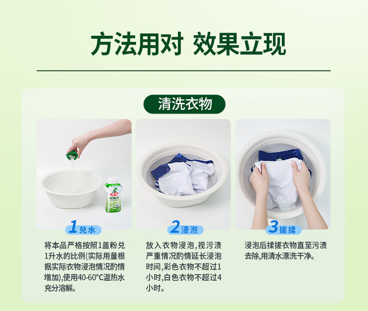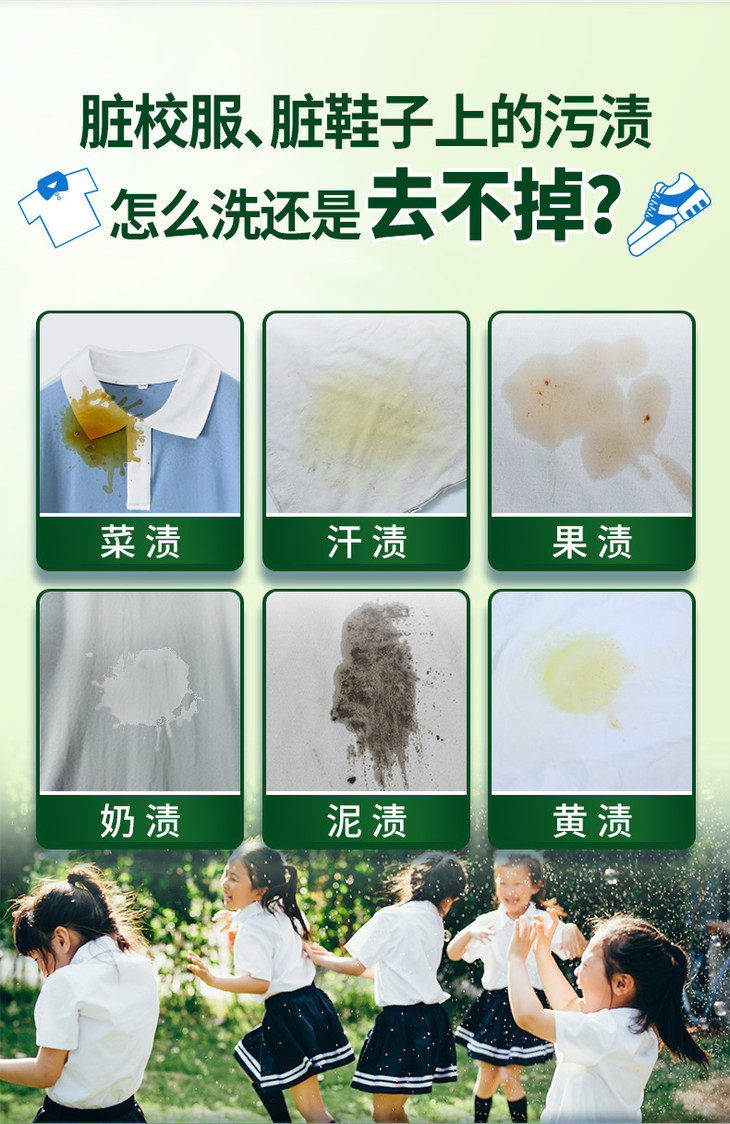 一瓶校服净,等于爆炸盐+洗衣液,泥土、果渍、菜渍、笔渍、油渍、调料渍等各种让人头疼的污垢,都能轻松应对,再也不用头疼孩子五颜六色的校服了!使用也超级简单,如果不是特别脏只需要日常清洁,可以直接替代洗衣粉放入洗衣机清洗。各种脏脏黄黄的旧衣服,就取适量校服净倒入40°C-60°C温水中充分溶解,再将衣服浸泡一会儿,再配合揉搓,就很容易漂洗干净啦!如果是特别特别顽固的污渍,浸泡后再搭配洗衣液,效果更佳,还可以取把校服净用40°C的温水混合成糊状,均匀涂抹在污渍处,适当揉搓(建议不超10分钟),然后再搭配洗衣液进行洗涤哦!