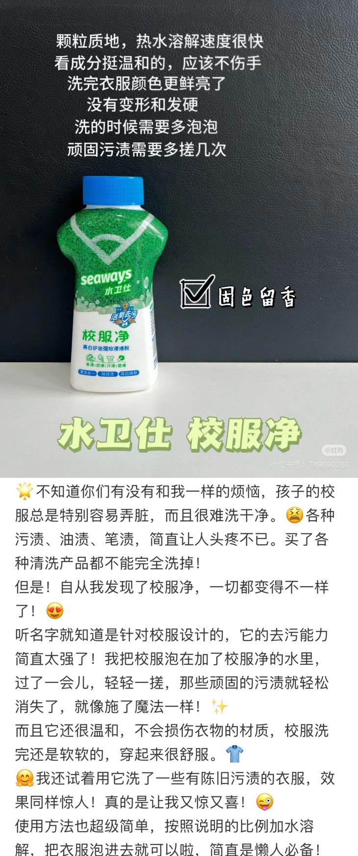 之前有老粉秀小白鞋神器,终于是搞定了小朋友白鞋去黑鞋回的问题,那么,就再来上个校服净吧,让各种黄橙红绿蓝的污渍,洗得更轻松,让孩子肆意玩闹,快乐成长!水卫仕的校服净,用的是活氧泡泡加洗护因子的双重配方,一瓶搞定各种污渍,而且味道也很可以哦,洗完香香柔柔!
