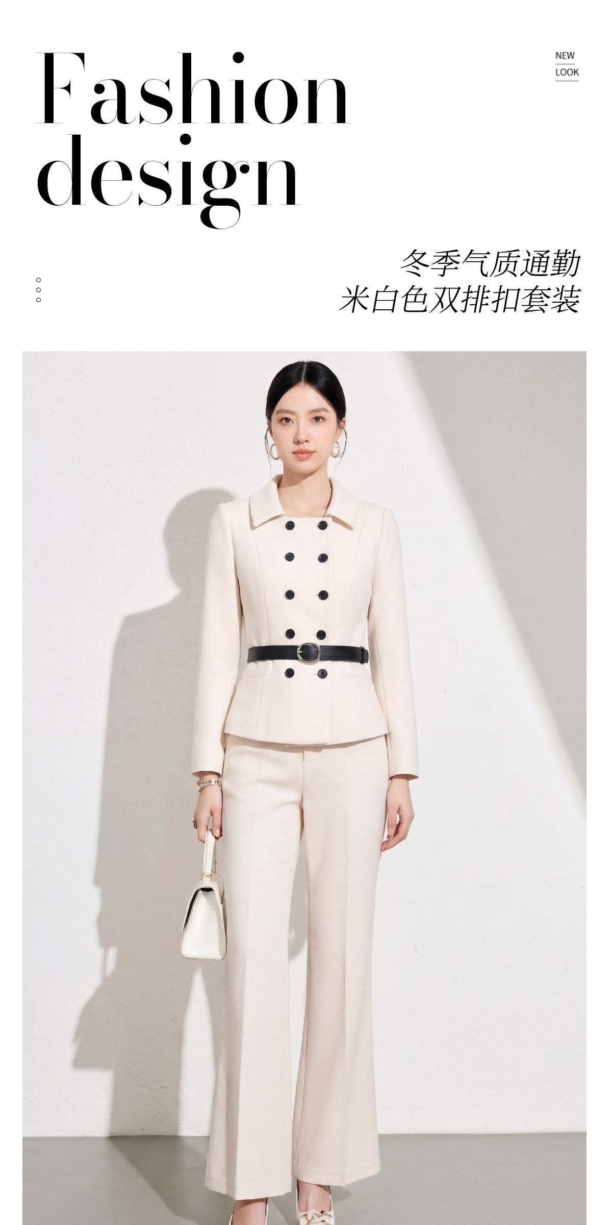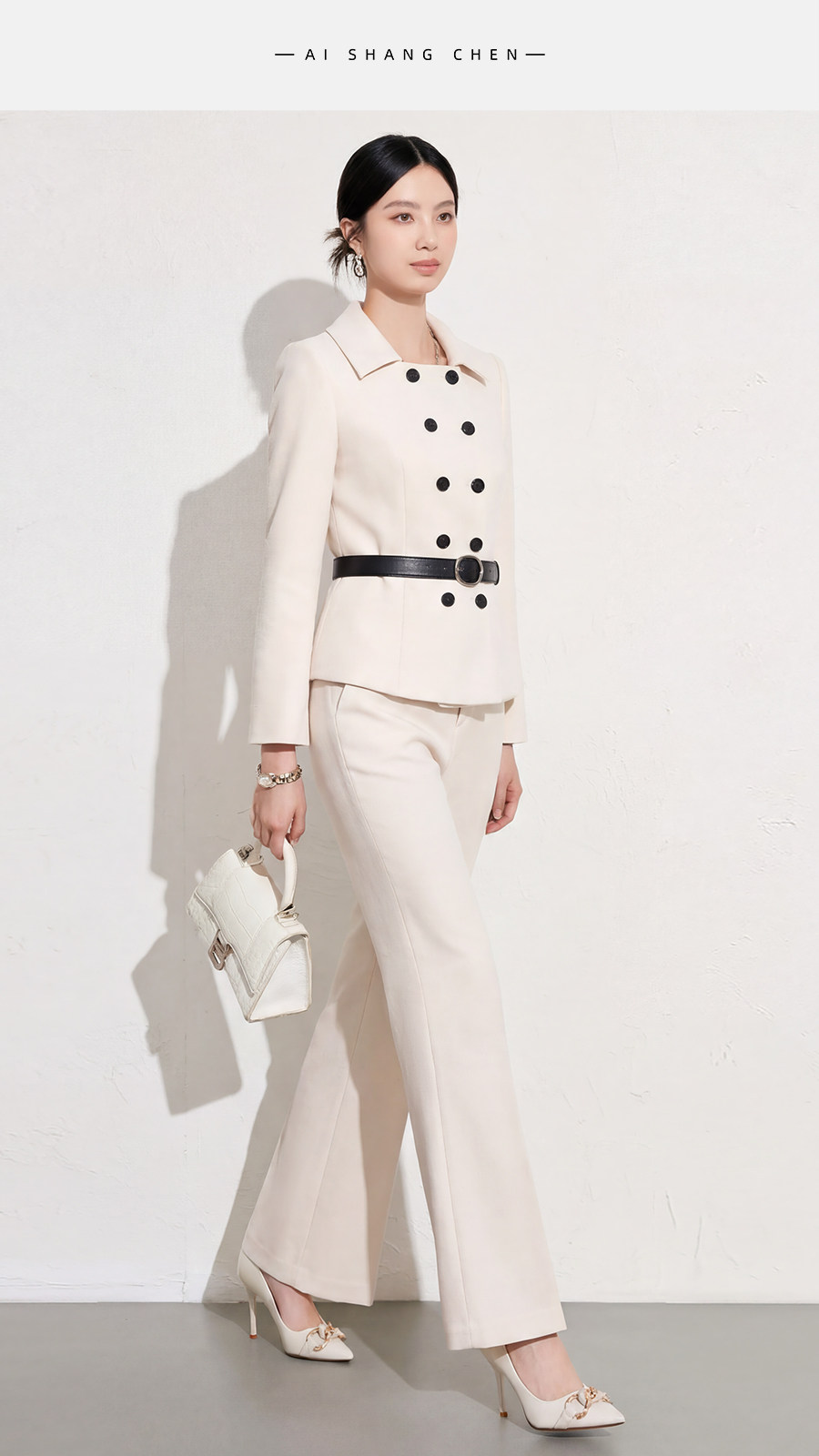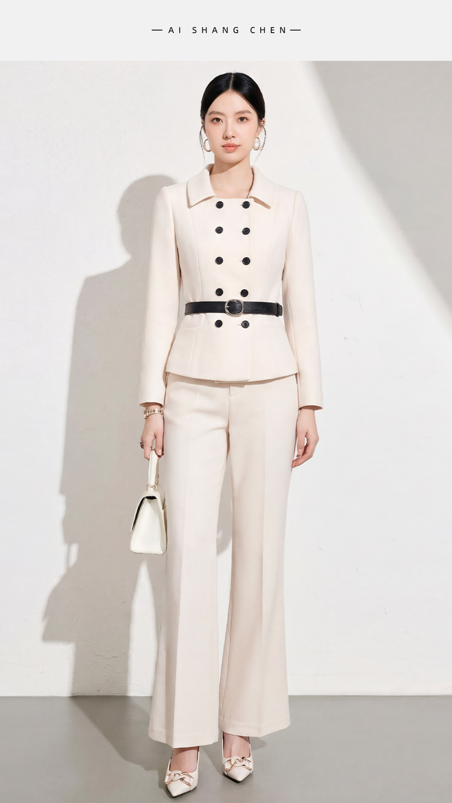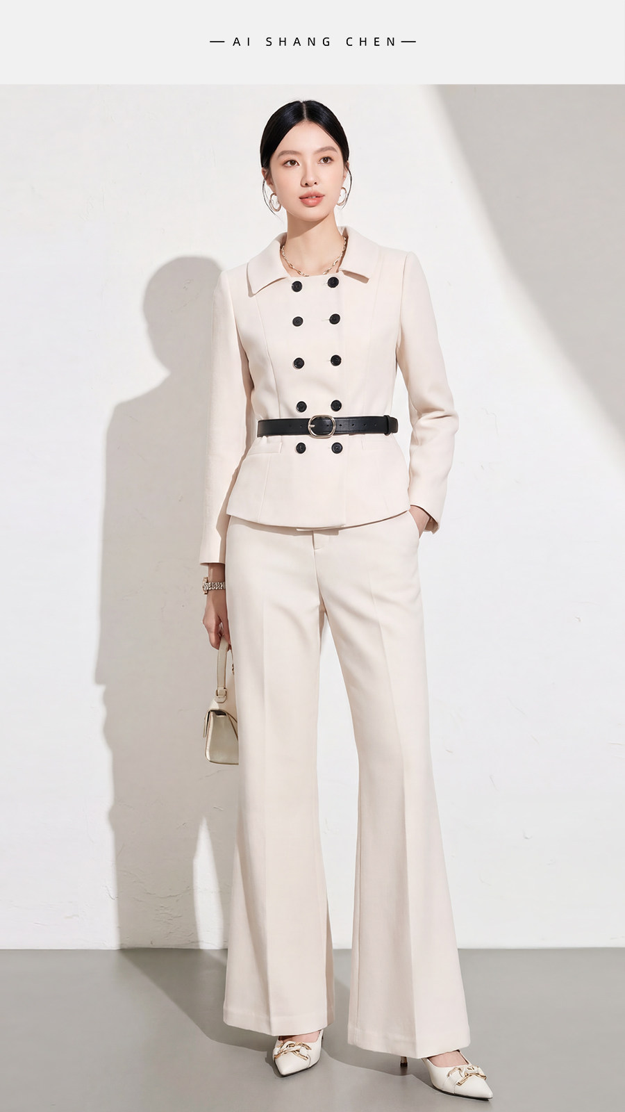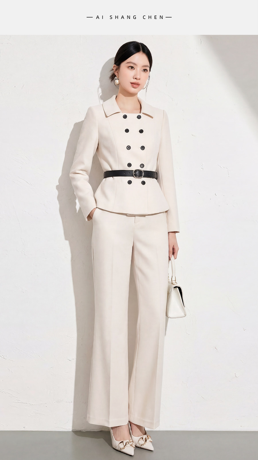 艾尚臣陈瑶同款米白色双排扣西装套装女收腰时尚两件套翻领冬季厚