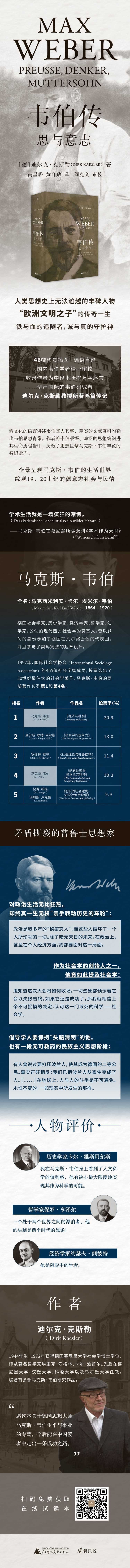 克斯勒借用大量往复书信、回忆录、影像等史料,再现了韦伯强烈的生命意志,同时选取了他所作的诸多重要的学术文本,探讨其诞生背景、运思过程以及后世影响,映照出韦伯未以时迁而黯淡的思想。