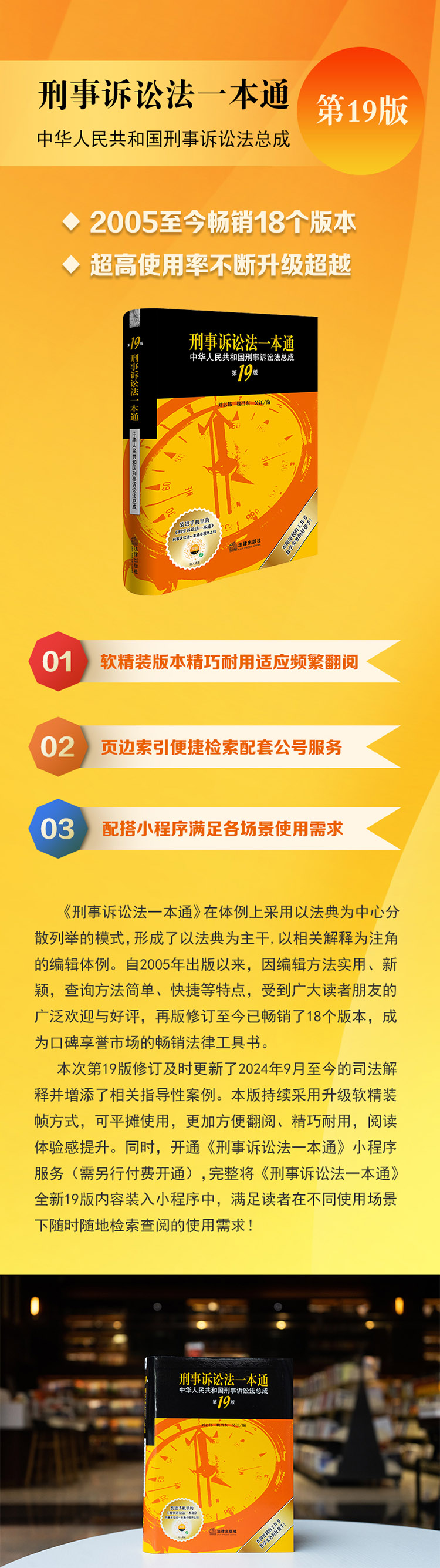 《刑事诉讼法一本通》在体例上采用以法典为中心分散列举的模式,形成了以法典为主干,以相关解释为注脚的编辑体例,自2005年出版以来,因编辑方法实用、新颖,查询方法简单、快捷等特点,受到广大读者朋友的广泛欢迎与好评,每年再版修订至今已畅销了18个版本,成为口碑享誉市场的畅销法律工具书。本次第19版修订及时更新了2024年9月至今的司法解释并增添了相关指导性案例。本版持续采用升级软精装帧,更加方便翻阅、精巧耐用,阅读体验感提升。同时,开通《刑事诉讼法一本通》小程序服务,完整将《刑事诉讼法一本通》全新19版内容装入小程序中,满足读者在不同使用场景下随时随地检索查阅的使用需求!