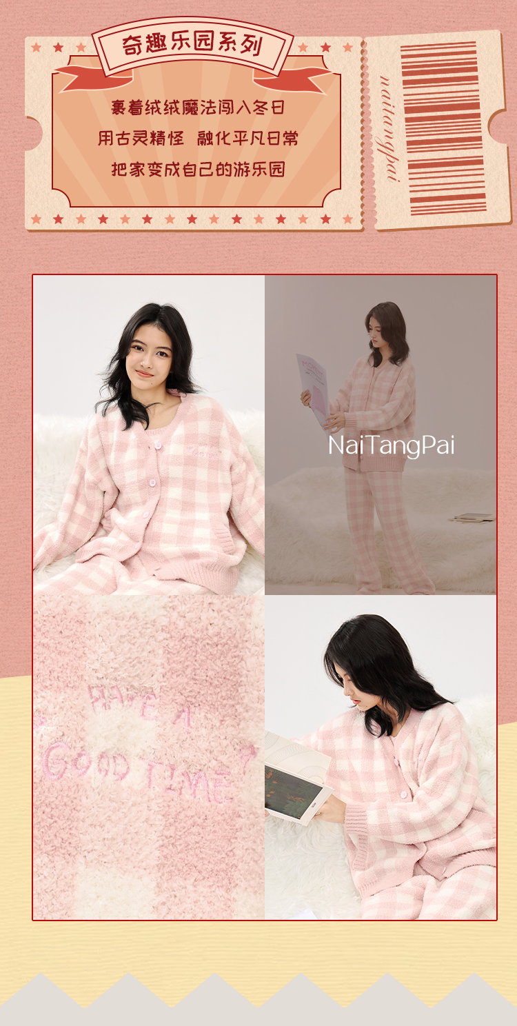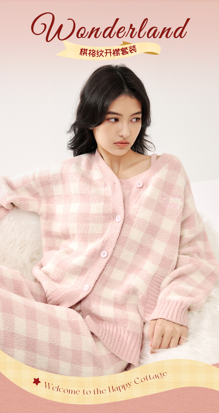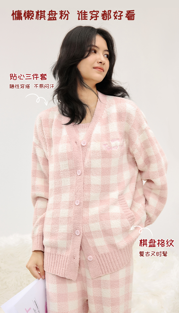 奶糖派奇趣乐园系列棋格纹开襟睡衣三件套舒适亲肤保暖秋冬家居服
