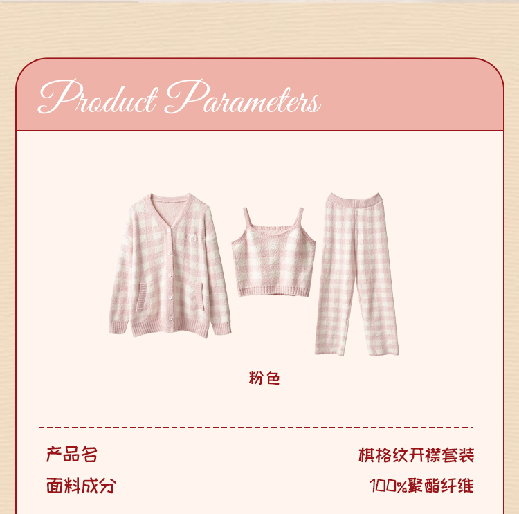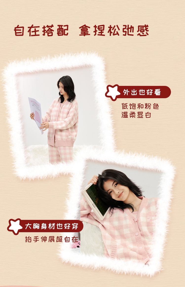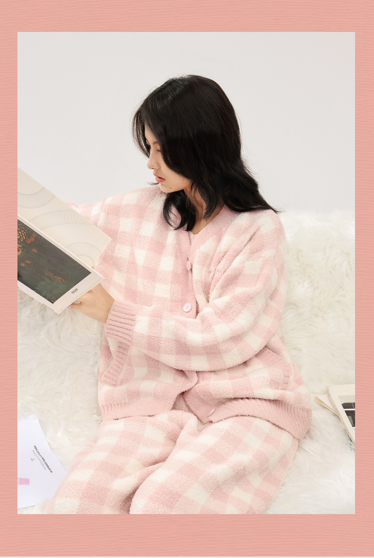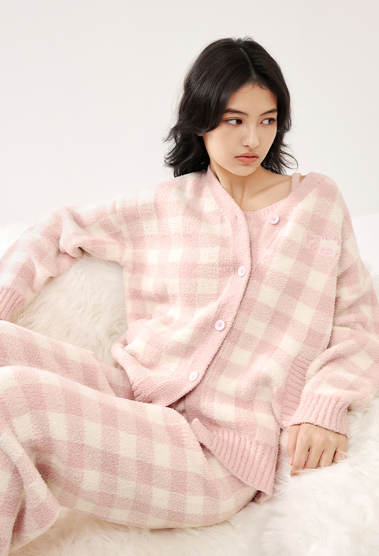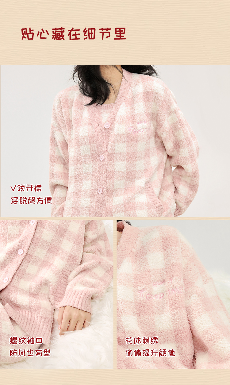 奶糖派奇趣乐园系列棋格纹开襟睡衣三件套舒适亲肤保暖秋冬家居服