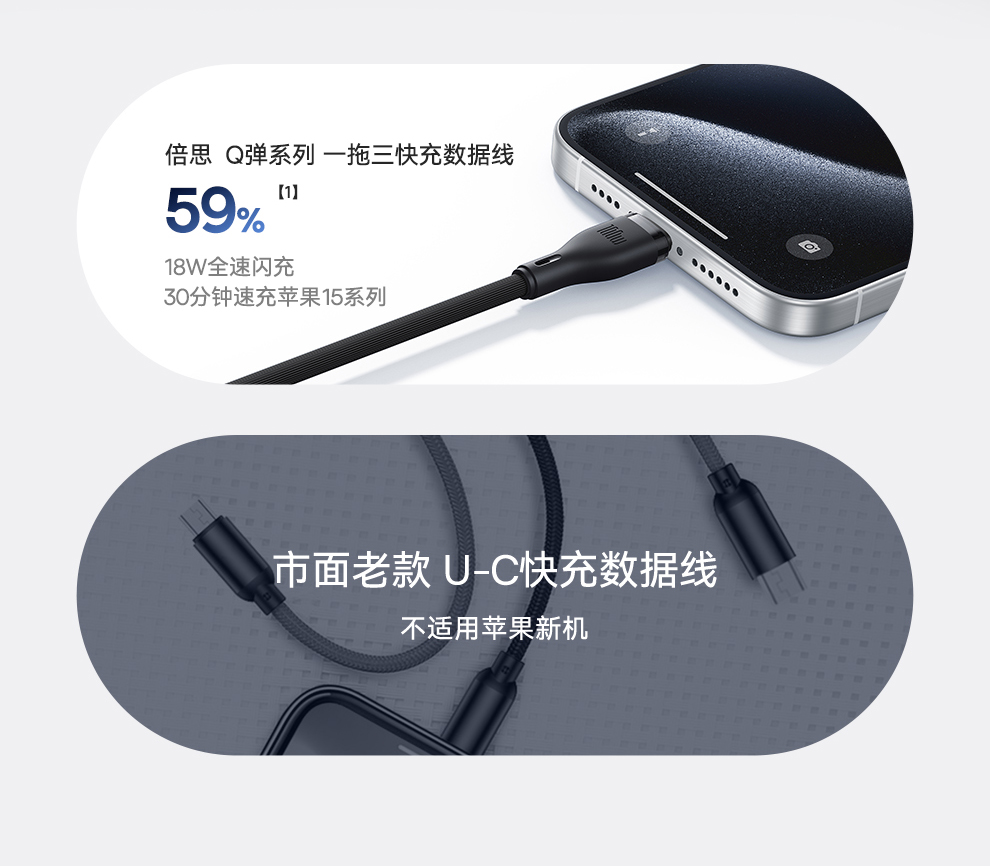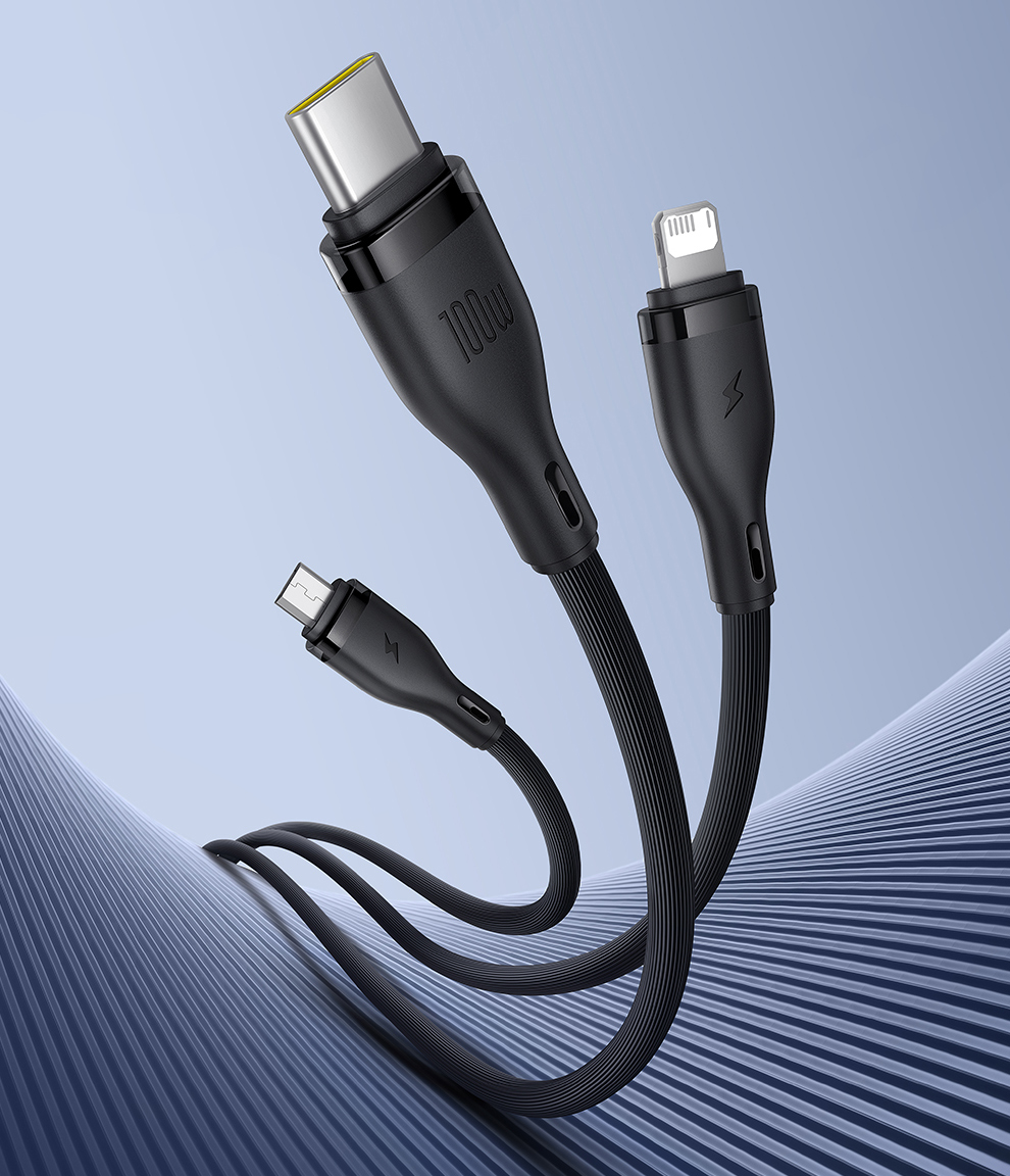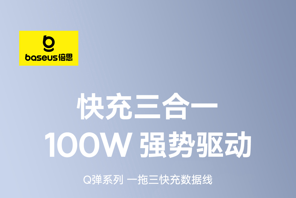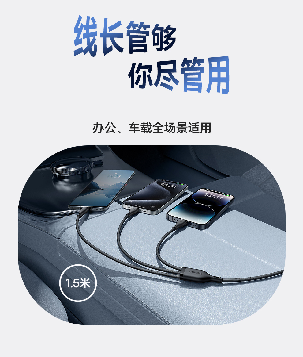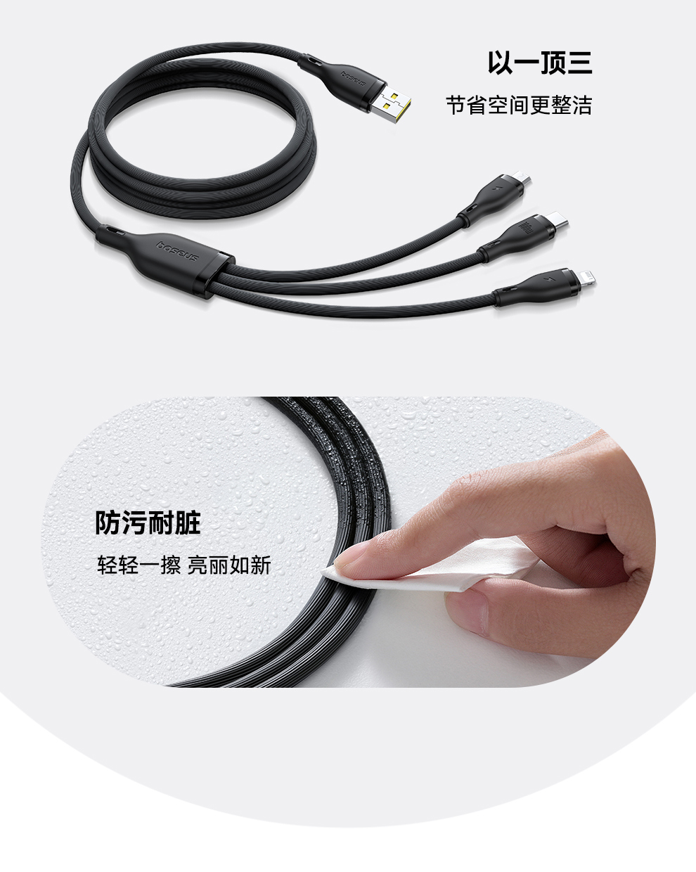 倍思简装 Q弹系列 一拖三快充数据线 USB to M+L+C 100W 1.5m