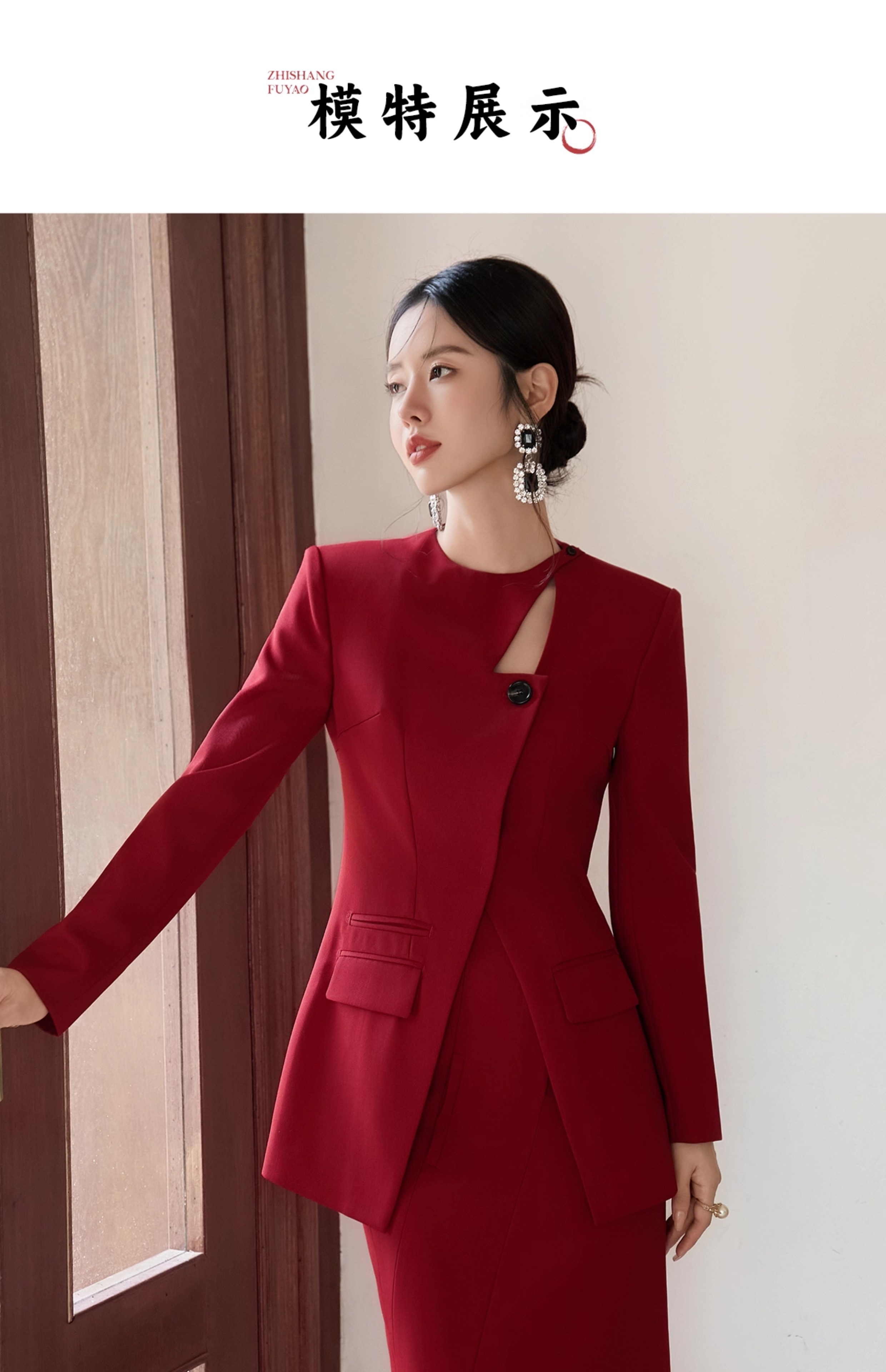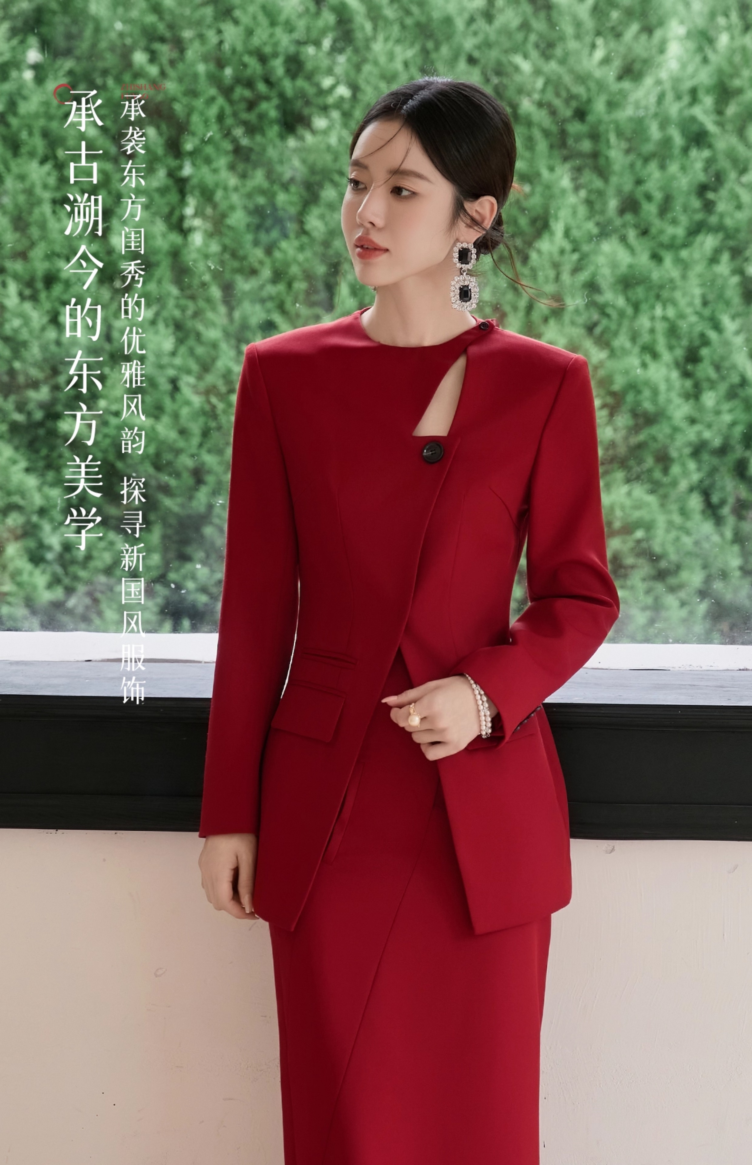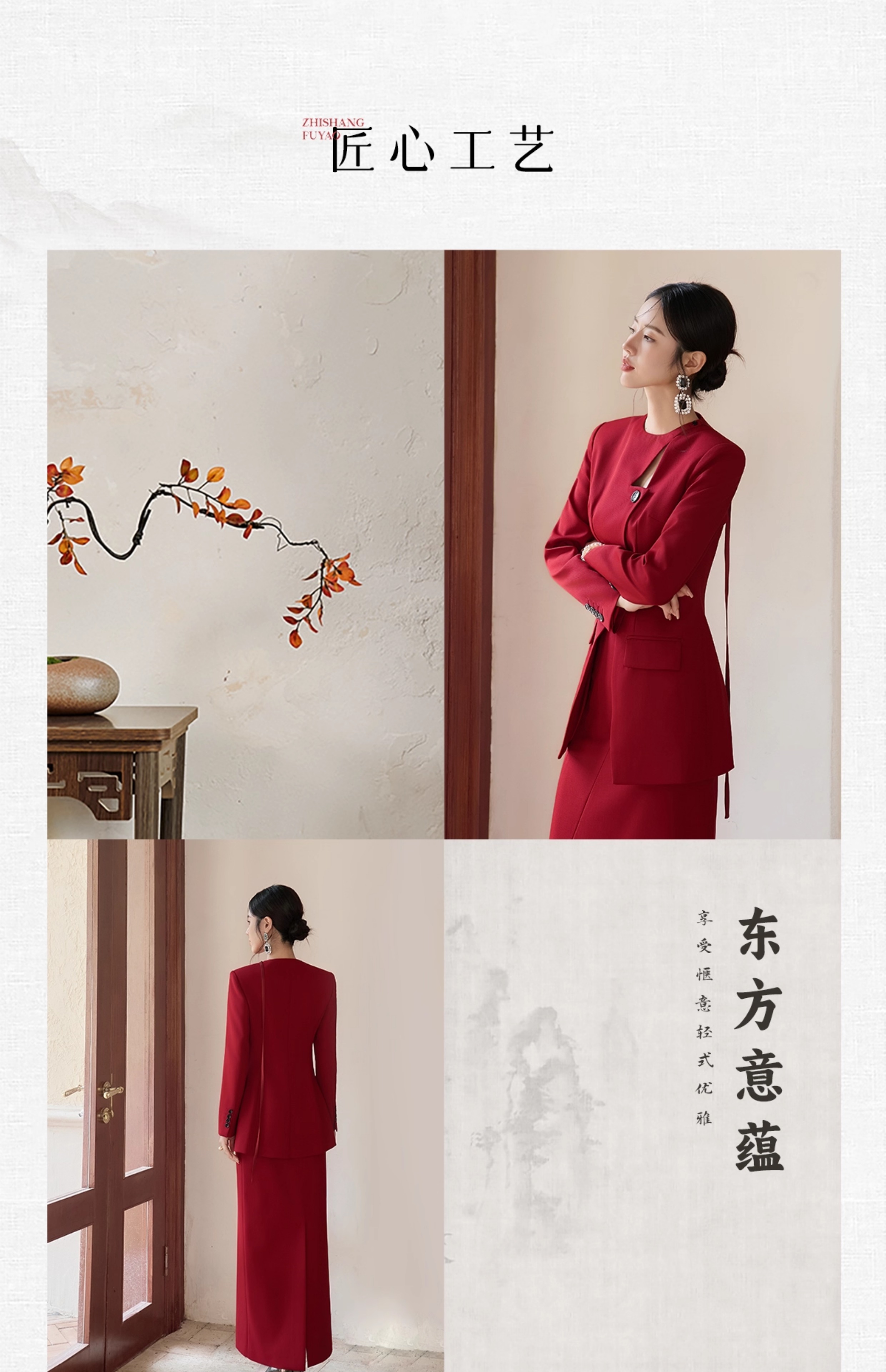 FUYAO扶摇 新中式红色西装两件套女秋冬羊毛西服复古国风时尚套装