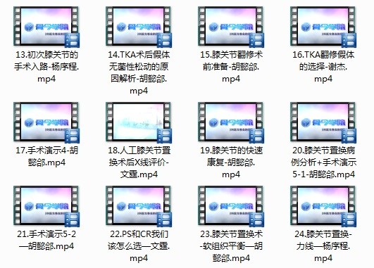 本U盘视频完全源自授课内容胡懿郃细节决定成败膝关节进阶研修班,共有34个相关视频可供关节外科医生、外科医师和研究生学习。清晰的学术大餐,将给您身临其境的绝佳感受。
