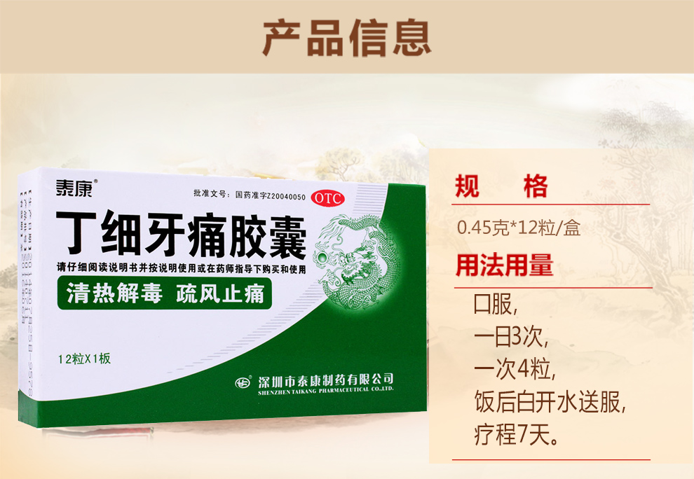 泰康 丁细牙痛胶囊0.45g*12粒/盒清热解毒止痛牙痛牙髓炎牙龈肿胀