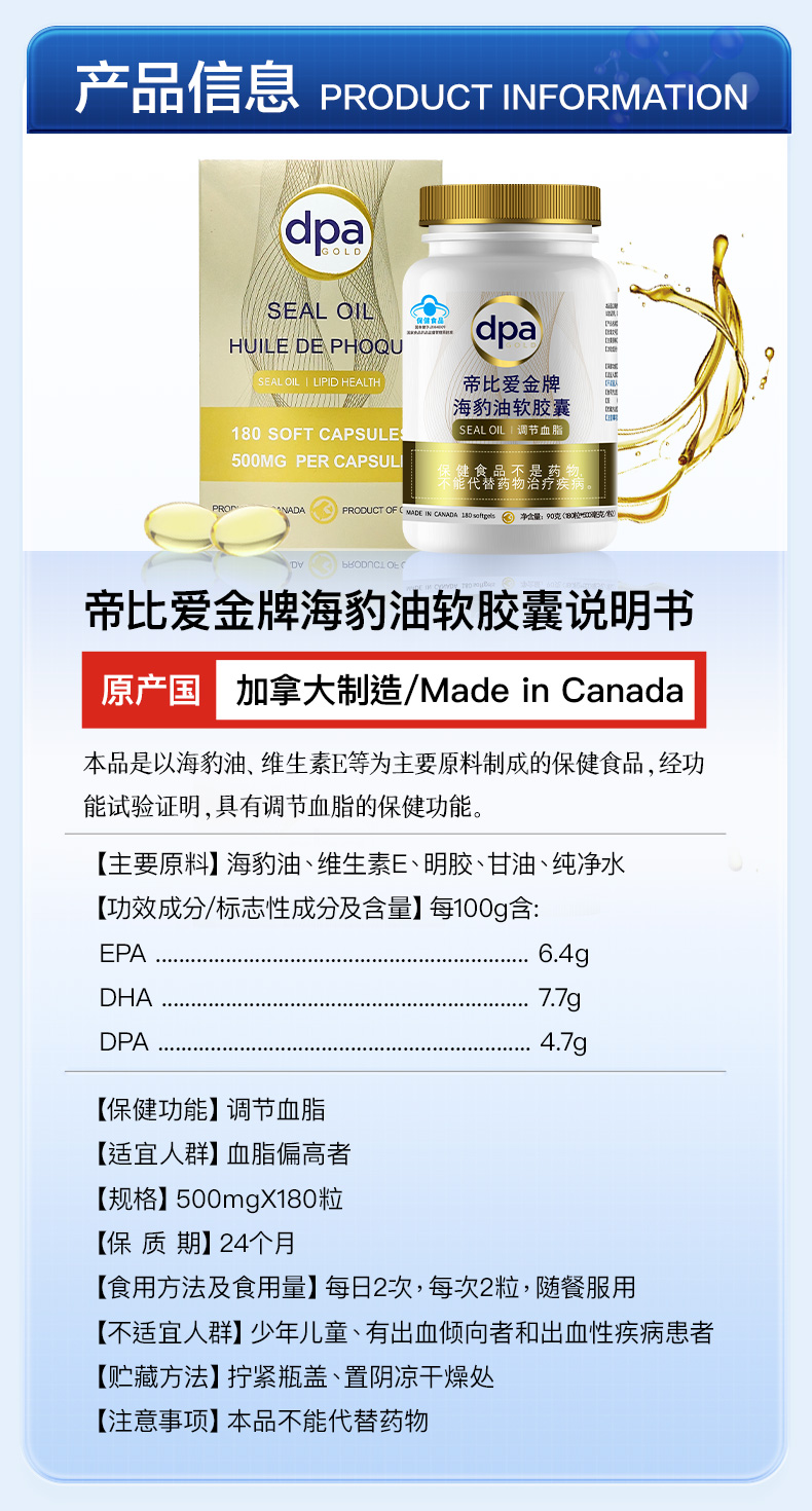 DPA帝比爱海豹油软胶囊500mg*180粒/瓶