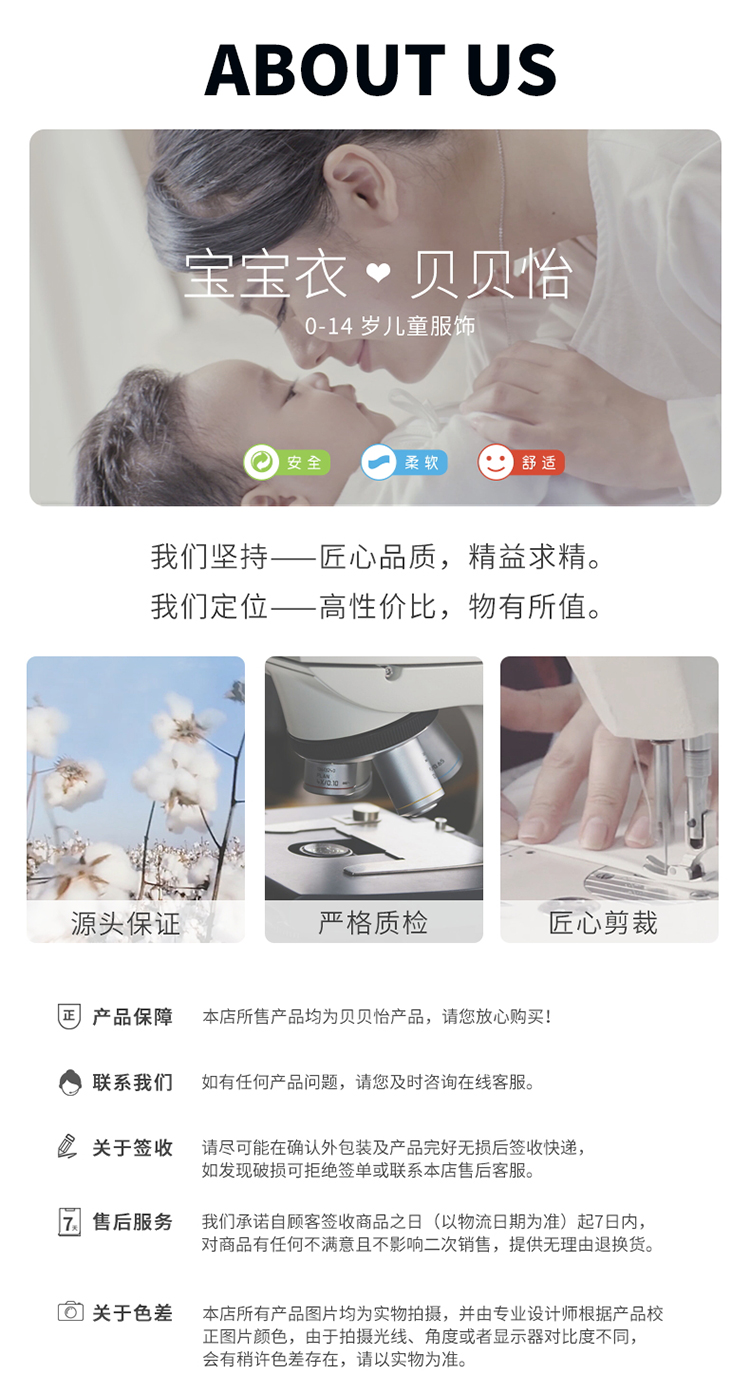 - 贝贝怡专注0-6岁婴幼儿服饰,坚持安全、柔软、舒适的产品理念,为千万中国家庭提供超高品质、安全可靠的婴幼儿服饰产品,妈妈放心,宝宝开心!