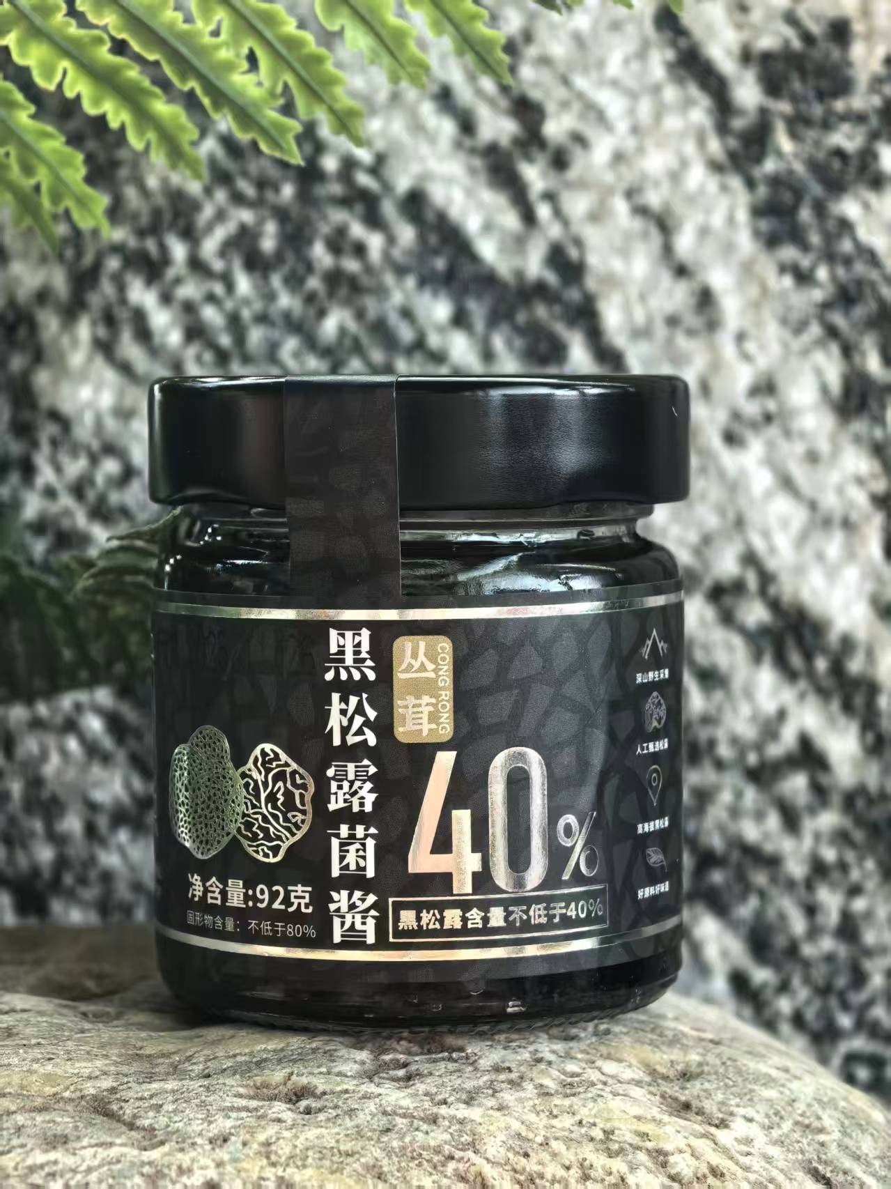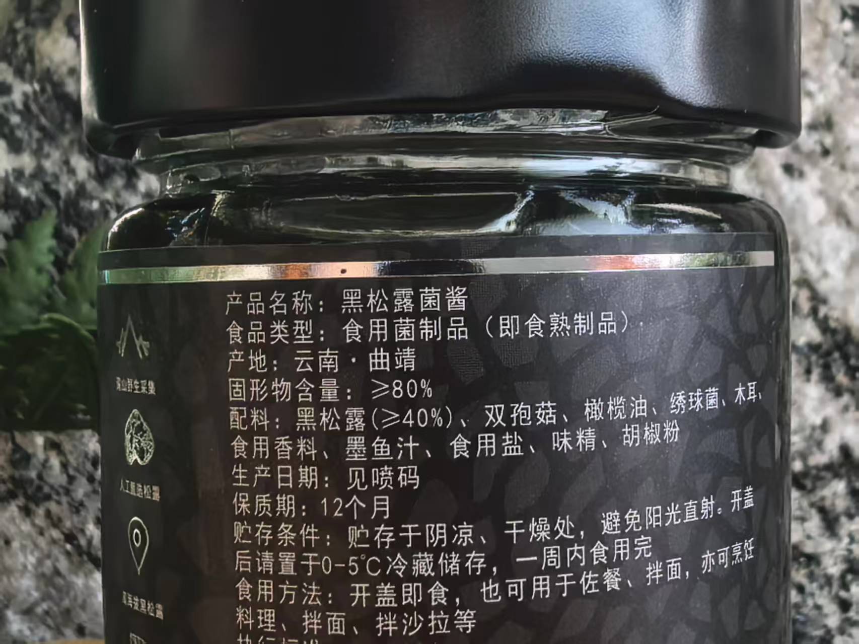 【配料】黑松露(>40%)、双孢菇、橄榄食用植物调和油、绣球菌、木耳、食用香料、墨鱼汁、食用盐、味精、胡椒粉