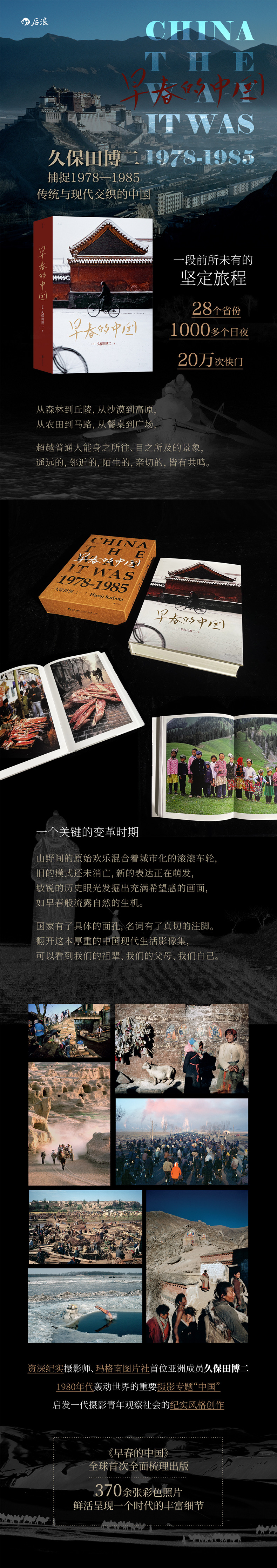 1978至1985年期间,日本摄影师久保田博二花了1000多天,几乎走遍了中国全部省份,拍摄了超过20万张彩色照片。他敏锐的政治学眼光注意到中国正处在一段历史的起点。他来到中国,和老百姓一起住人民公社、上旱厕、坐牛车,不动声色地观察中国的方方面面,用镜头记录中国人的衣着、饮食、工作、旅行、娱乐。他同时捕捉到深刻的传统元素和新的表达方式。《早春的中国》从久保田博二的海量底片中挑选出370多张照片,既有广泛传播的经典作品,也有大量首次披露的精彩画面,为读者呈现一个如早春般萌发新生的中国。