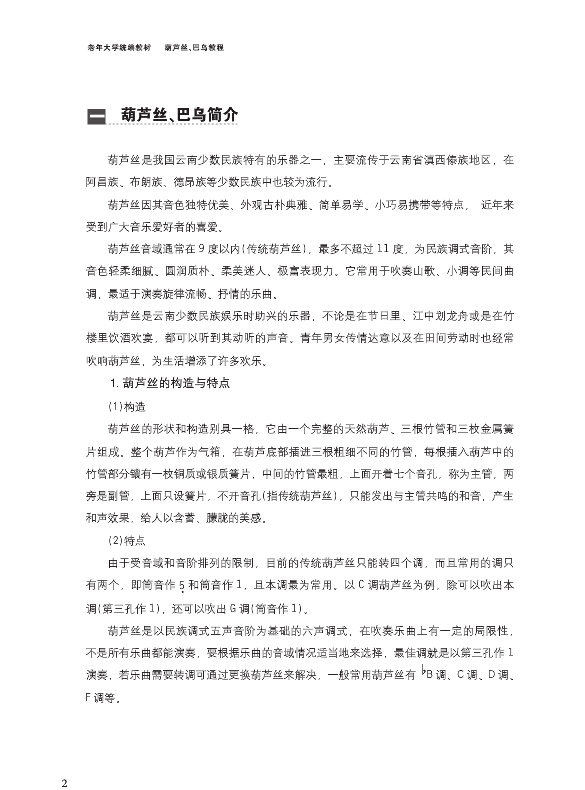 《葫芦丝、巴乌教程》选用了一些中老年朋友喜闻乐见和较熟悉的歌曲、乐曲来提高学习兴趣,部分练习曲与乐曲标注了简单的文字说明和练习要求等,以增强学习效果。本教程内容由简至繁、由浅到深、循序渐进,既满足内容的丰富性,又力求形式的多样性,尤其在增强练习曲练习价值的同时,追求其可听性与实用性。力求让学习者在获取练习曲技术效益的同时,也能得到艺术上的熏陶和享受,把学习变成一个自我享受的过程。