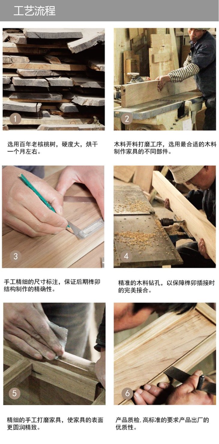 核桃木家具造型和做工多仿作宫廷气派,用料厚重大度,形体庄重稳固,大件家具居多,不惜雕磨功夫,擅长彩绘金漆和铜活饰件;尤其是晋中和晋南的高档核桃木家具,常常仿作石雕工艺,所做的床榻、几案和柜格等宽大厚实,工艺精细、华贵,髹漆、上光后颇有紫檀家具的味道。