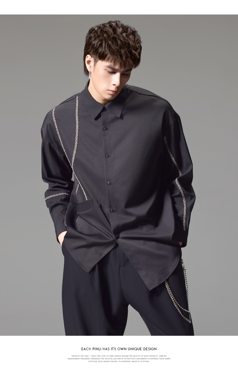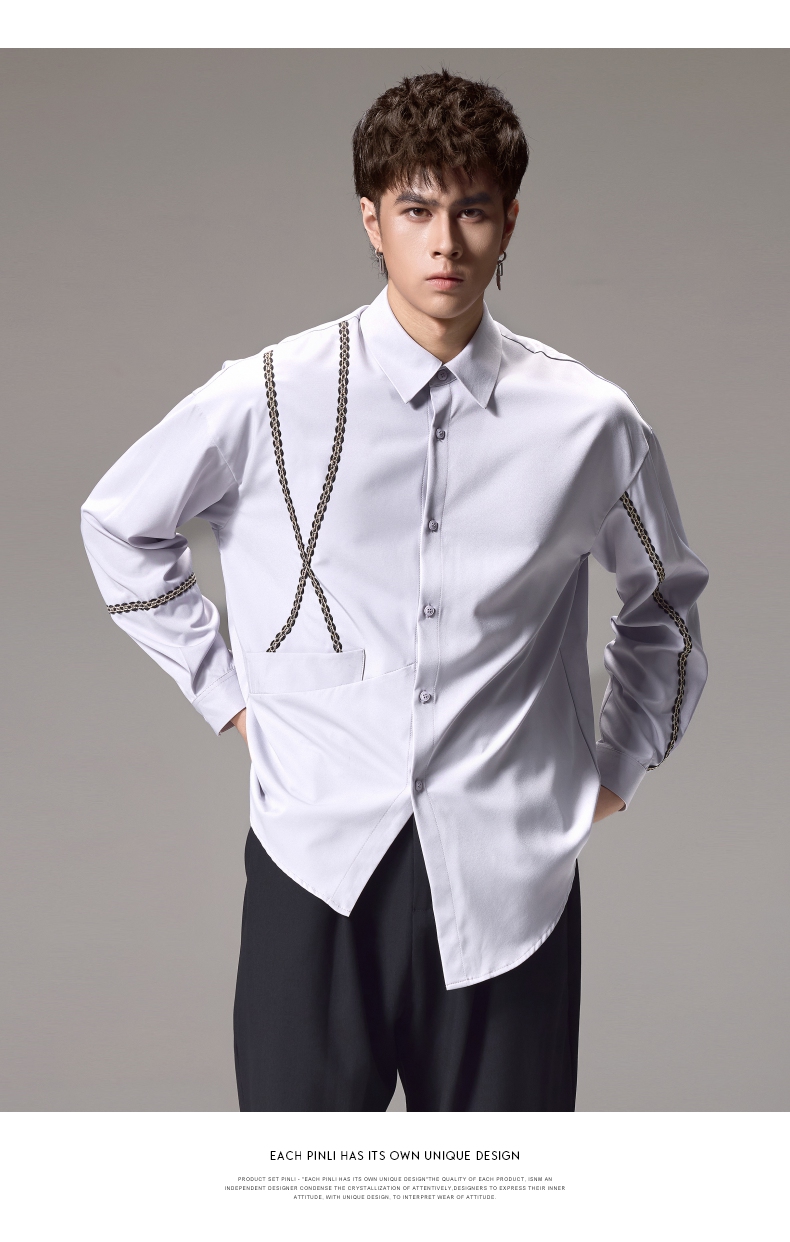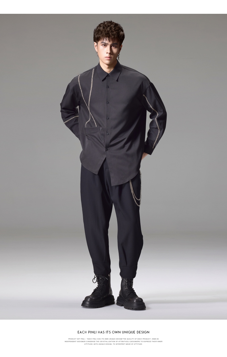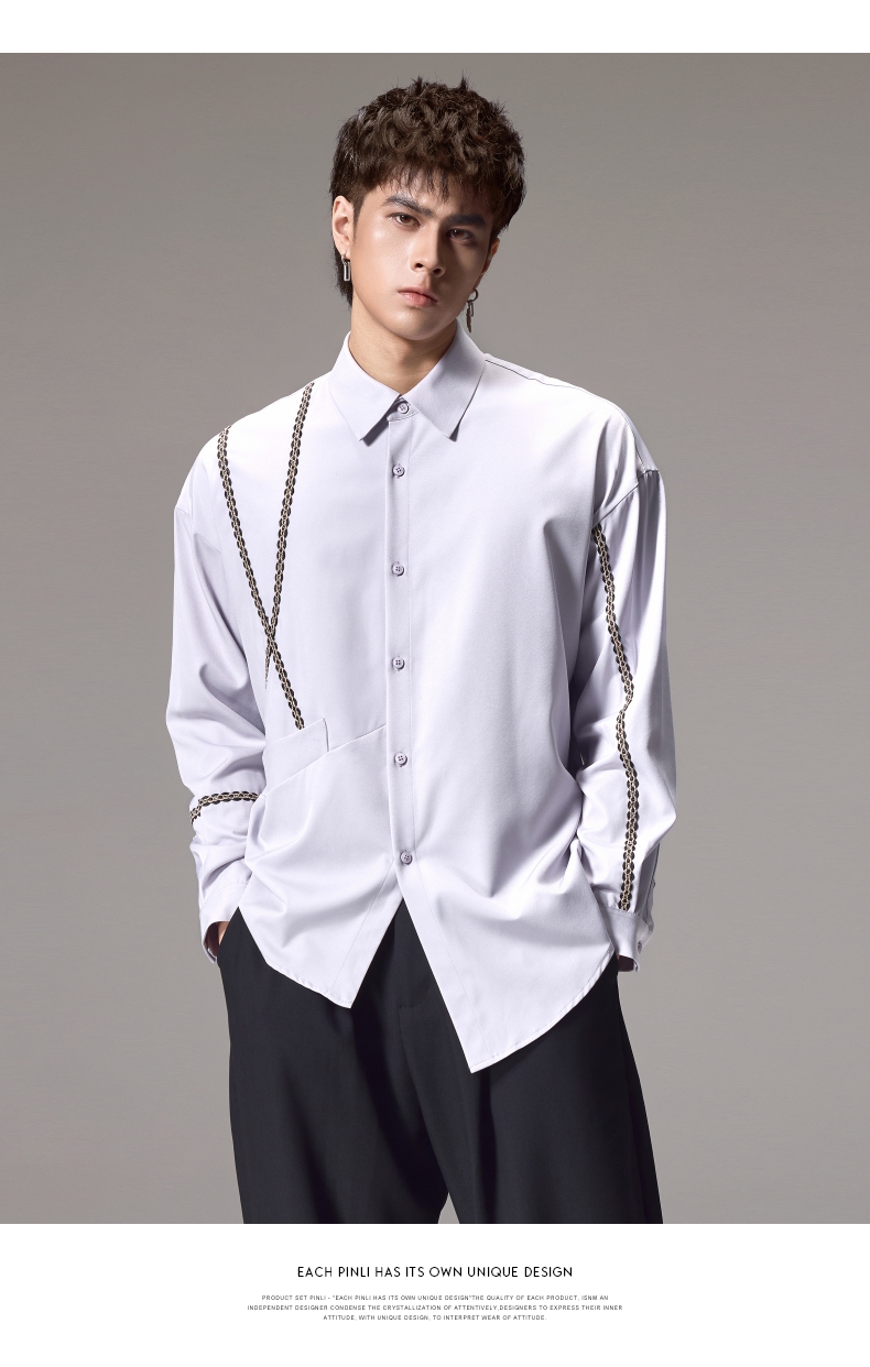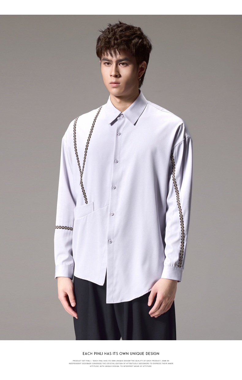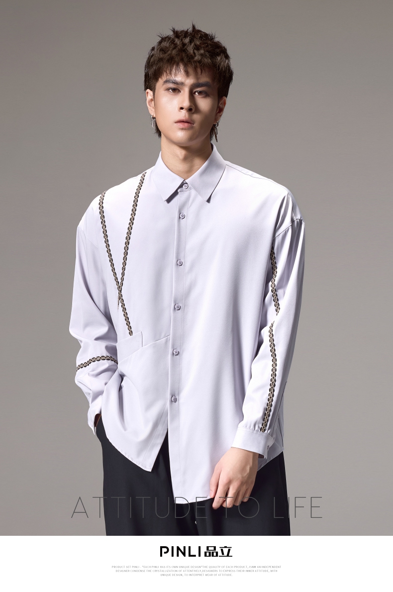 PINLI品立2024秋季新款锁链织带长袖衬衫男士不规则宽松休闲衬衣B243113011