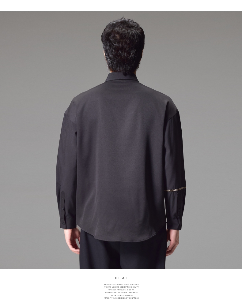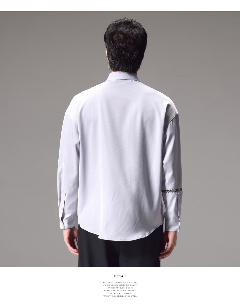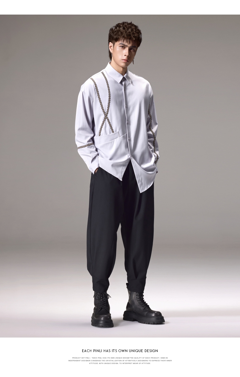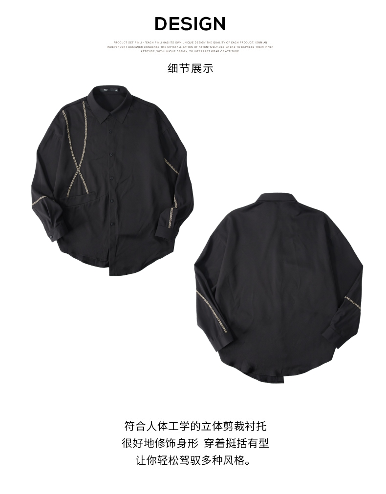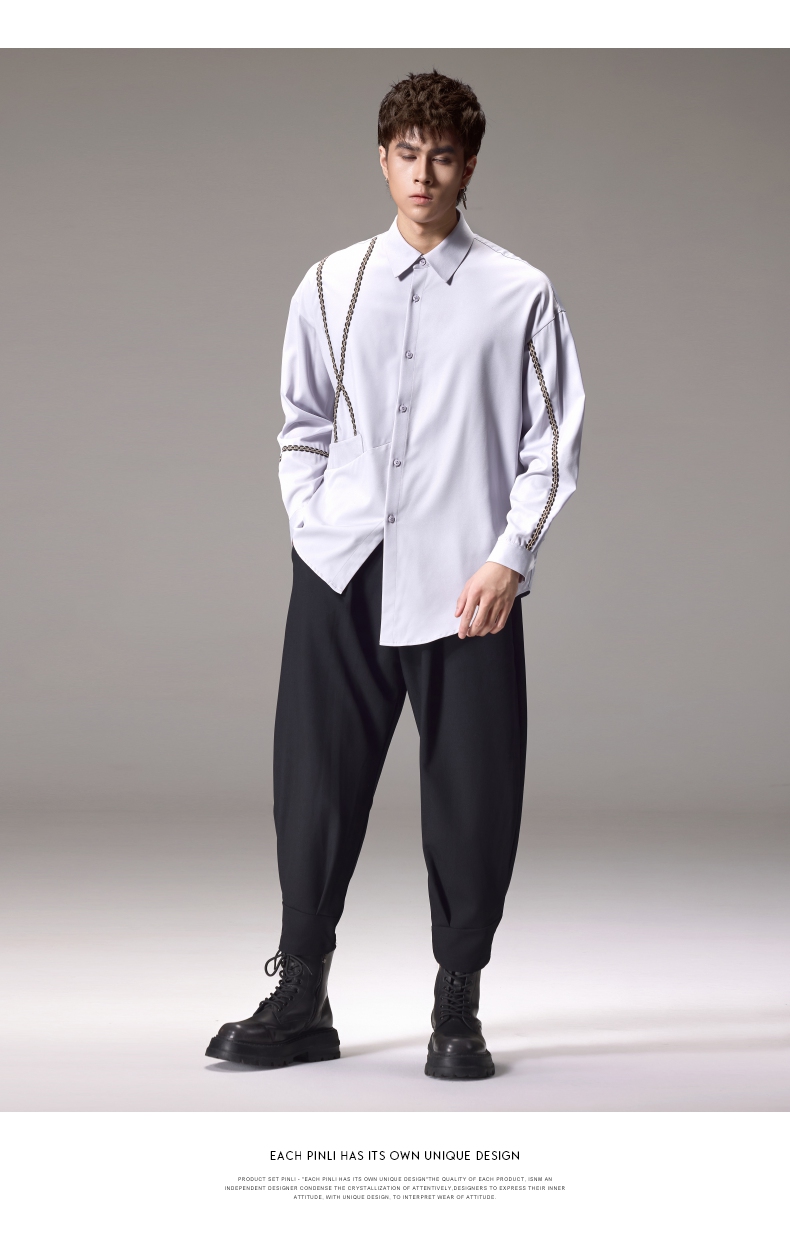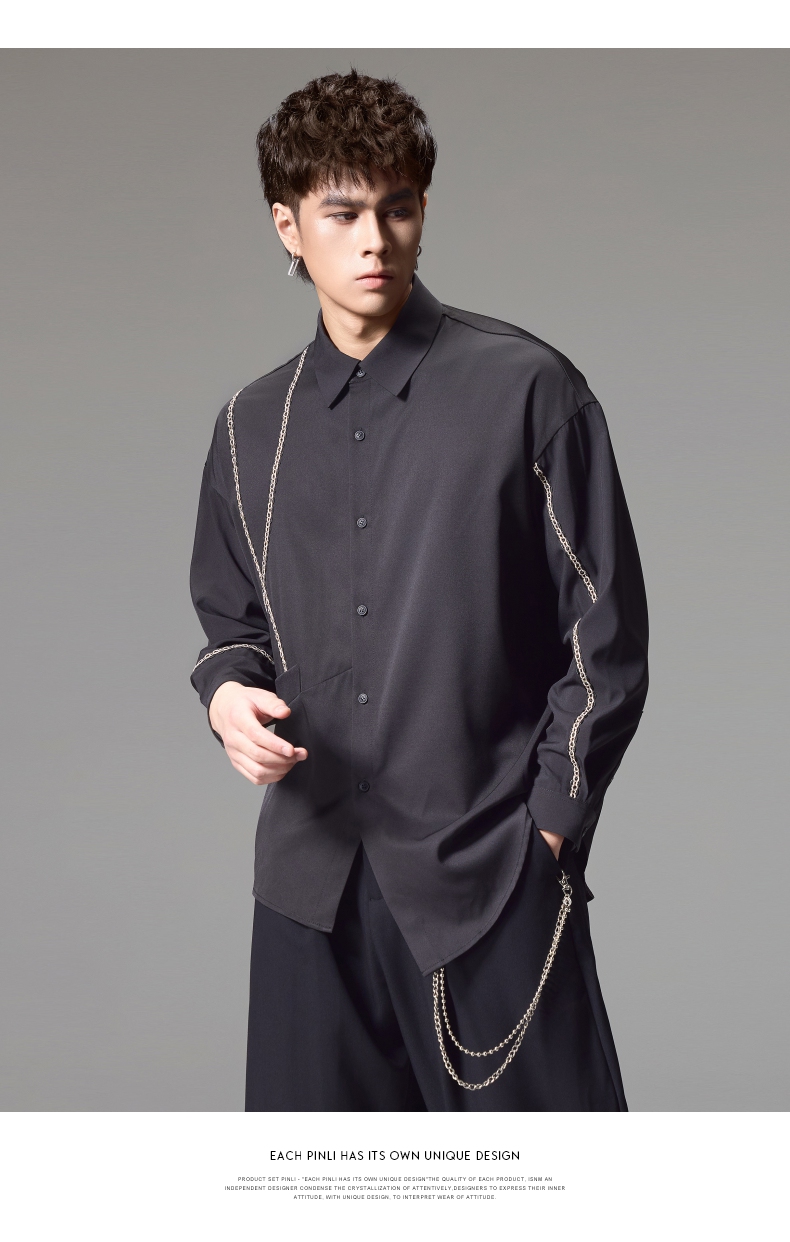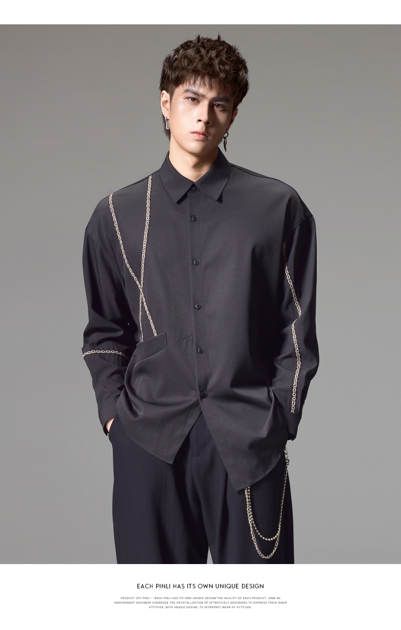 PINLI品立2024秋季新款锁链织带长袖衬衫男士不规则宽松休闲衬衣B243113011