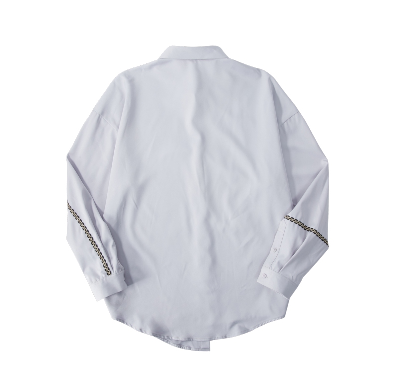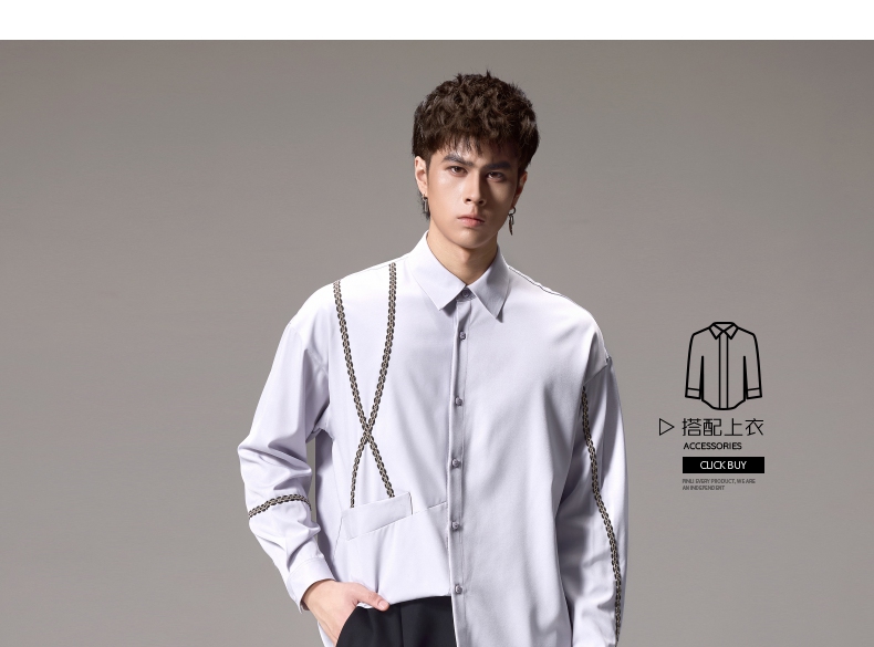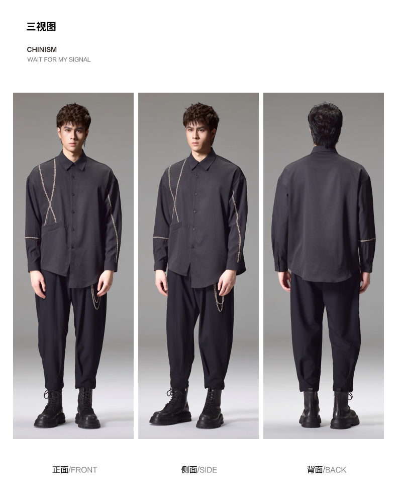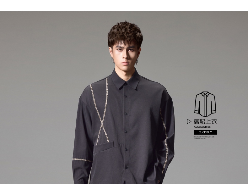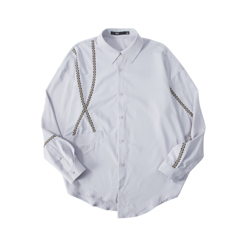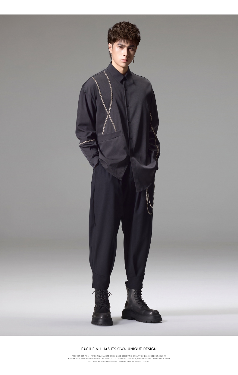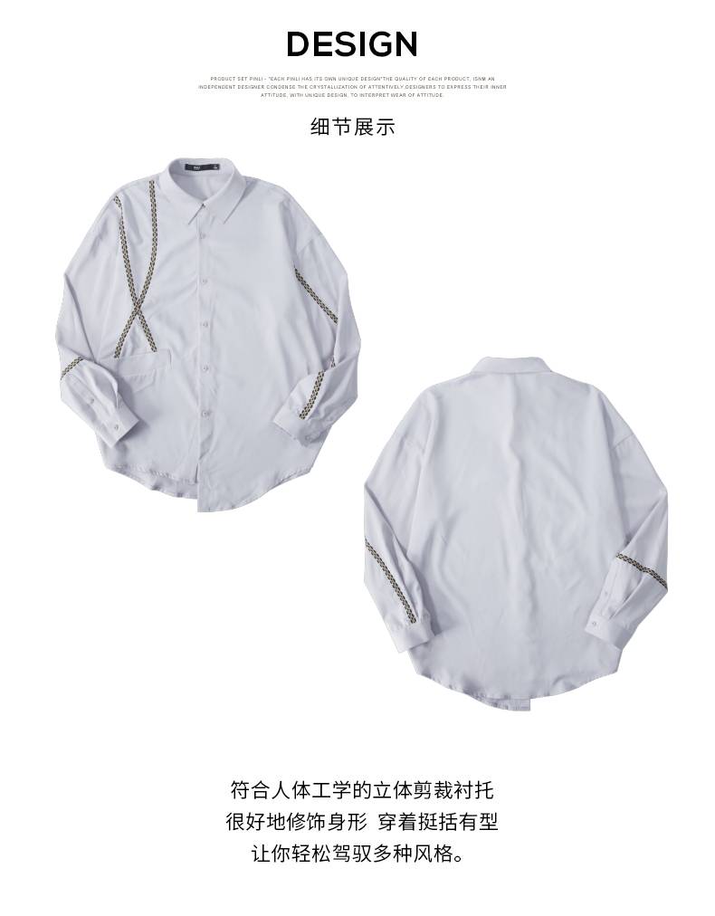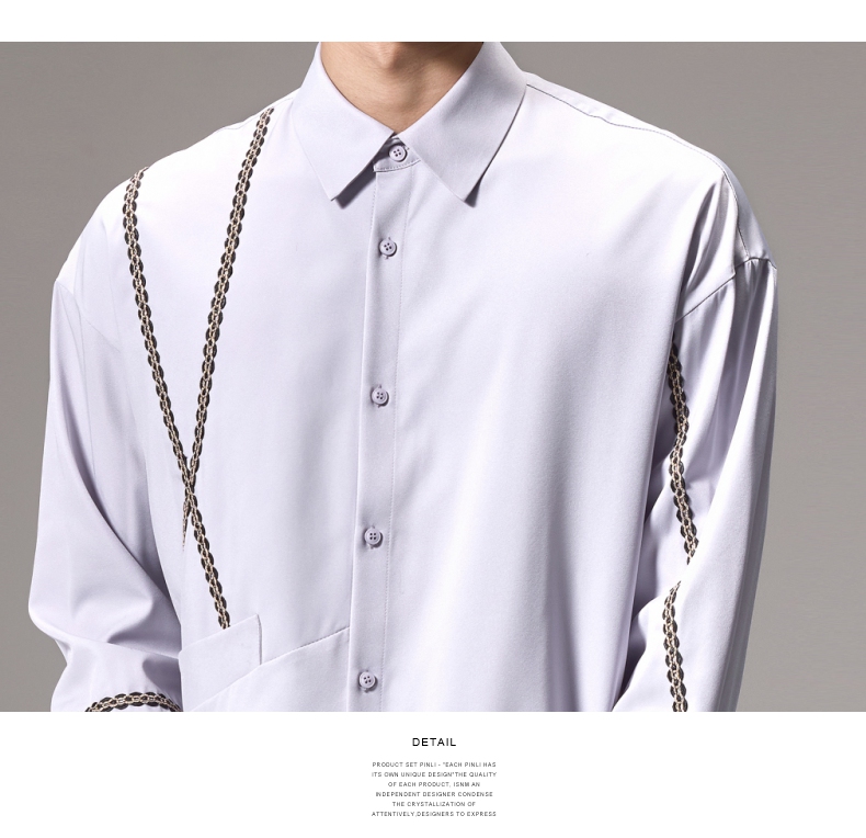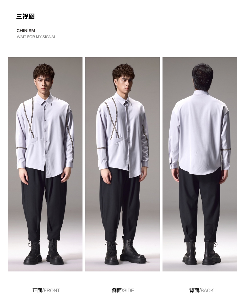 PINLI品立2024秋季新款锁链织带长袖衬衫男士不规则宽松休闲衬衣B243113011