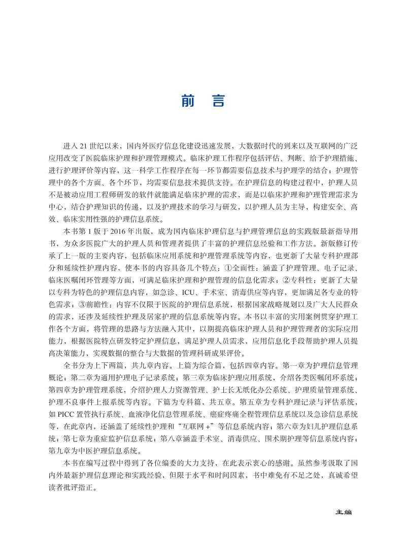 全书分为上下两篇,共九章内容。上篇为综合篇,包括四章内容。第一章为护理信息管理概论;第二章为通用护理电子记录系统;第三章为临床护理应用系统,介绍各类医嘱闭环系统;第四章为护理管理系统,介绍护理人力资源管理、护士长无纸化办公系统、护理质量管理系统、护理不良事件上报系统等内容。下篇为专科篇,共五章。第五章为专科护理记录与评估系统,如PICC置管执行系统、血液净化信息管理系统、癌症疼痛全程管理信息系统以及急诊信息系统等,在此章内,还涵盖了延续性护理和“互联网+”等信息系统内容;第六章为妇儿护理信息系统;第七章为重症监护信息系统;第八章涵盖手术室、消毒供应、围术期护理等信息系统内容;第九章为中医护理信息系统。