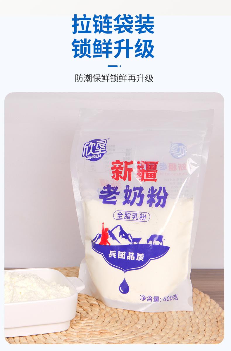欣垦奶粉,是8倍浓缩,一袋子400g,可以冲泡出4升牛奶,一般来说,2勺奶粉加一杯温开水就行,泡完口感顺滑不起块,非常还原鲜奶的味道!而且钙含量高达24%,再加上维D,有助于钙质的吸收,2岁以上的儿童、孕妇,还是中老年人群,也都能从中获得充足的营养支持。我很喜欢它的包装,简单朴实,不额外增加成本,认认真真做奶粉,兵团品质,不搞虚的,自己家人喝喝,实在是很划算!