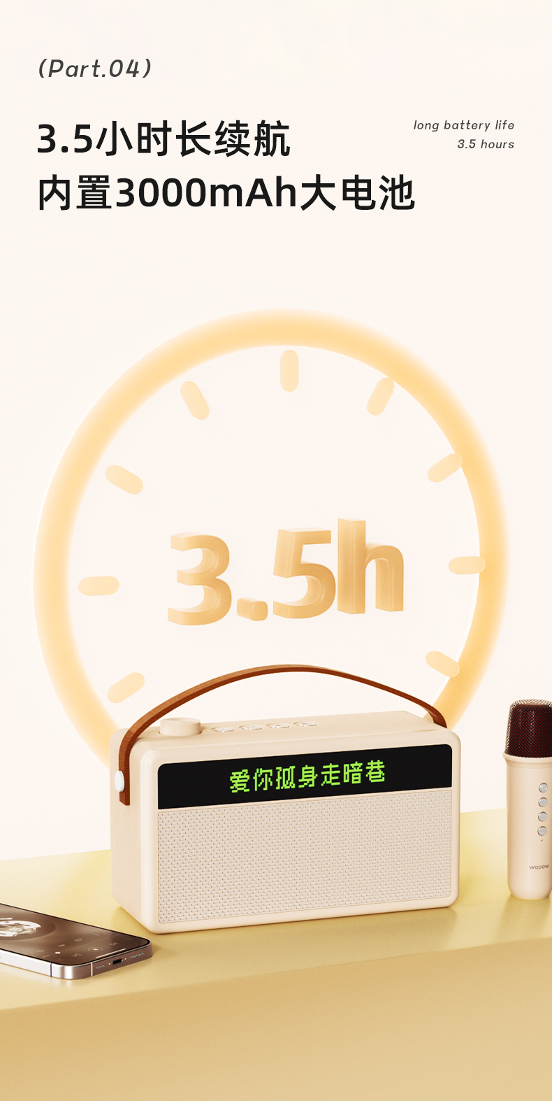 沃品便携K歌蓝牙音箱,来头可不小,是国民品牌的深度合作代工厂出的,没错,就是那个给华为做充电器的实力大厂,也给众多知名品牌代工电池部件,我们手里的某款设备可能就藏着它的技术哦!小音箱身材小巧,却藏着双喇叭系统和14W大功率振膜,而且还配双麦克风,闺蜜老友家人都不用抢麦了!麦克风内置DSP智能修音芯片,自动过滤杂音、优化声线,还可以一键切换原唱/伴奏模式,更有4种趣味音效:女神音、娃娃音、大叔音、怪兽音,也是聚会搞怪神器了!3000mAh大电池,续航达到3.5小时,不怕唱不尽兴!