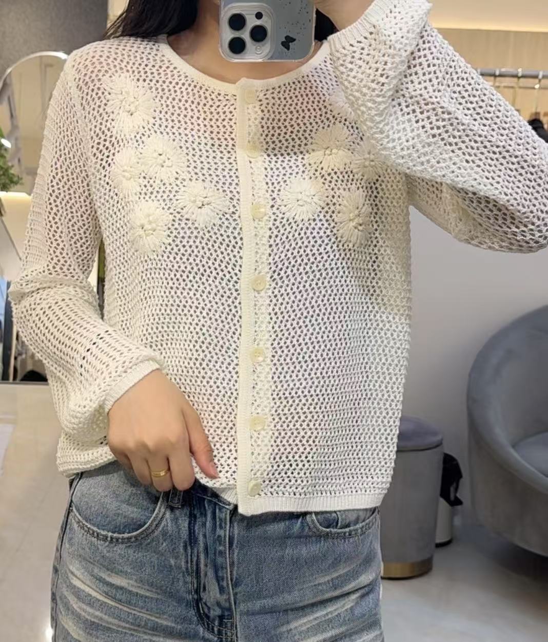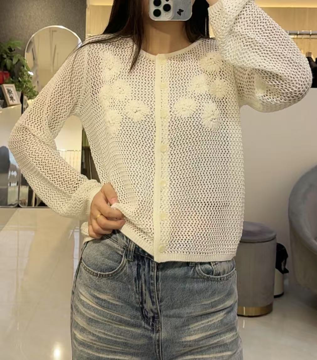 伯妮斯茵 | 复古慵懒 米白镂空针织开衫 立体花朵装饰 软糯亲肤 日常叠穿款 SZ3A62 皓色针织衫-《檖》