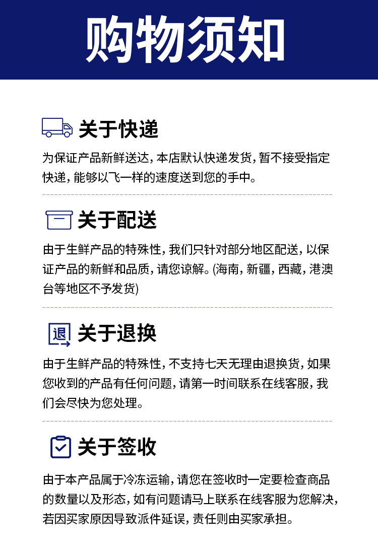 ★生鲜类,发出后不退不换,不以个人喜好、口味处理售后,不支持七天无理由退换货。