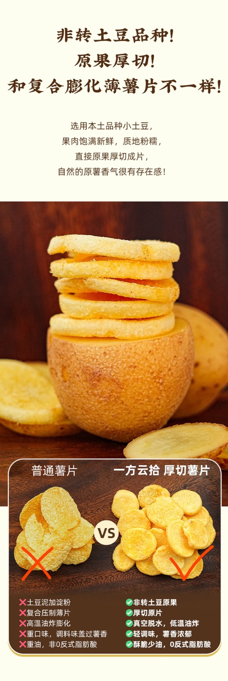 一方云拾用的是非转基因本土小土豆,果肉饱满,质地粉糯,直接原果厚切,保留最纯粹的自然薯香,再搭配上真空脱水与低温油炸的创新工艺,严格控制脱油过程,确保口感酥脆清爽,0反式脂肪酸,吃得开心!