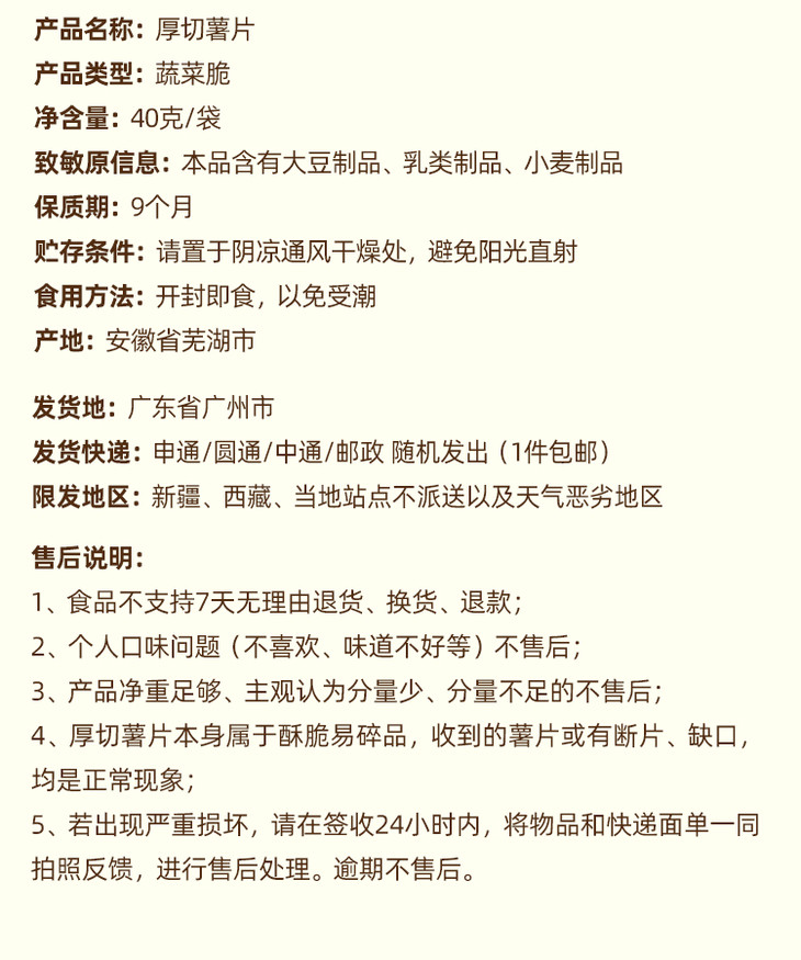 温馨小提示:食品类不支持7天无理由退货、换货或退款;厚切薯片本就属于酥脆易碎品,收到的薯片或有断片、缺口,均是正常现象;个人口味问题(不好吃、太甜、味道不好等)无法售后;若出现严重损坏,请在签收24小时内,将物品和快递面单一同拍照反馈,进行售后处理,逾期无法售后,介意慎拍。