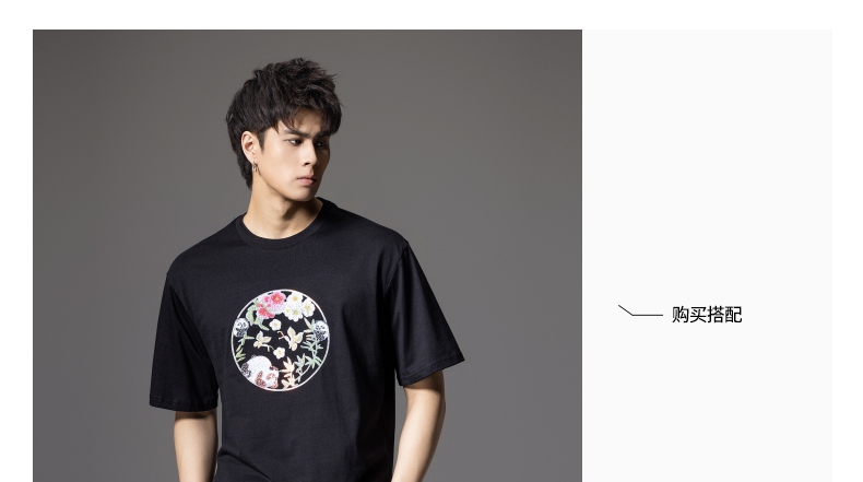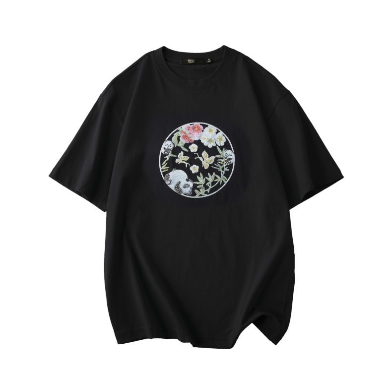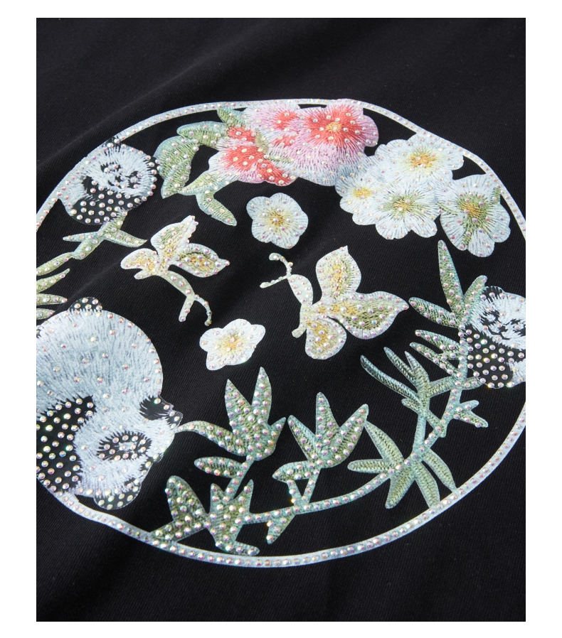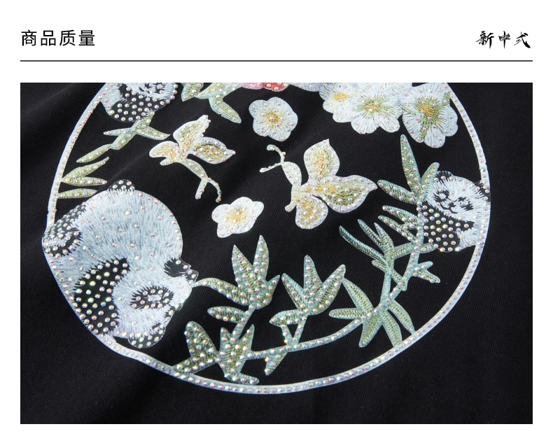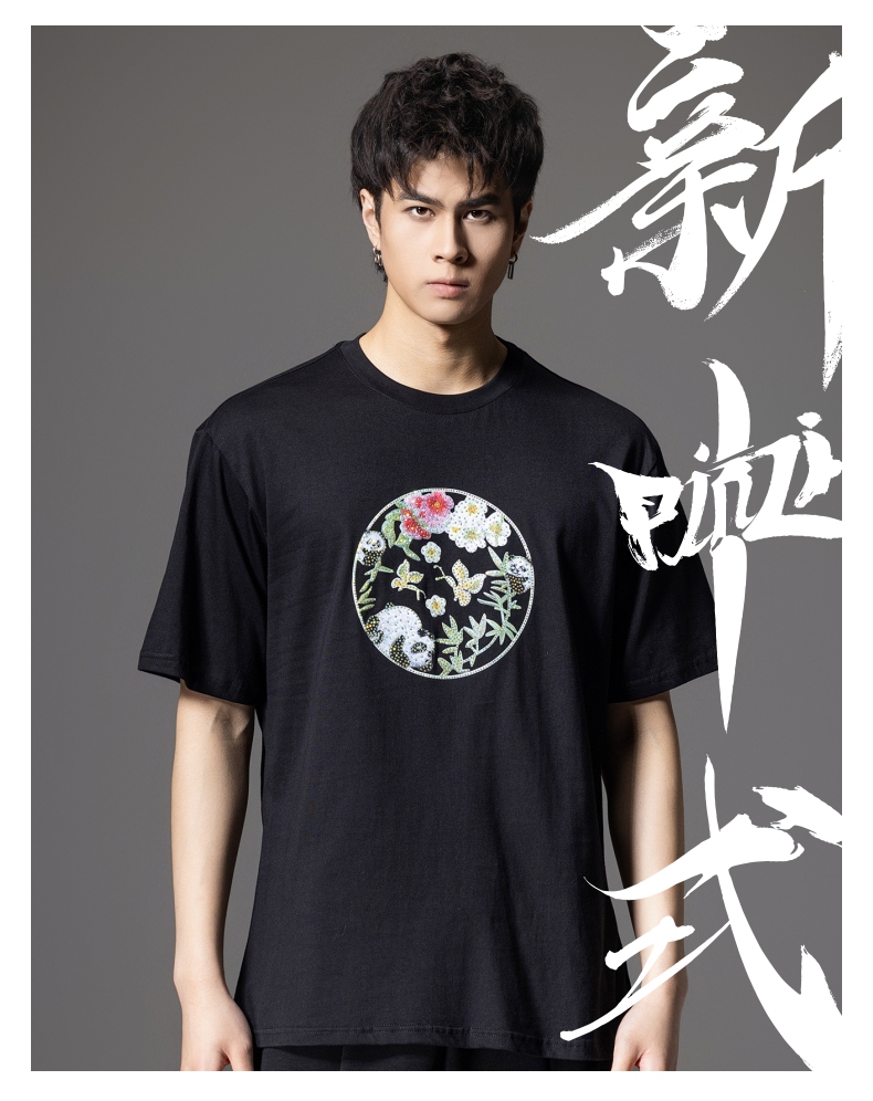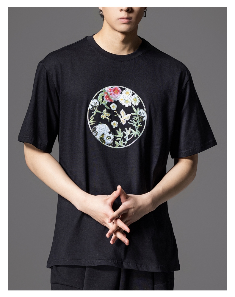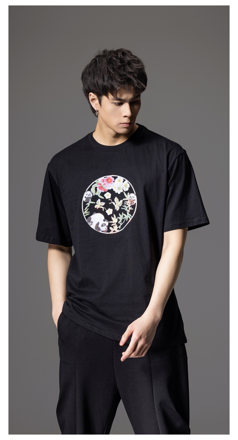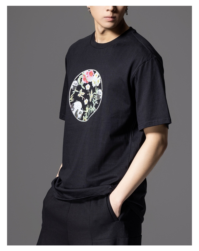 PINLI品立新中式2024夏季新款熊猫烫钻短袖T恤男士中国风休闲上衣BG242111023