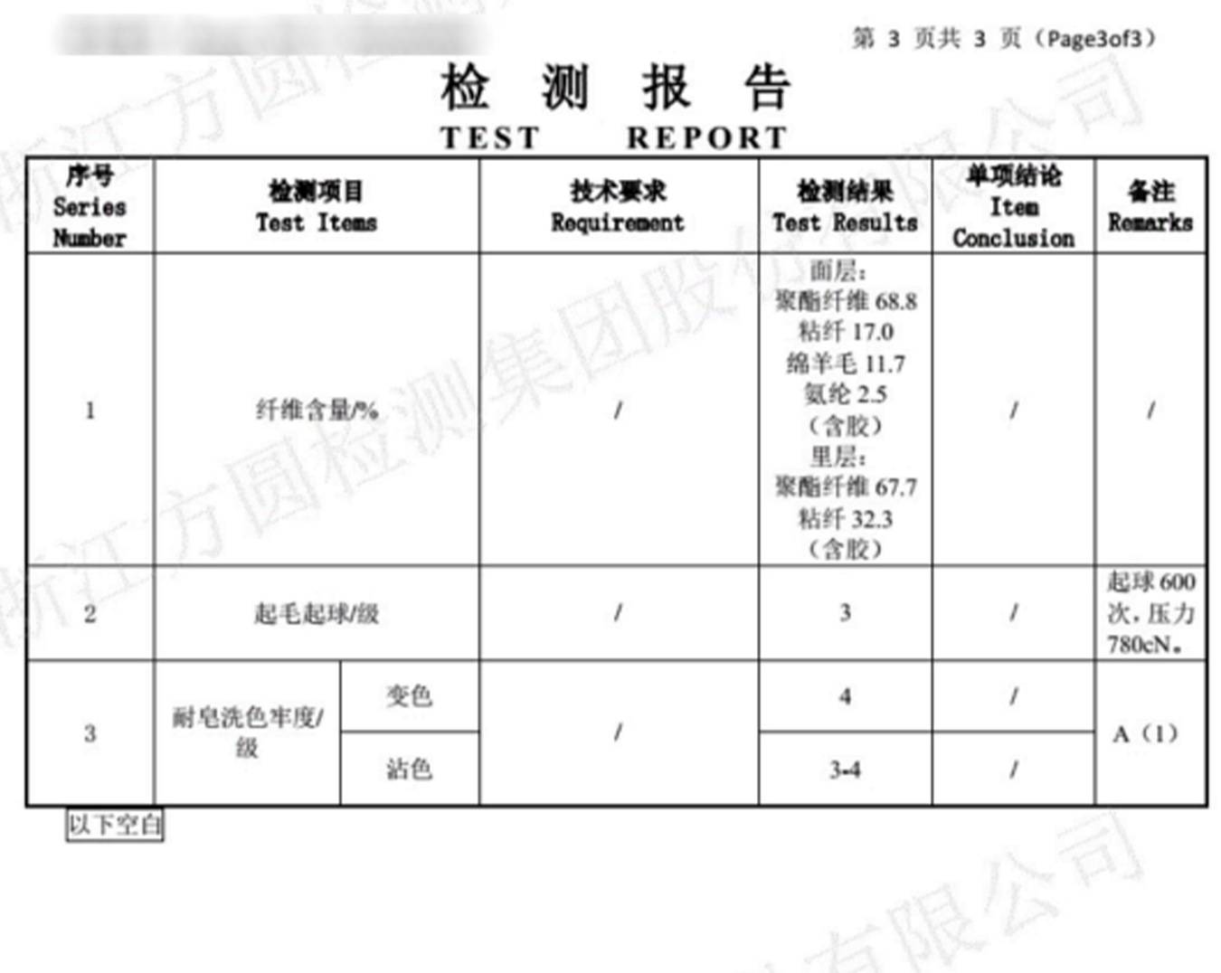 面布:68.8%聚酯纤维 17%粘胶 11.7%绵羊毛 2.5%氨纶(含胶)