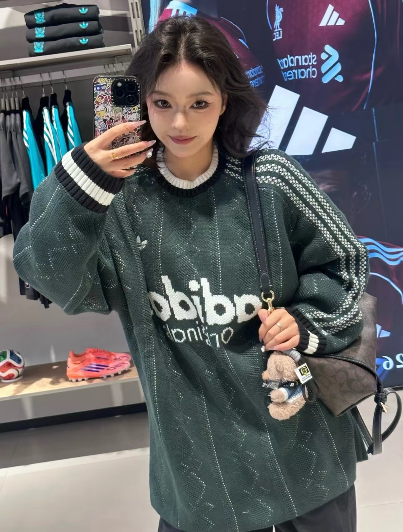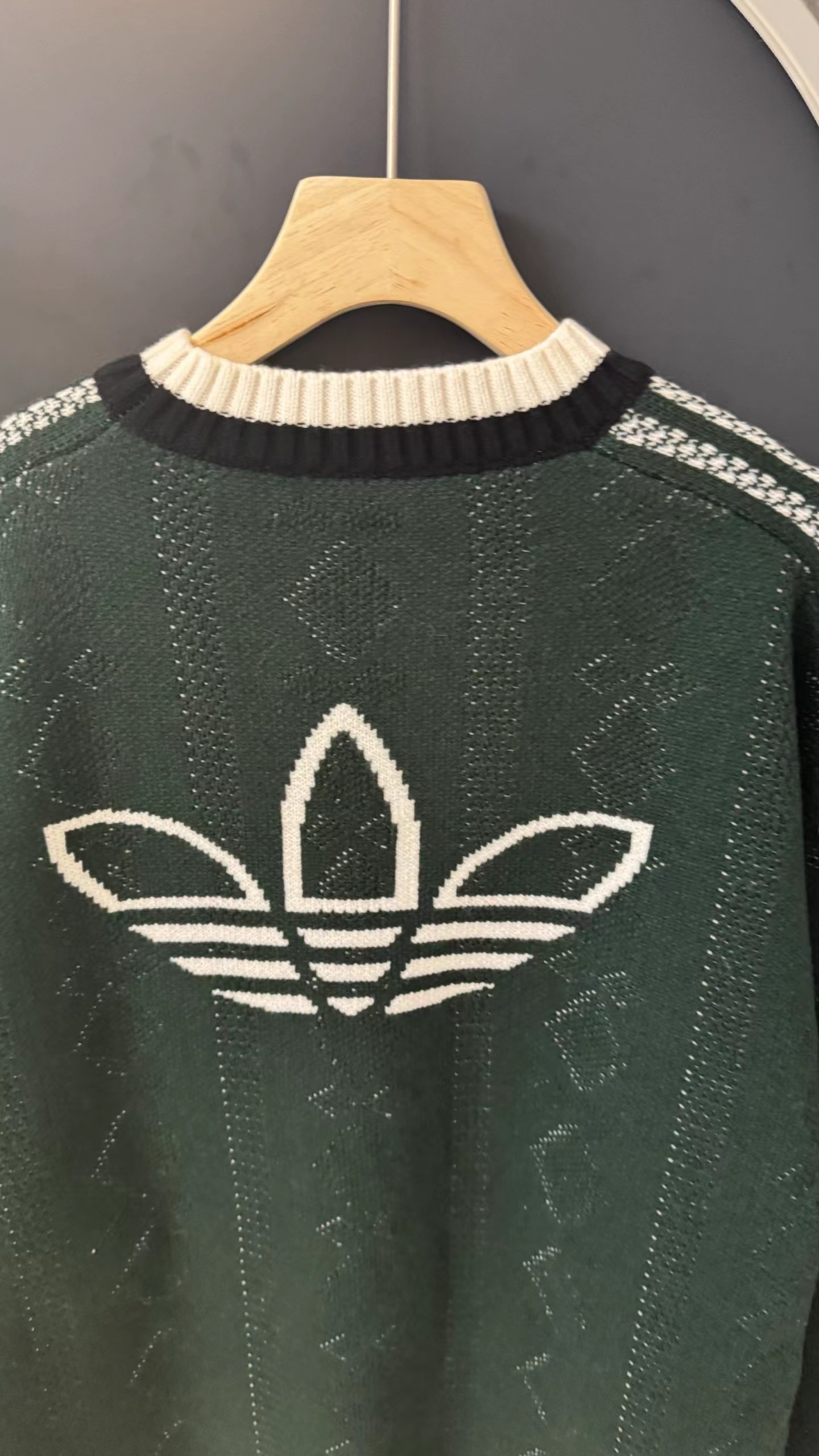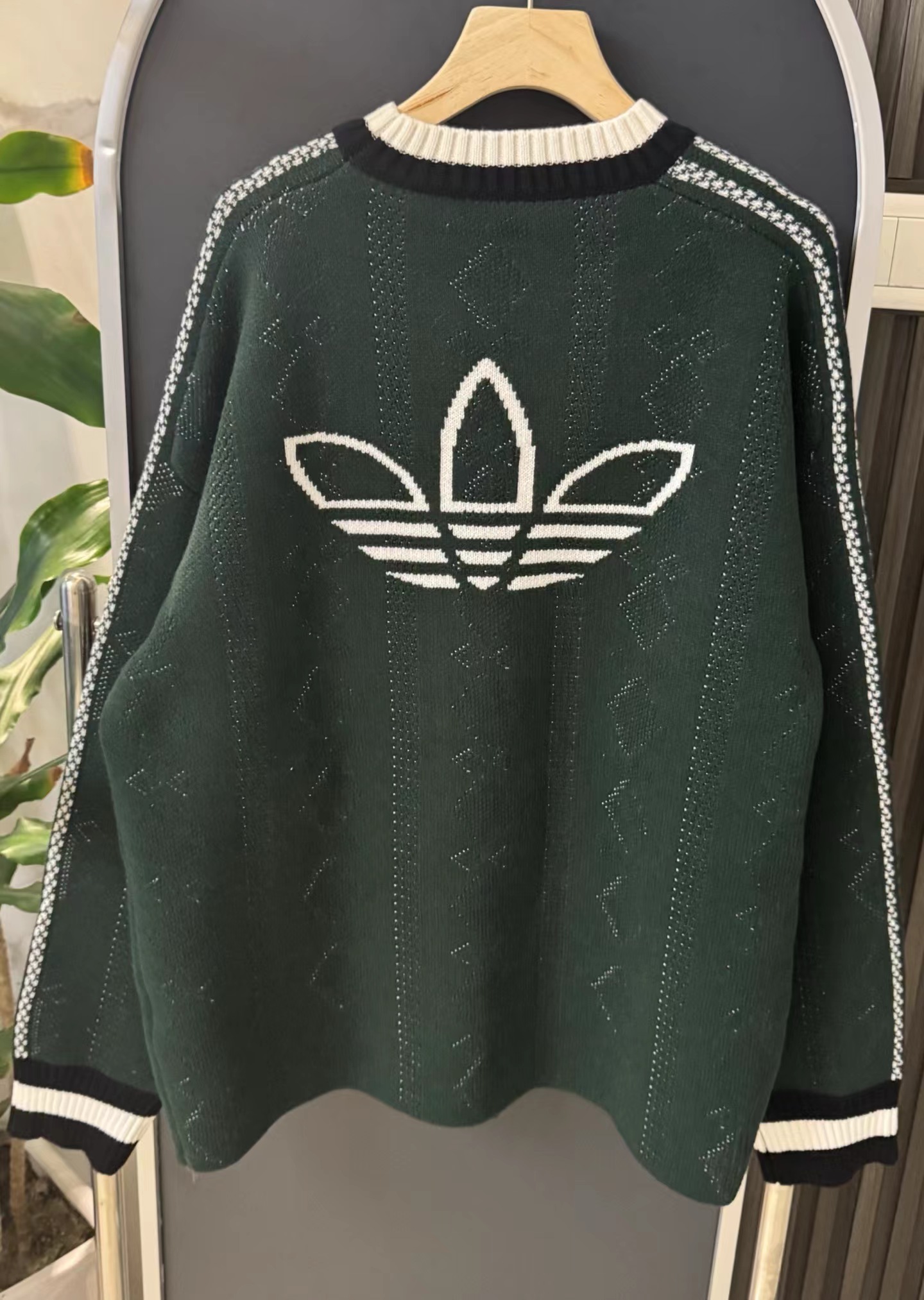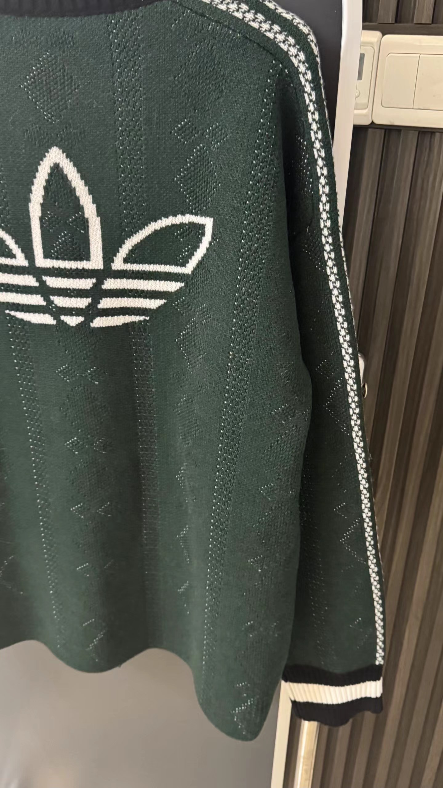 三叶草针织套头毛衣,为男女同款的宽松版型设计,撞色的领口、袖口,采用高支高密针织工艺,纹理紧实不透风,还带有类似镂空的视觉效果却无实际透风问题。正面有反向的字母提花,肩部点缀三叶草小logo,袖子延续品牌三条杠设计,且条纹为针织一体成型,不易开线。宽松剪裁显瘦,深绿色对黄皮、黑皮友好,素颜也能驾驭,属于休闲运动风格的百搭款。