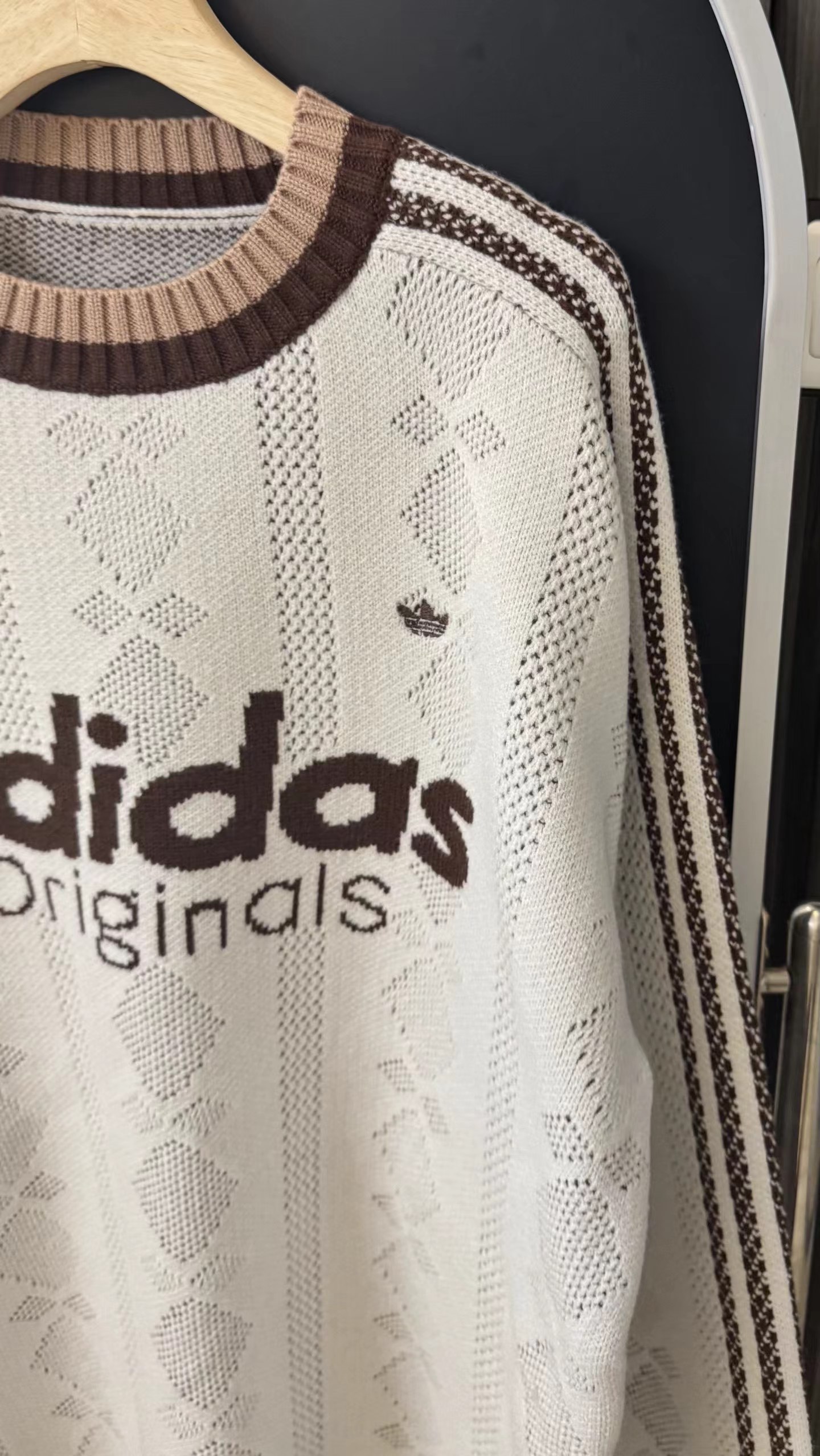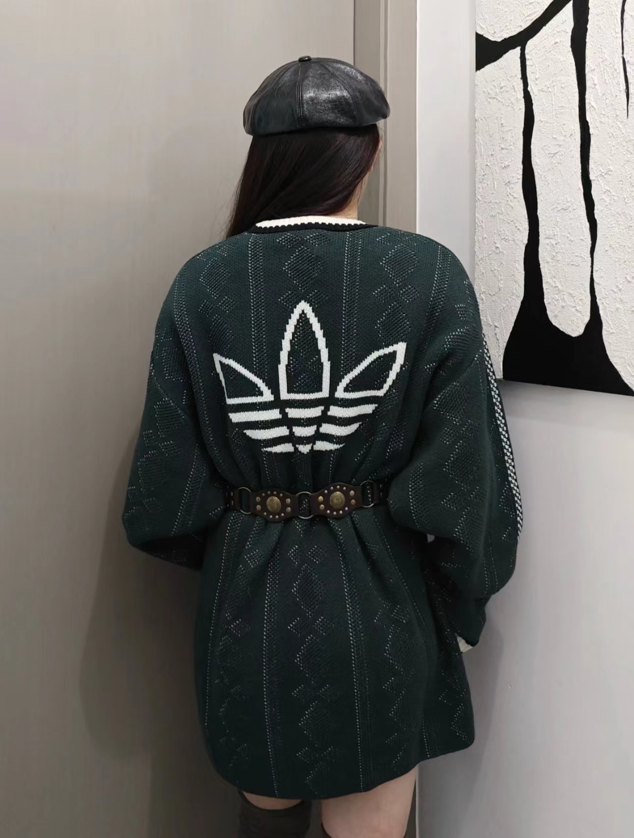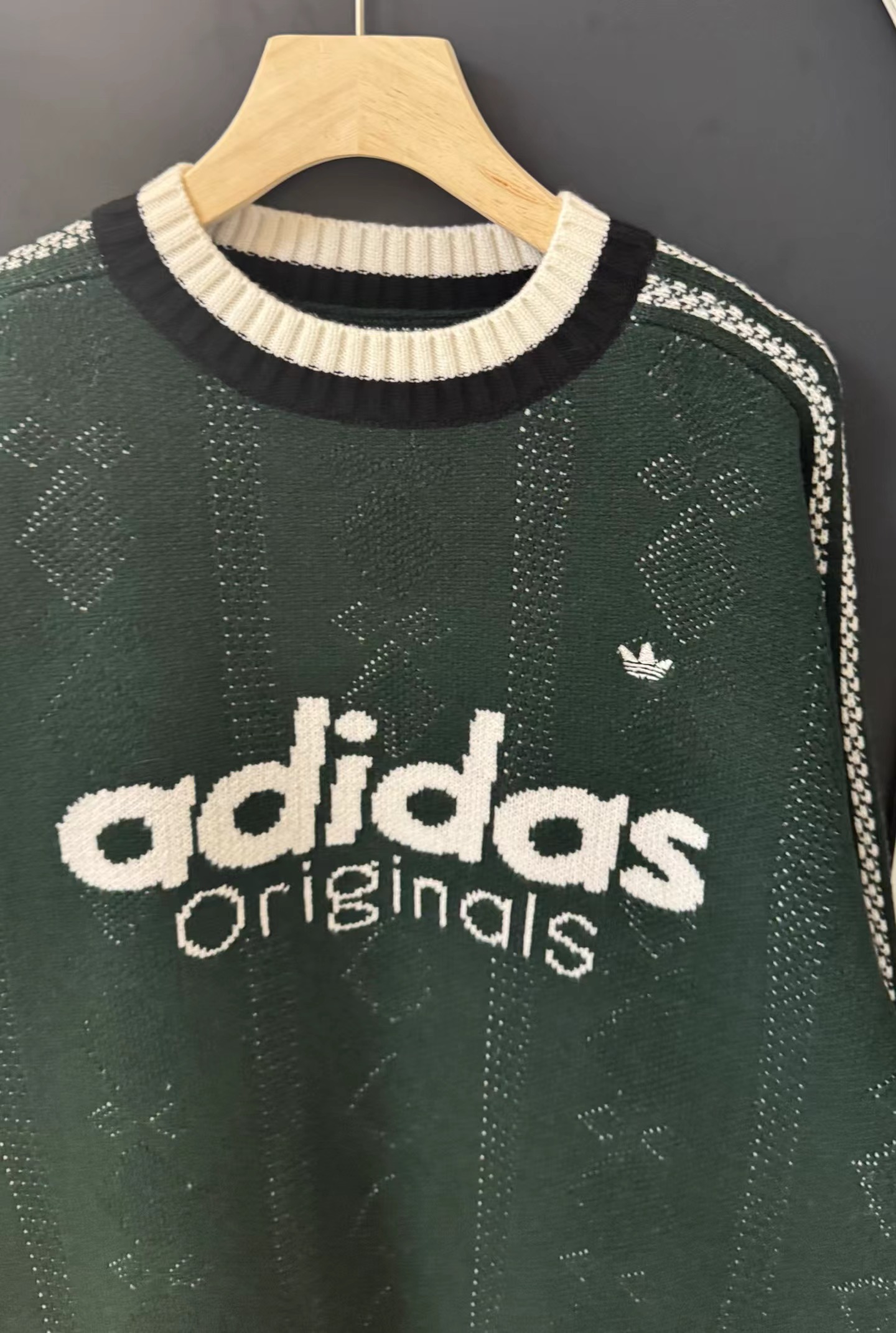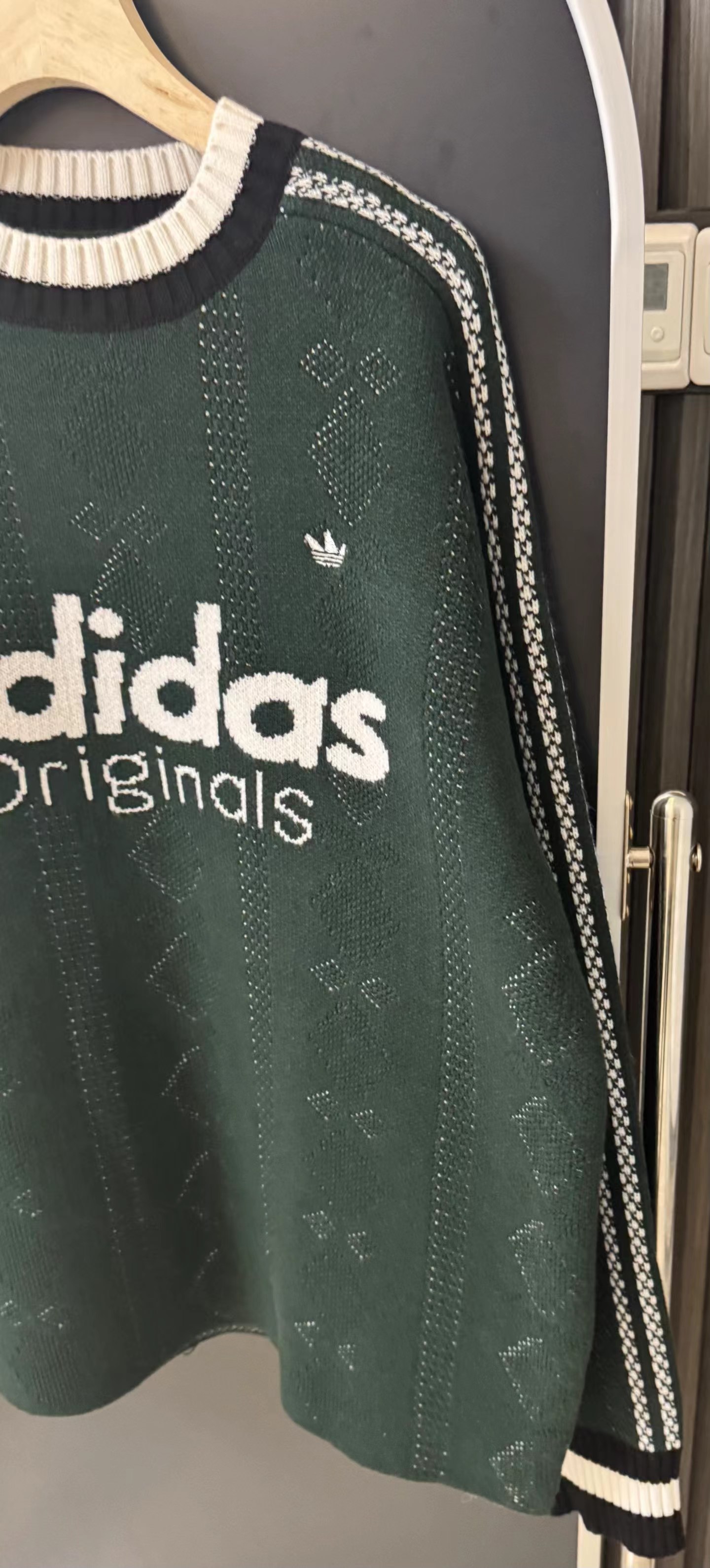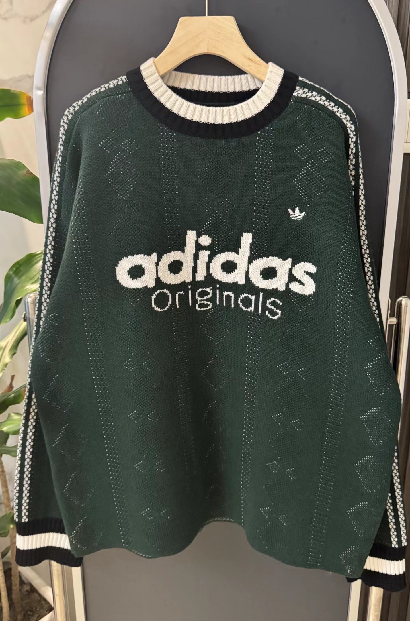三叶草针织套头毛衣,为男女同款的宽松版型设计,撞色的领口、袖口,采用高支高密针织工艺,纹理紧实不透风,还带有类似镂空的视觉效果却无实际透风问题。正面有反向的字母提花,肩部点缀三叶草小logo,袖子延续品牌三条杠设计,且条纹为针织一体成型,不易开线。宽松剪裁显瘦,深绿色对黄皮、黑皮友好,素颜也能驾驭,属于休闲运动风格的百搭款。