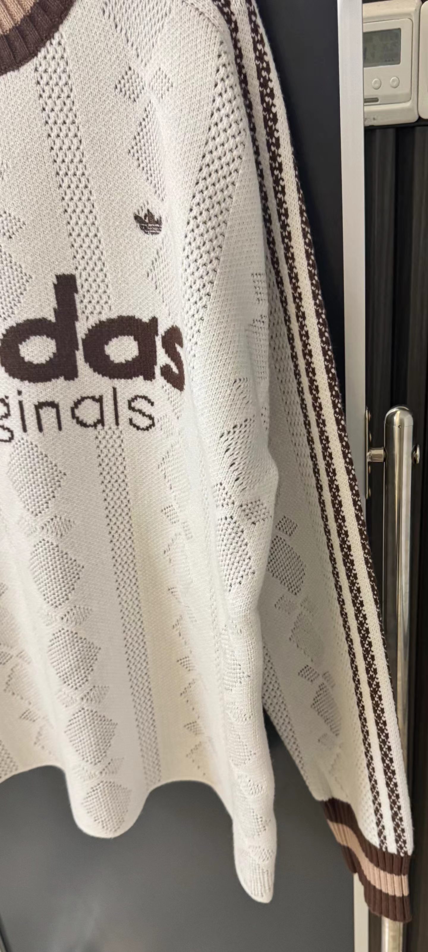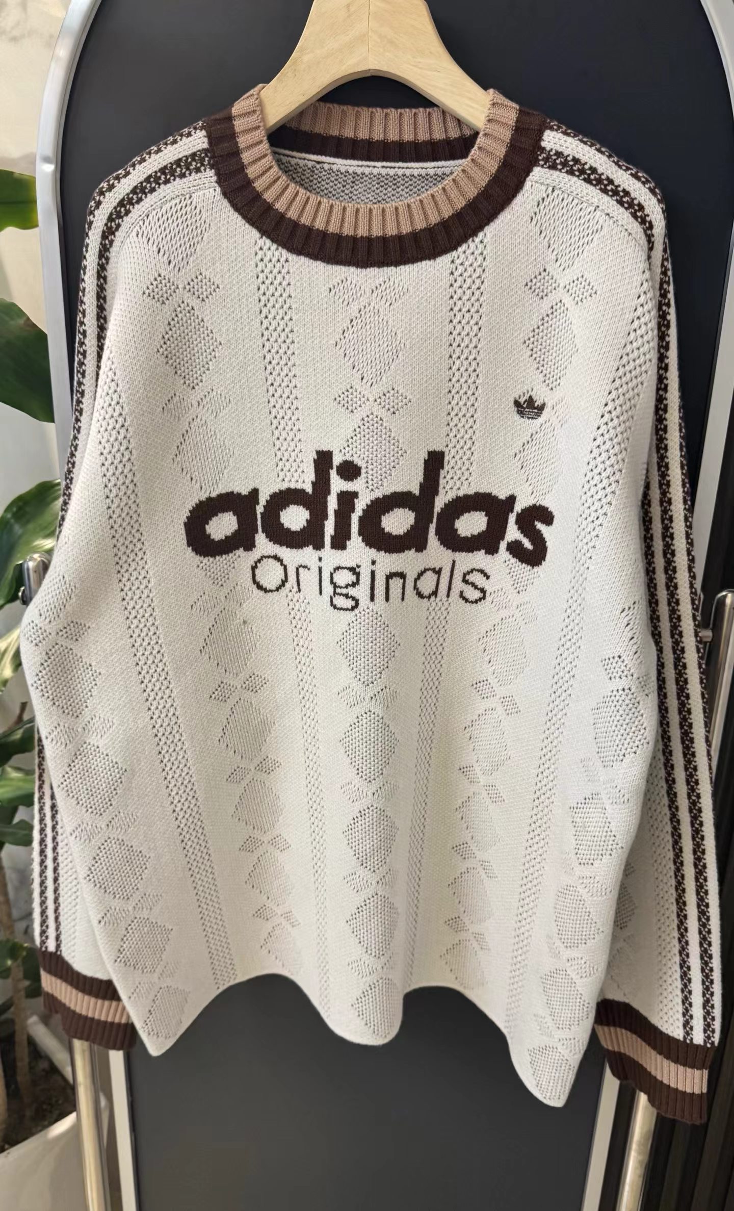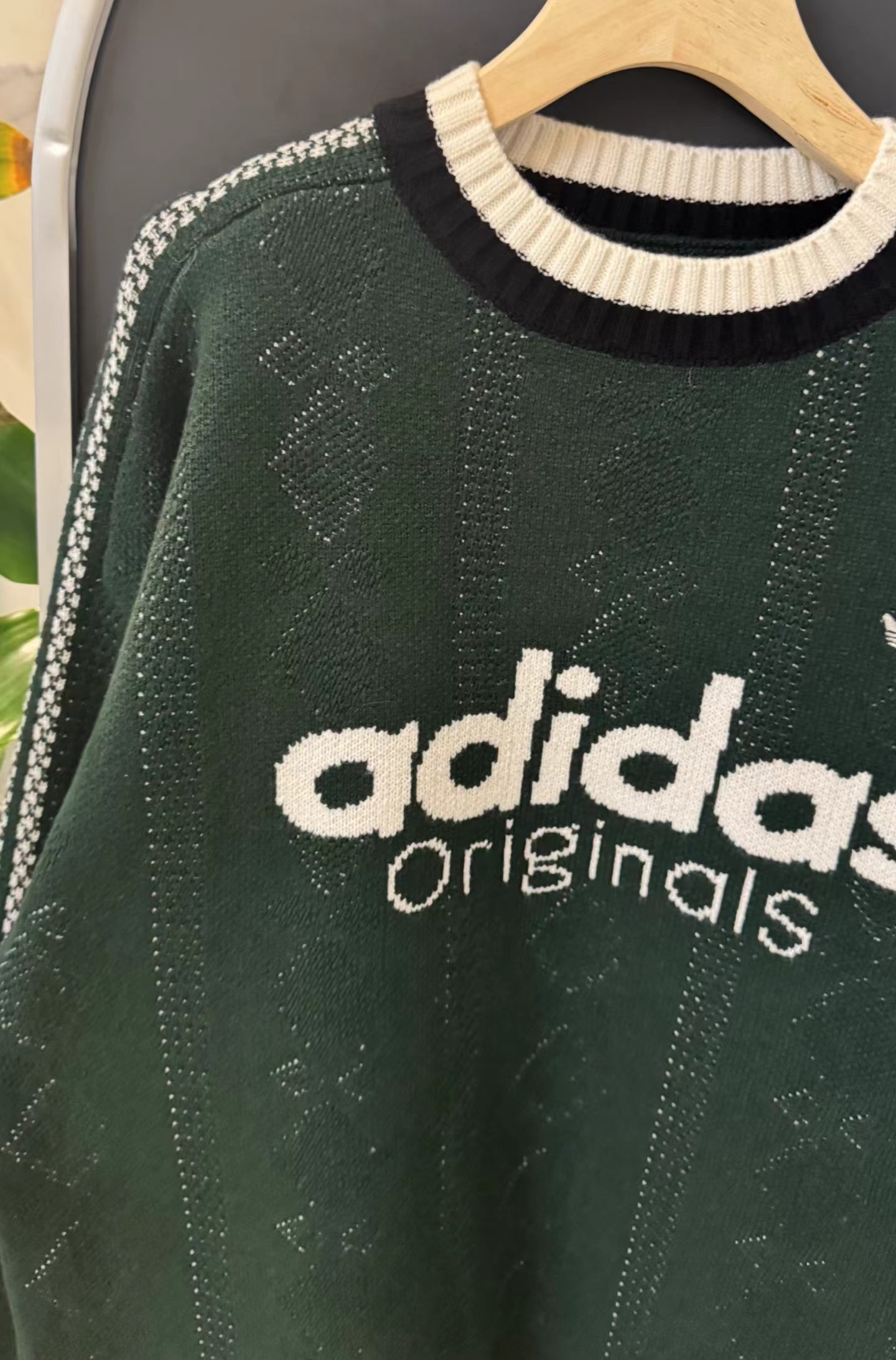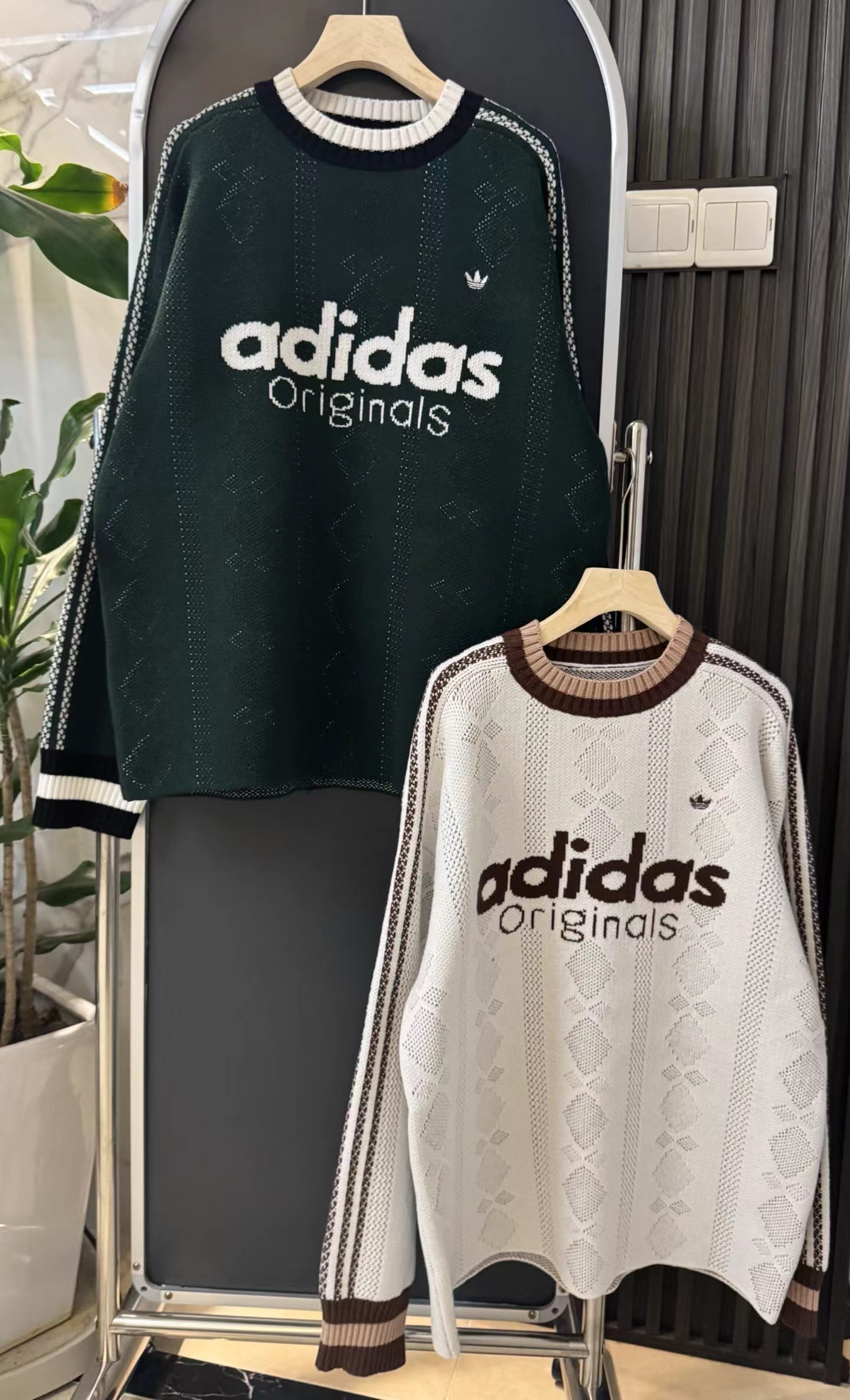 三叶草针织套头毛衣,为男女同款的宽松版型设计,撞色的领口、袖口,采用高支高密针织工艺,纹理紧实不透风,还带有类似镂空的视觉效果却无实际透风问题。正面有反向的字母提花,肩部点缀三叶草小logo,袖子延续品牌三条杠设计,且条纹为针织一体成型,不易开线。宽松剪裁显瘦,深绿色对黄皮、黑皮友好,素颜也能驾驭,属于休闲运动风格的百搭款。