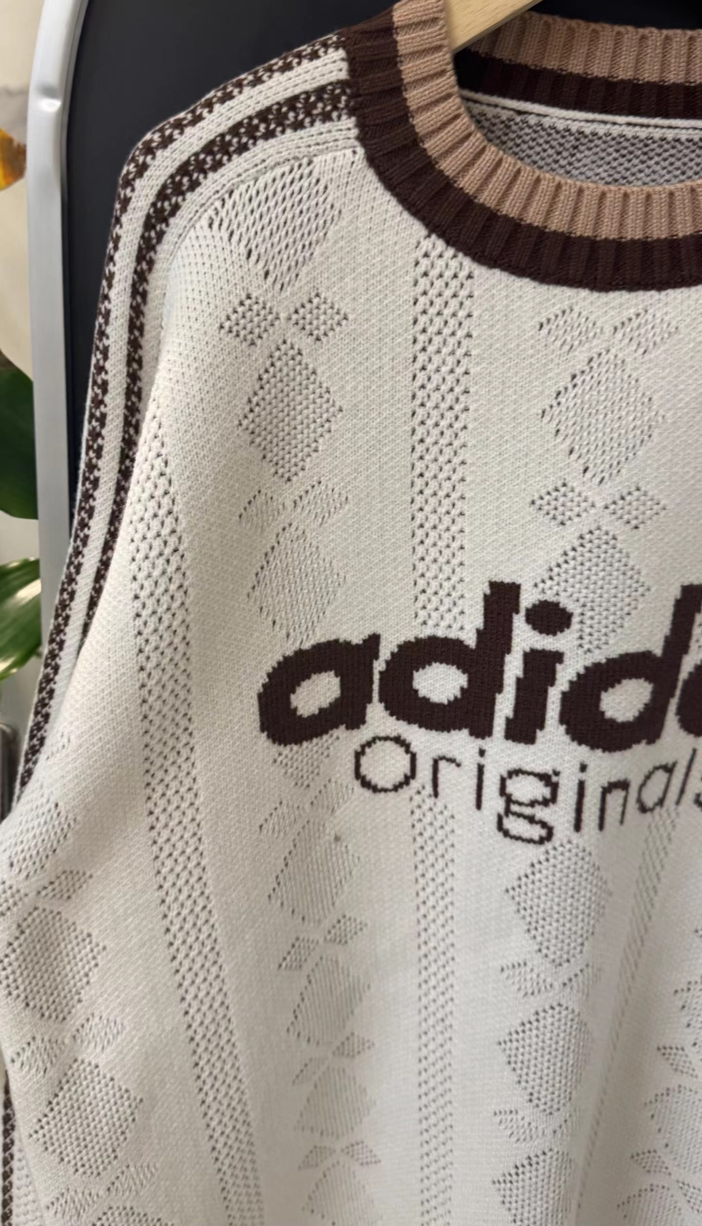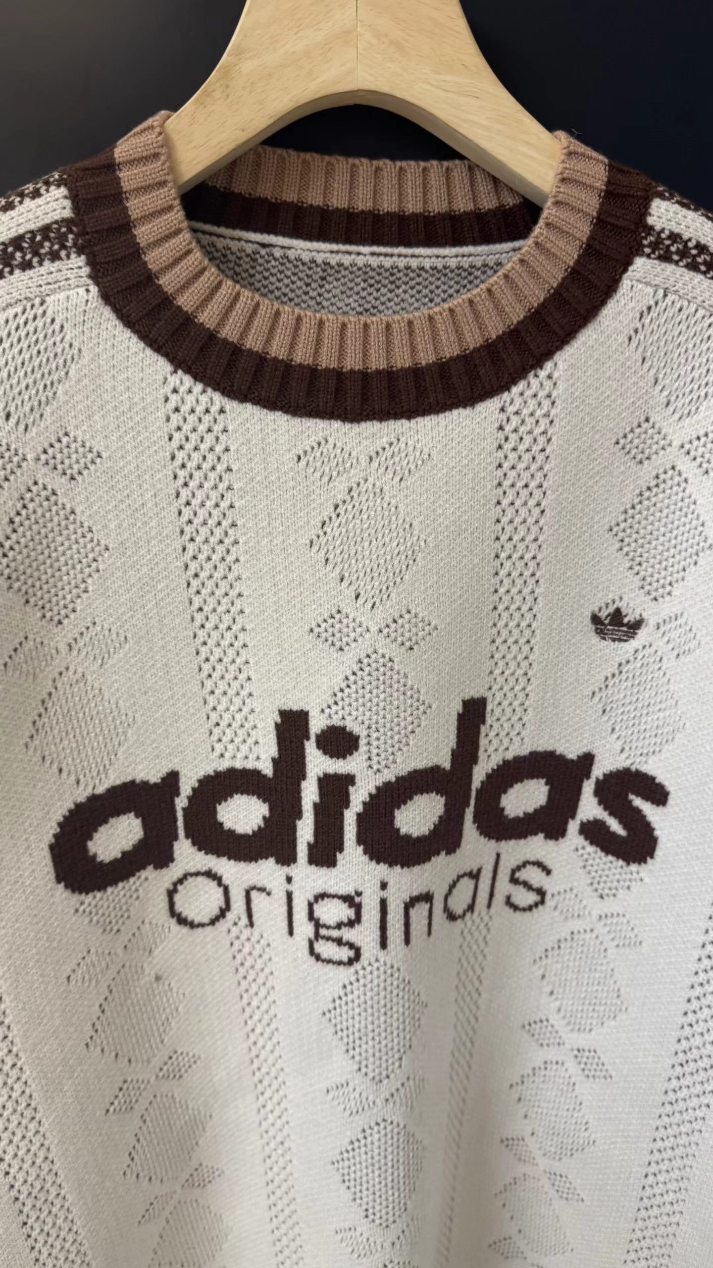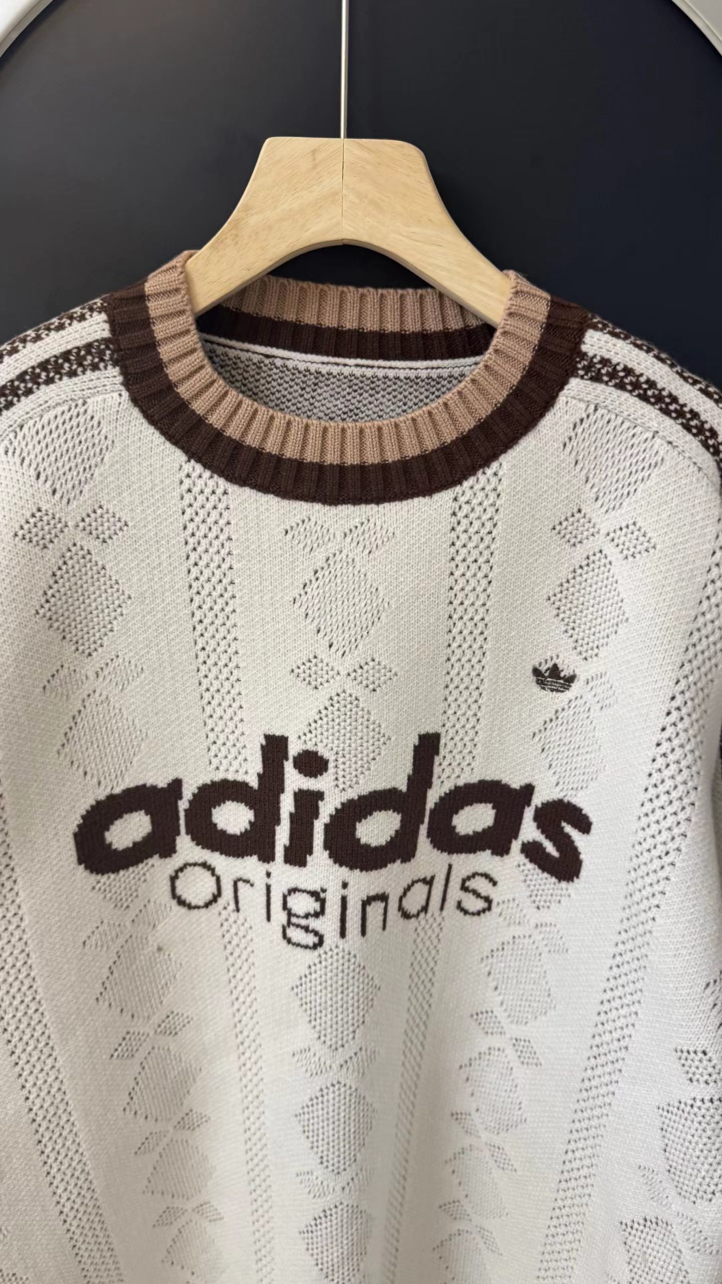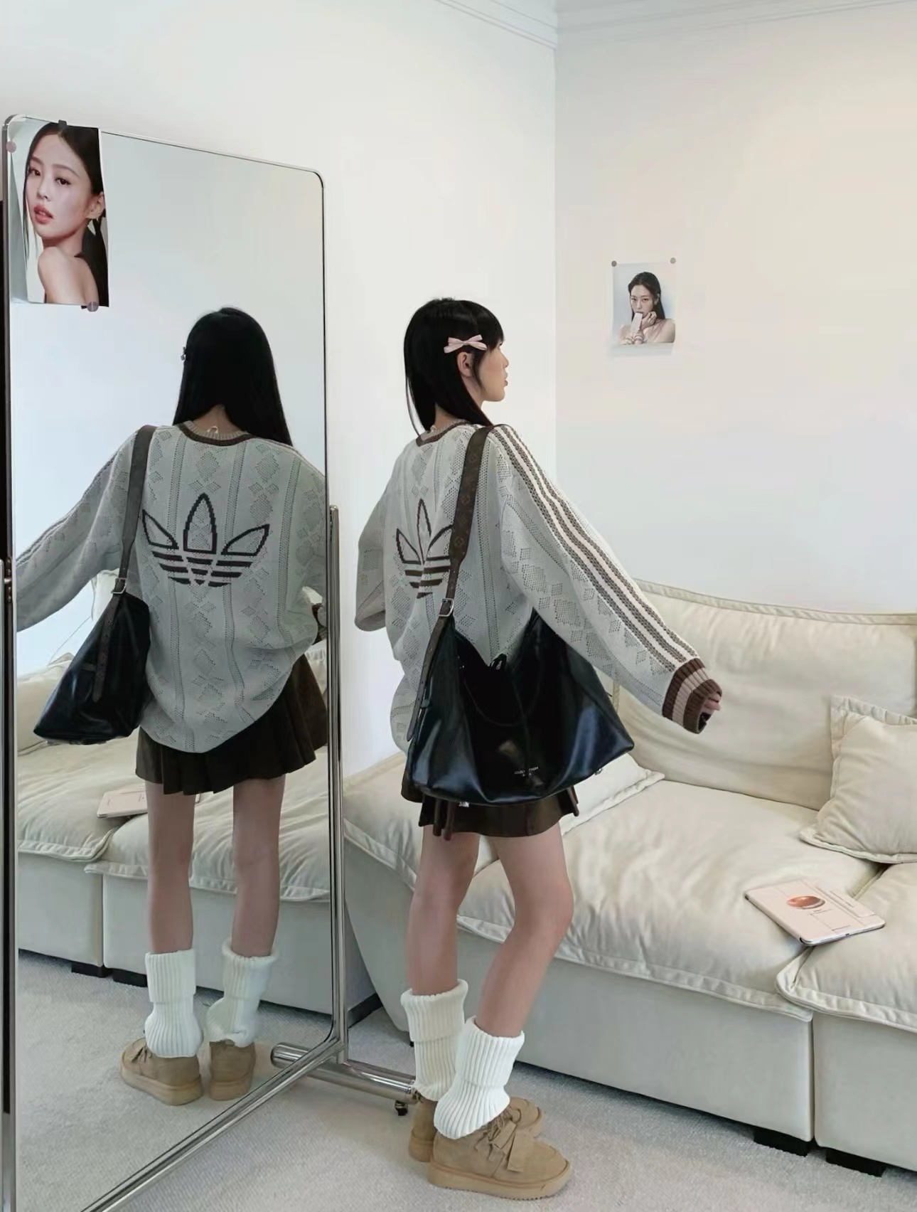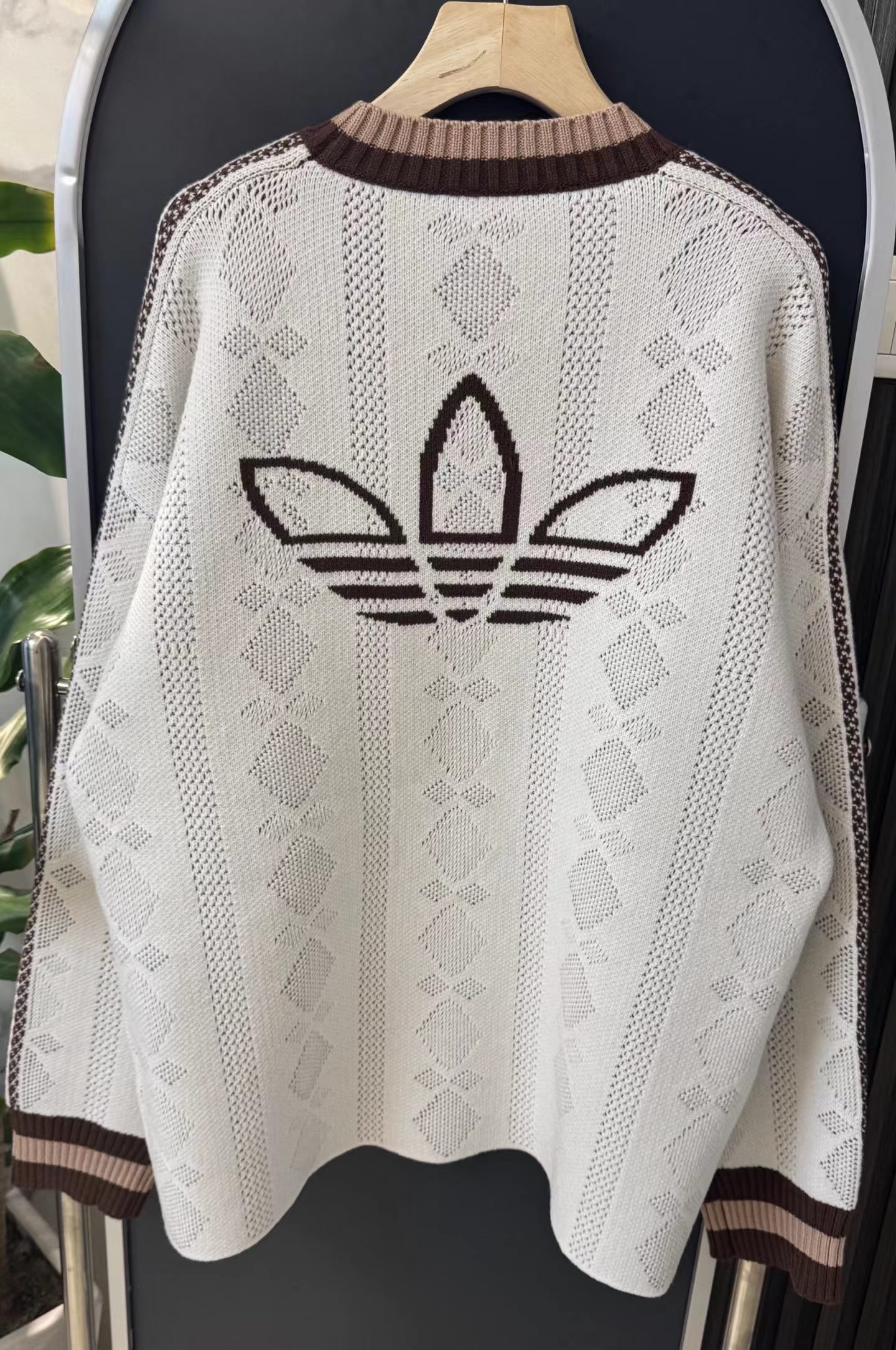 三叶草针织套头毛衣,为男女同款的宽松版型设计,撞色的领口、袖口,采用高支高密针织工艺,纹理紧实不透风,还带有类似镂空的视觉效果却无实际透风问题。正面有反向的字母提花,肩部点缀三叶草小logo,袖子延续品牌三条杠设计,且条纹为针织一体成型,不易开线。宽松剪裁显瘦,深绿色对黄皮、黑皮友好,素颜也能驾驭,属于休闲运动风格的百搭款。