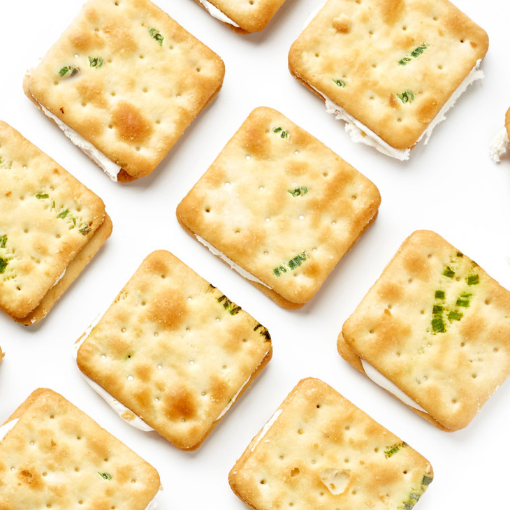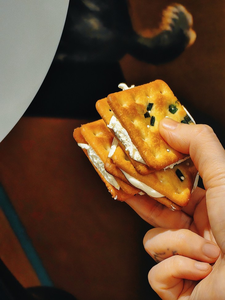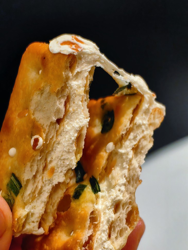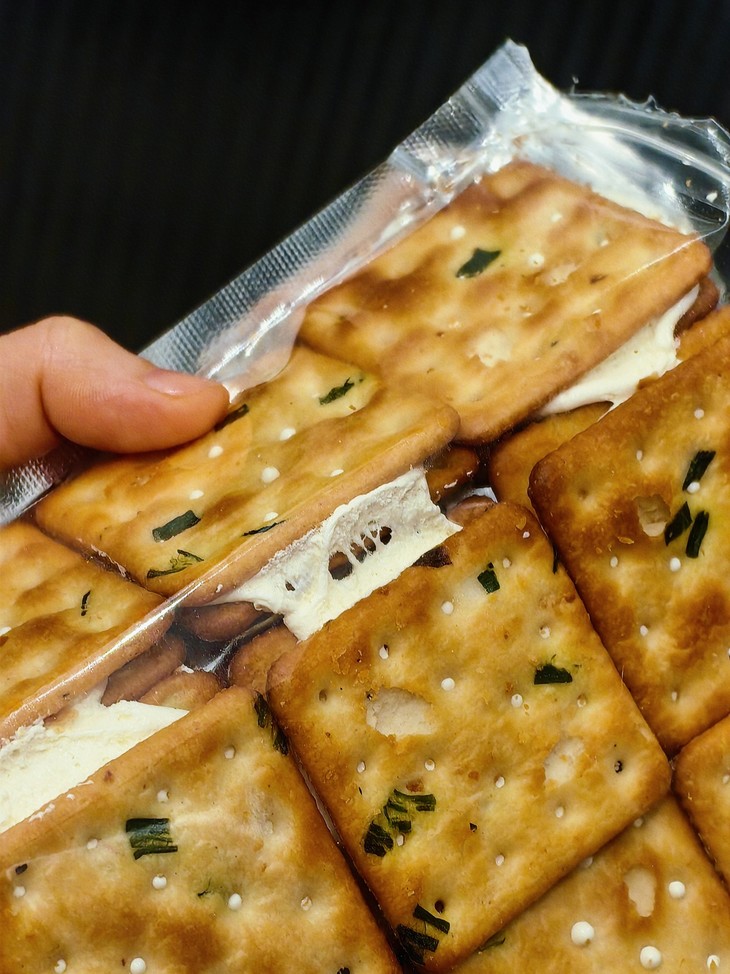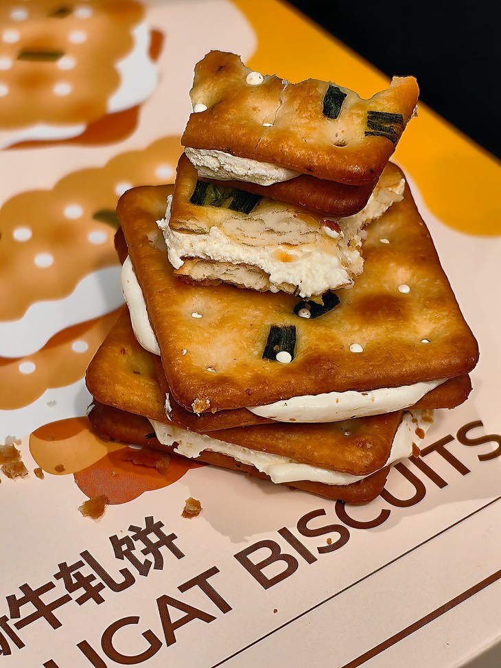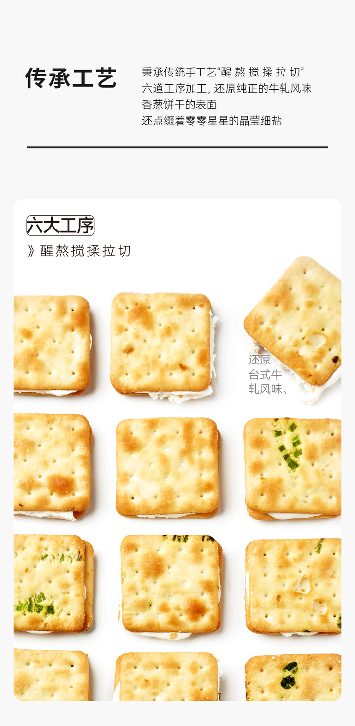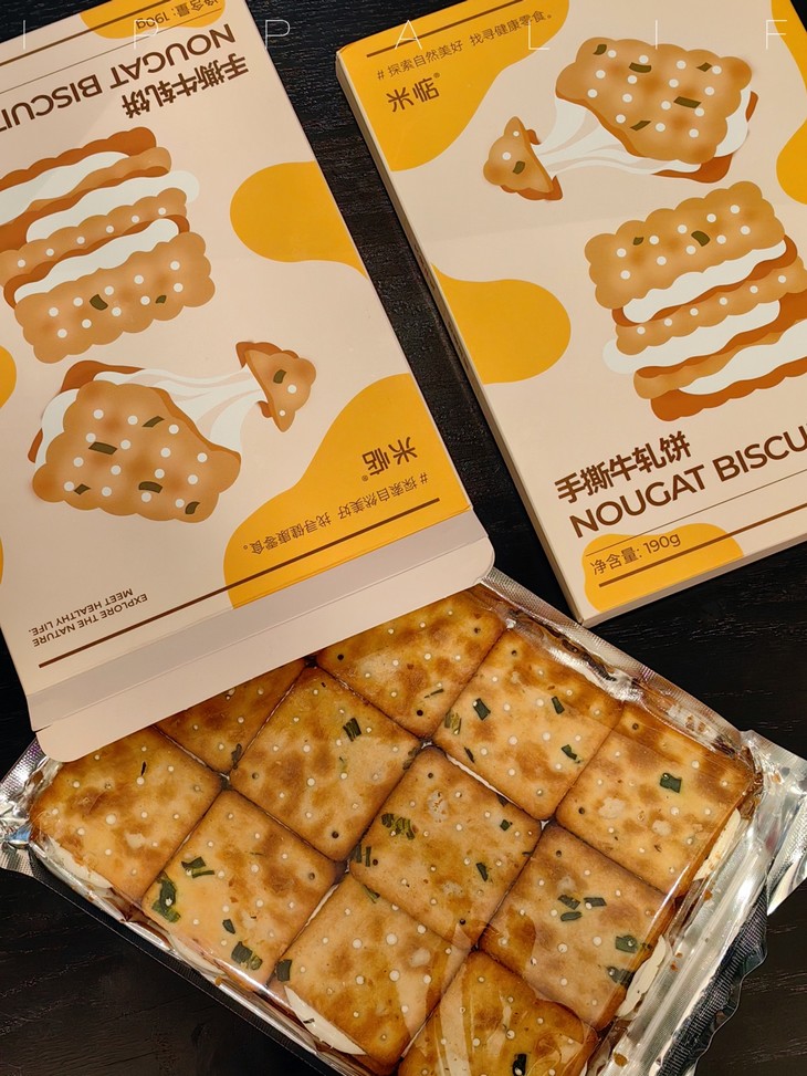包装也是蛮有意思的,饼子们是并排放的哎,码得整整齐齐,一大块!葱香和牛乳香满满,夹心更是肉眼可见,撕下的每一块都有奶白的蜜糖相连!饼干上还点缀着零星的细盐和香葱,咸甜交织,口感层次超丰富!想再特别一点,还可以放到微波炉中小火叮5秒,牛轧夹心微微融化,酥脆软糯,糖体拉丝,更加美味诱人!但我可等不了,直接吃就巨好吃了,一块掰四片,都炫我嘴里来!