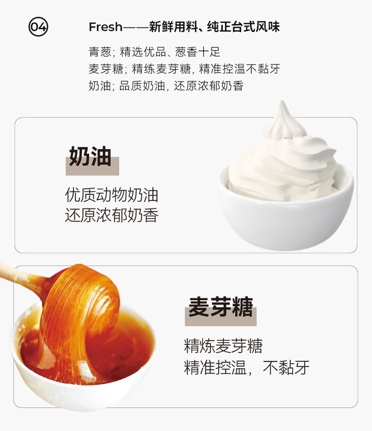 米惦在食材真是毫不吝啬,优质动物奶油与精细小麦粉,奶香纯正,麦香悠长。再用传统手工艺,经过醒、熬、搅、揉、切六道繁琐工序,由熟手工人手工熬制,弹糯拉丝,美味不腻,每一口都饱含厚实的夹心,再有咸鲜的鲜葱点缀其间,酥脆脆中又有棉花糖般的甜蜜,太上头了!