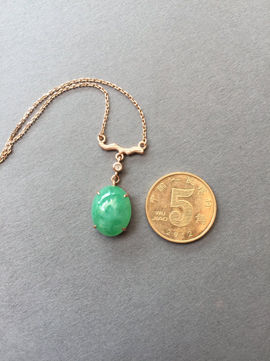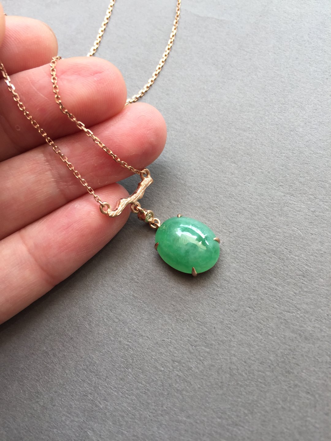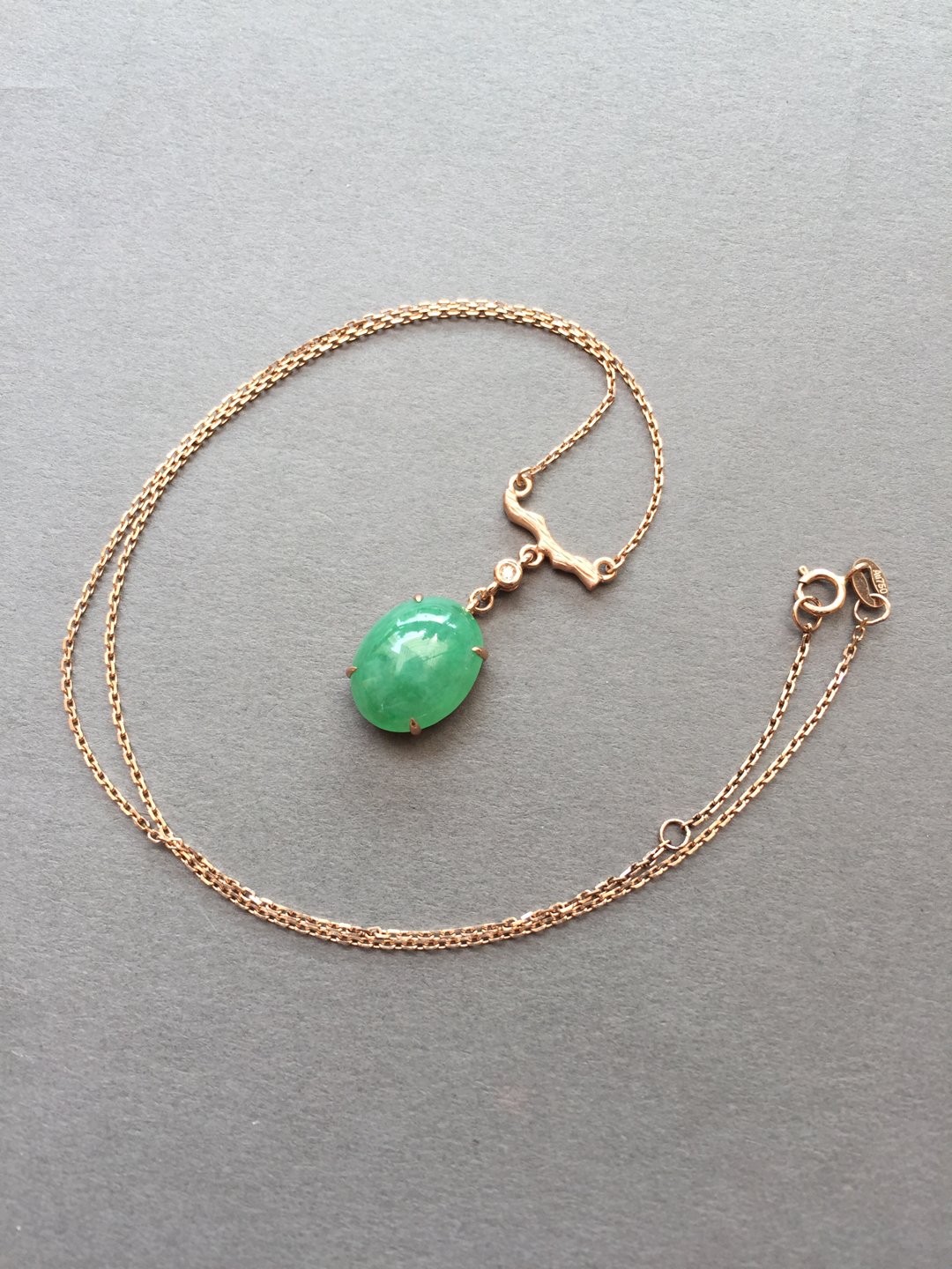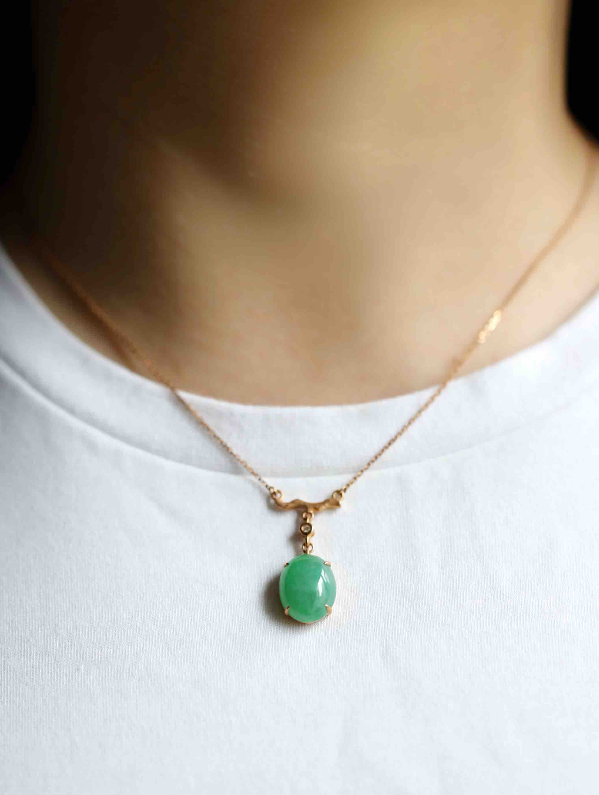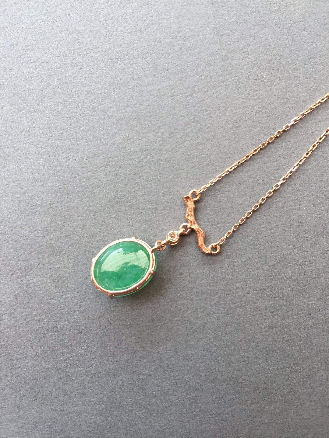 冰种阳绿蛋面锁骨链,缅甸料,裸石14.5×11.2×5mm,大气饱满,种水晶莹剔透,种色俱佳,朝气蓬勃,自然系的设计风格,18k玫瑰金镶嵌,点缀钻石,上身清雅大方,链子长40cm加3cm可调长度延长链,高性价比推荐