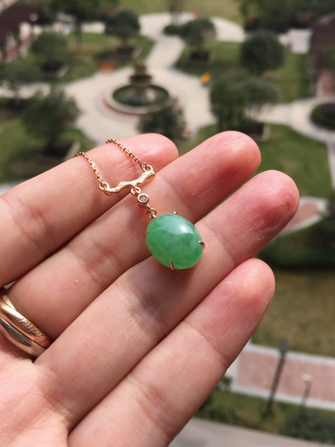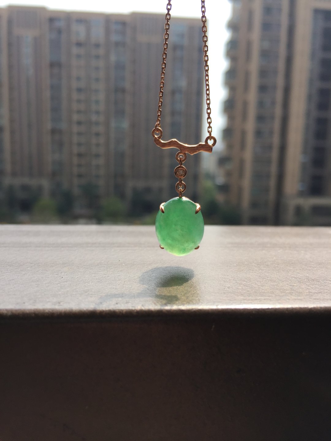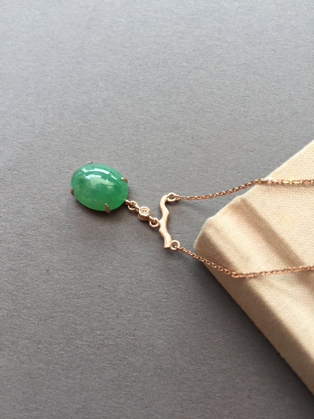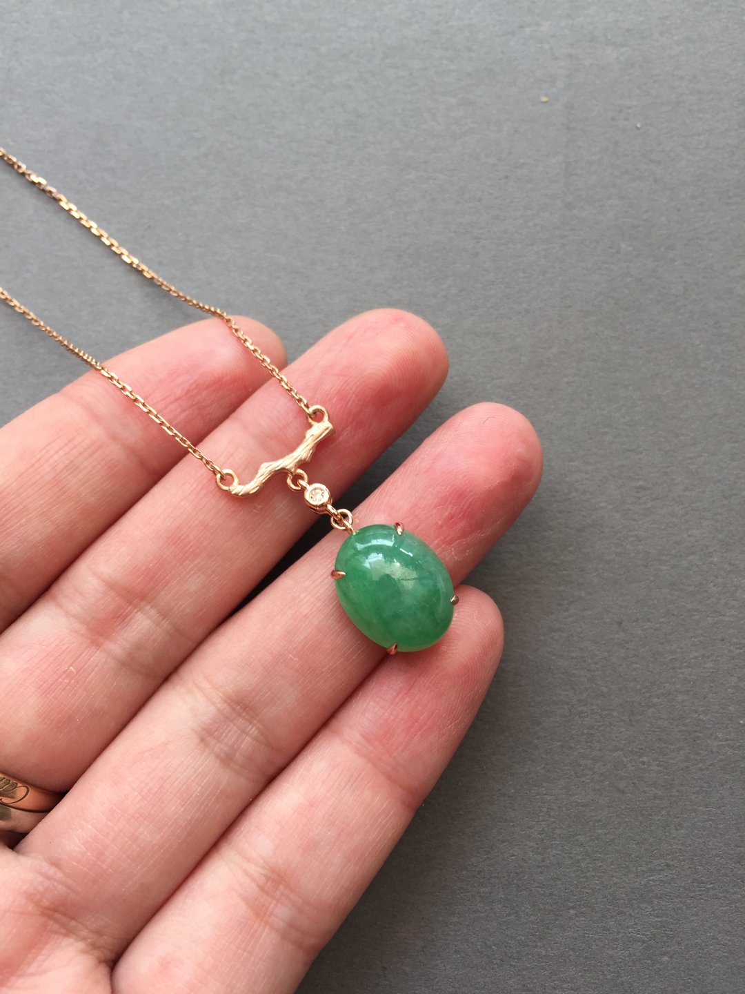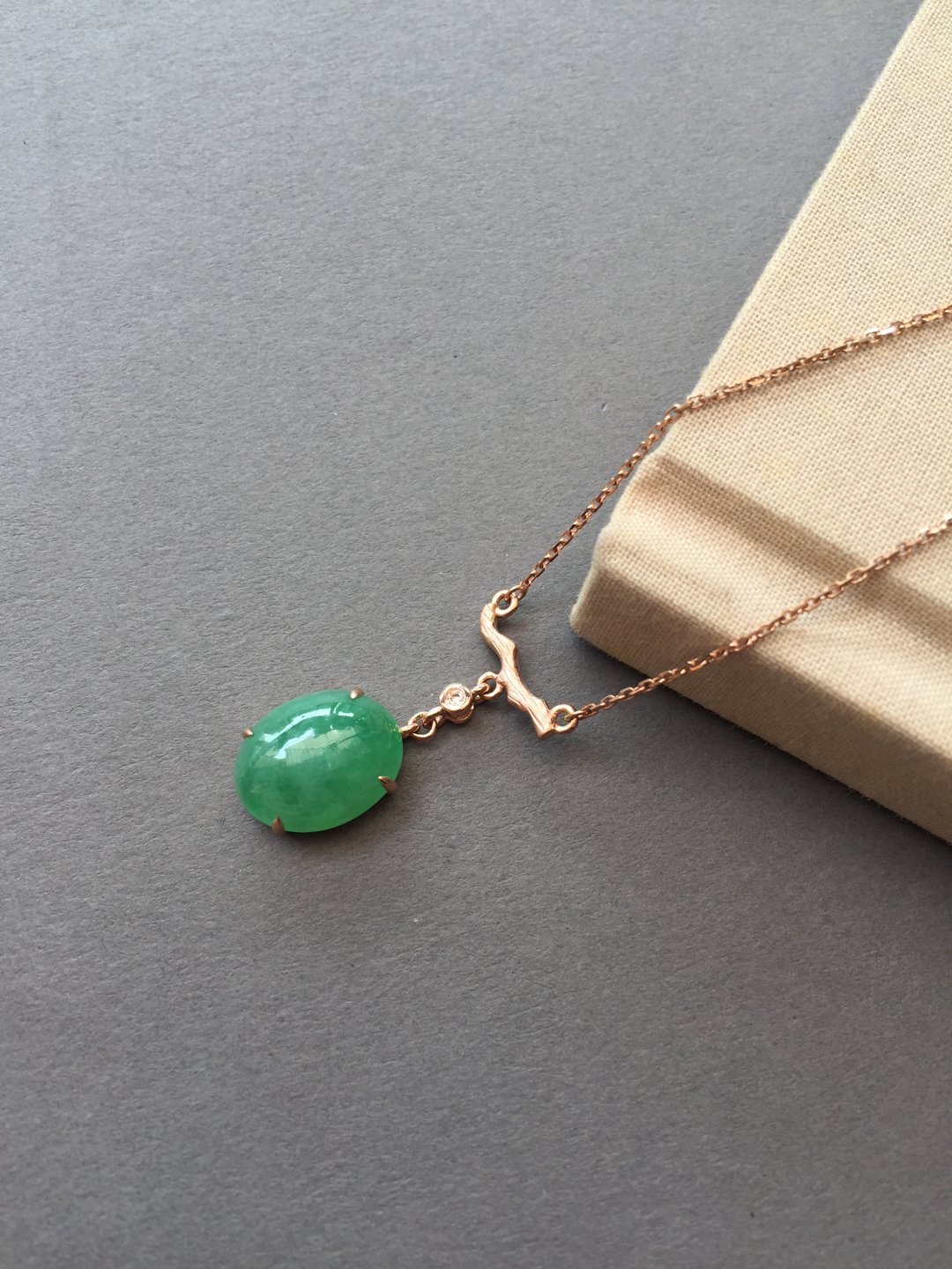 冰种阳绿蛋面锁骨链,缅甸料,裸石14.5×11.2×5mm,大气饱满,种水晶莹剔透,种色俱佳,朝气蓬勃,自然系的设计风格,18k玫瑰金镶嵌,点缀钻石,上身清雅大方,链子长40cm加3cm可调长度延长链,高性价比推荐