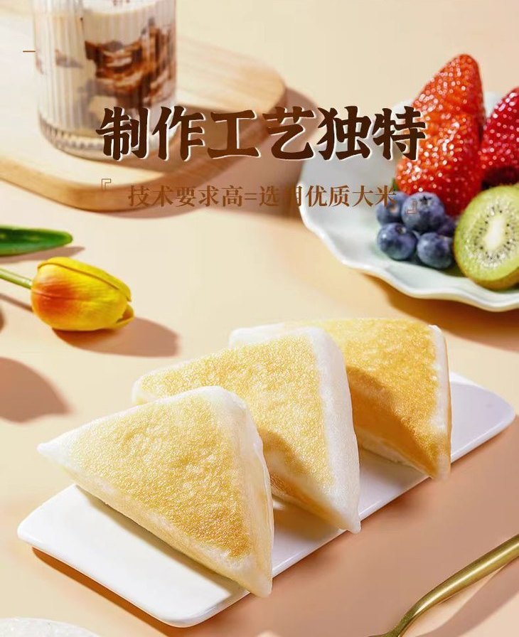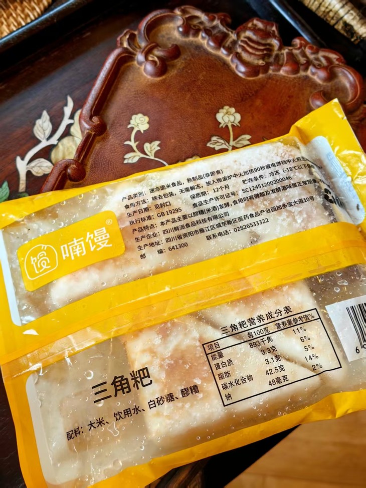 川渝的传统小吃三角粑,我也是第一次尝到哎,但很合口味,香甜软糯,还有些许韧劲,尤其是醪糟,江浙也常会用到,这种带一丝丝酒酸的风味,太熟悉了!而且,配料超干净,只有大米、饮用水、白砂糖和醪糟!