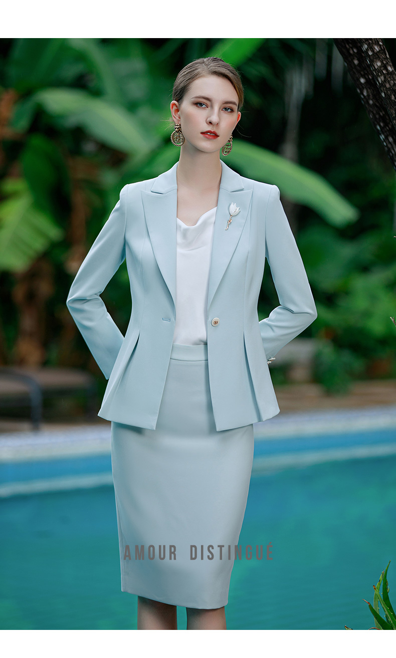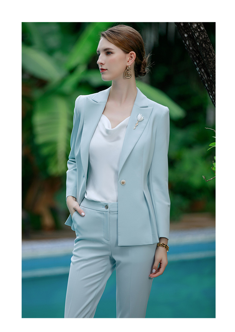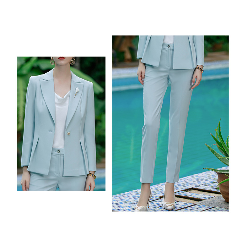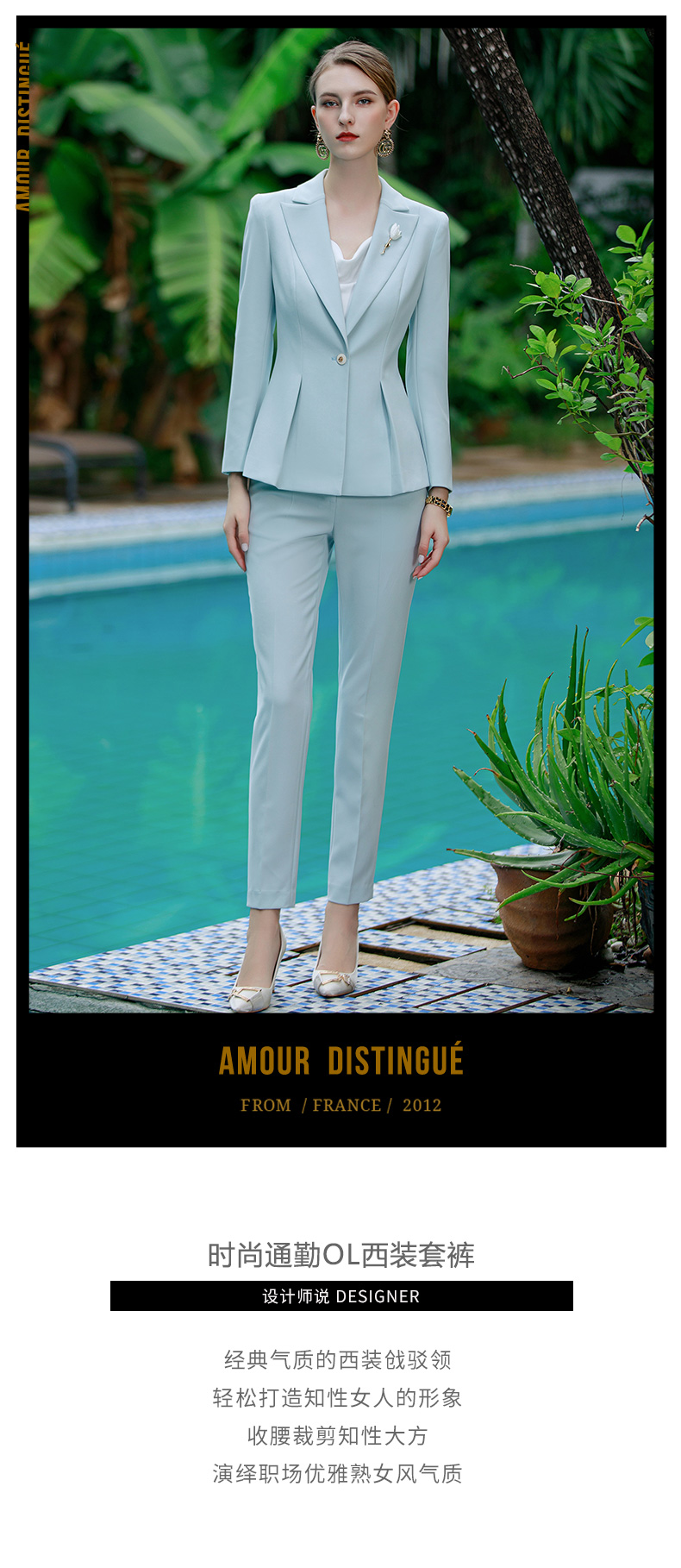 AD教师职业装女套装2023春季新款韩版修身小西服外套水蓝色正装裤