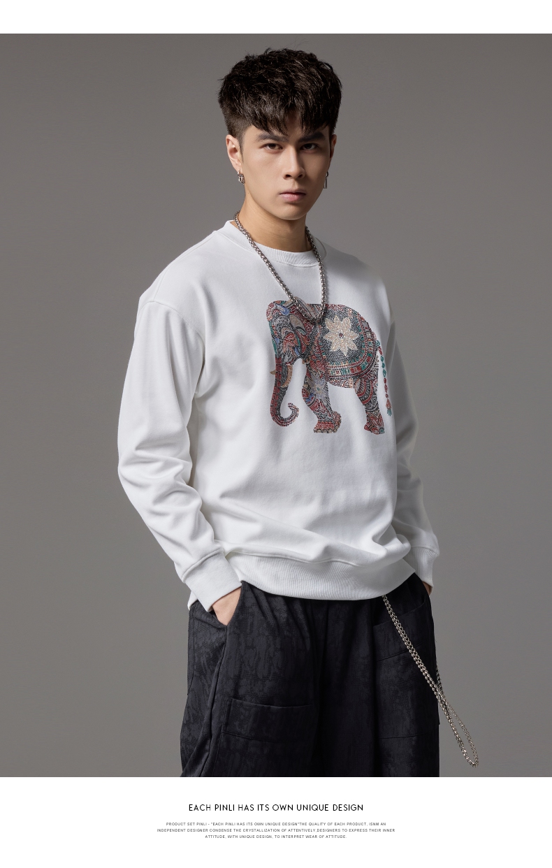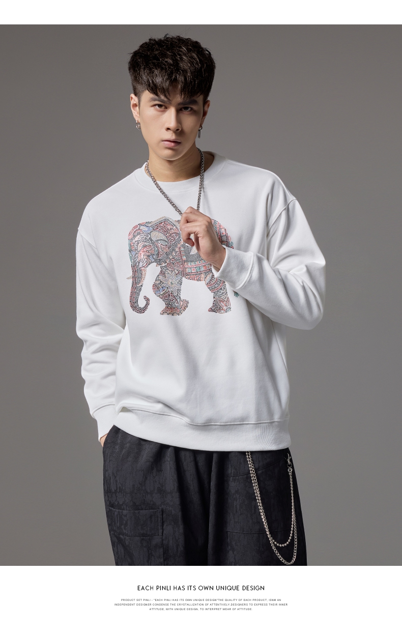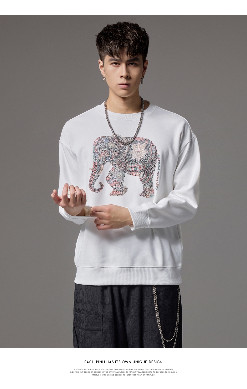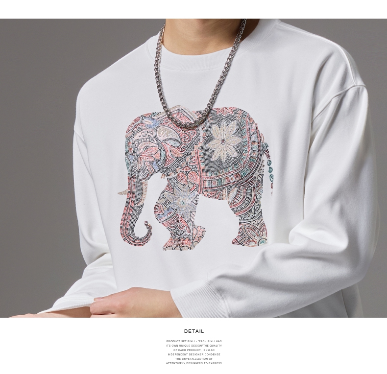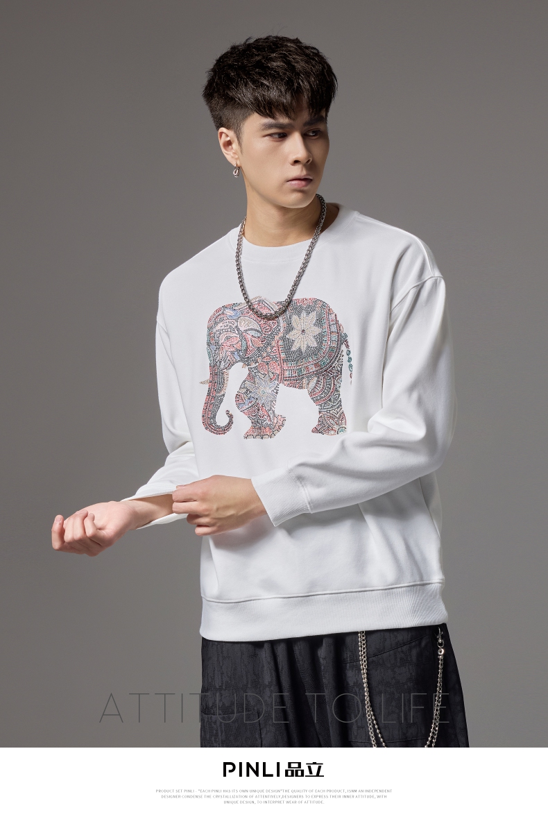 PINLI品立2024秋季新款男士圆领落肩大象烫钻套头卫衣BG243109027
