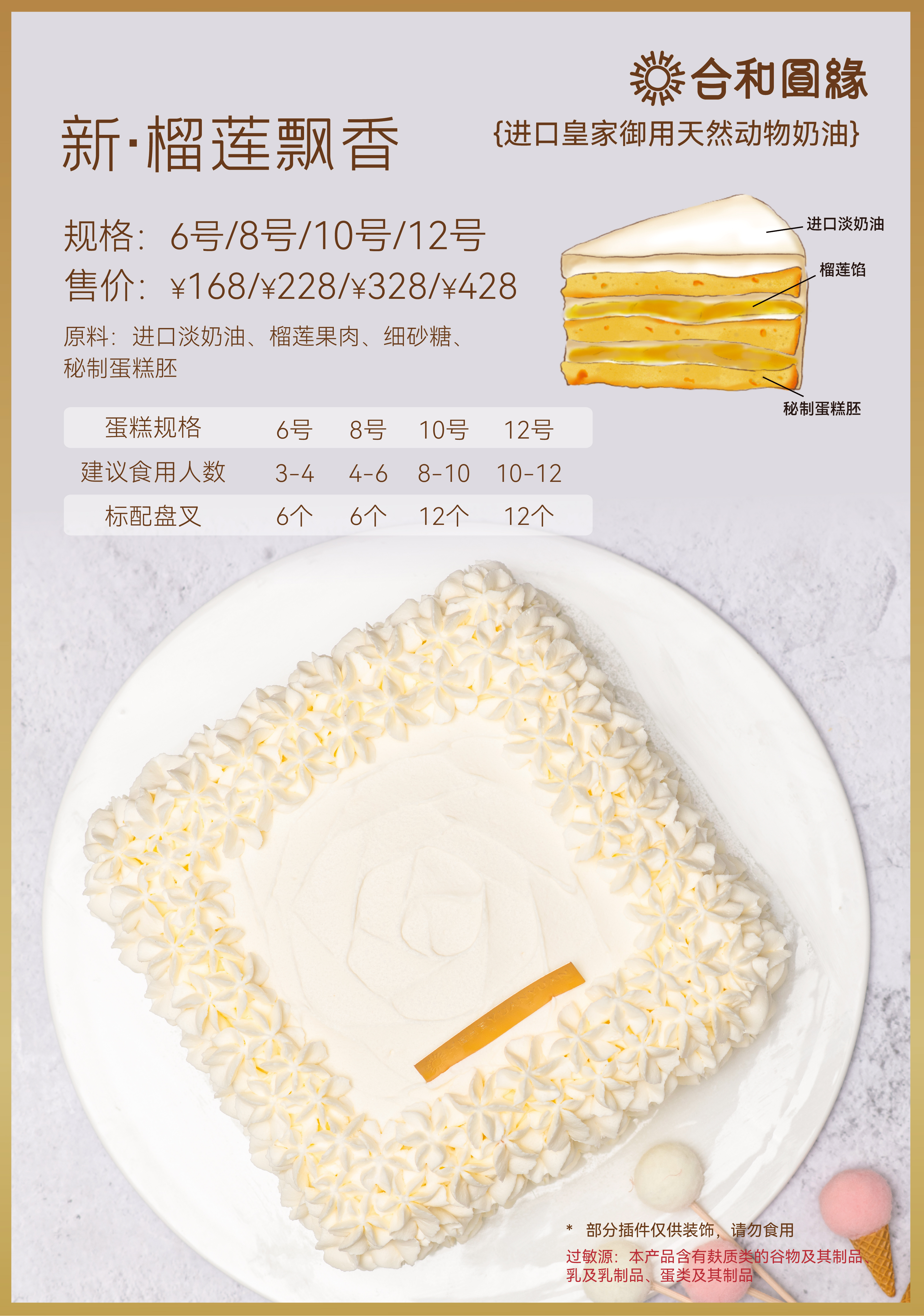 【主要配料】:进口动物奶油、榴莲果肉、秘制蛋糕胚