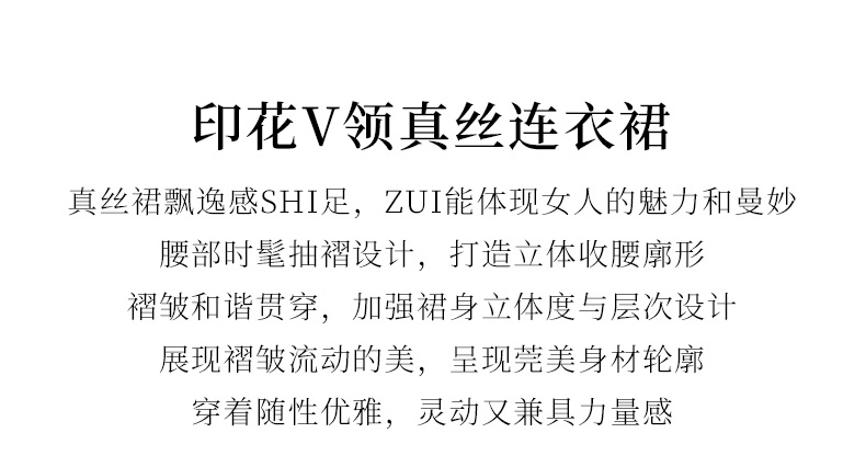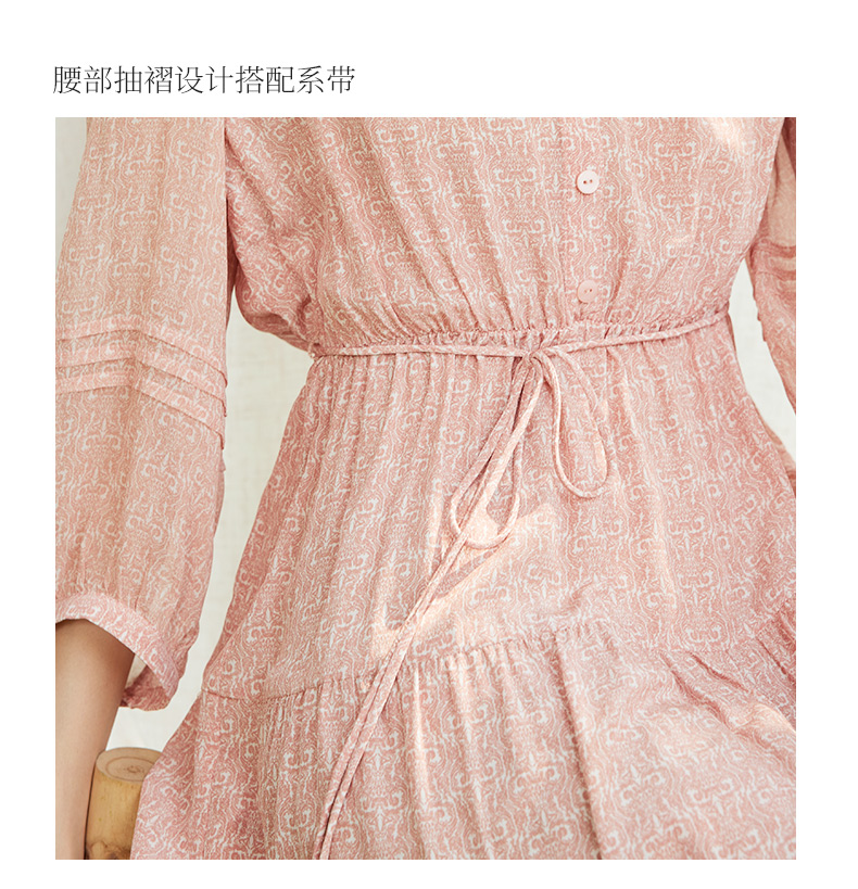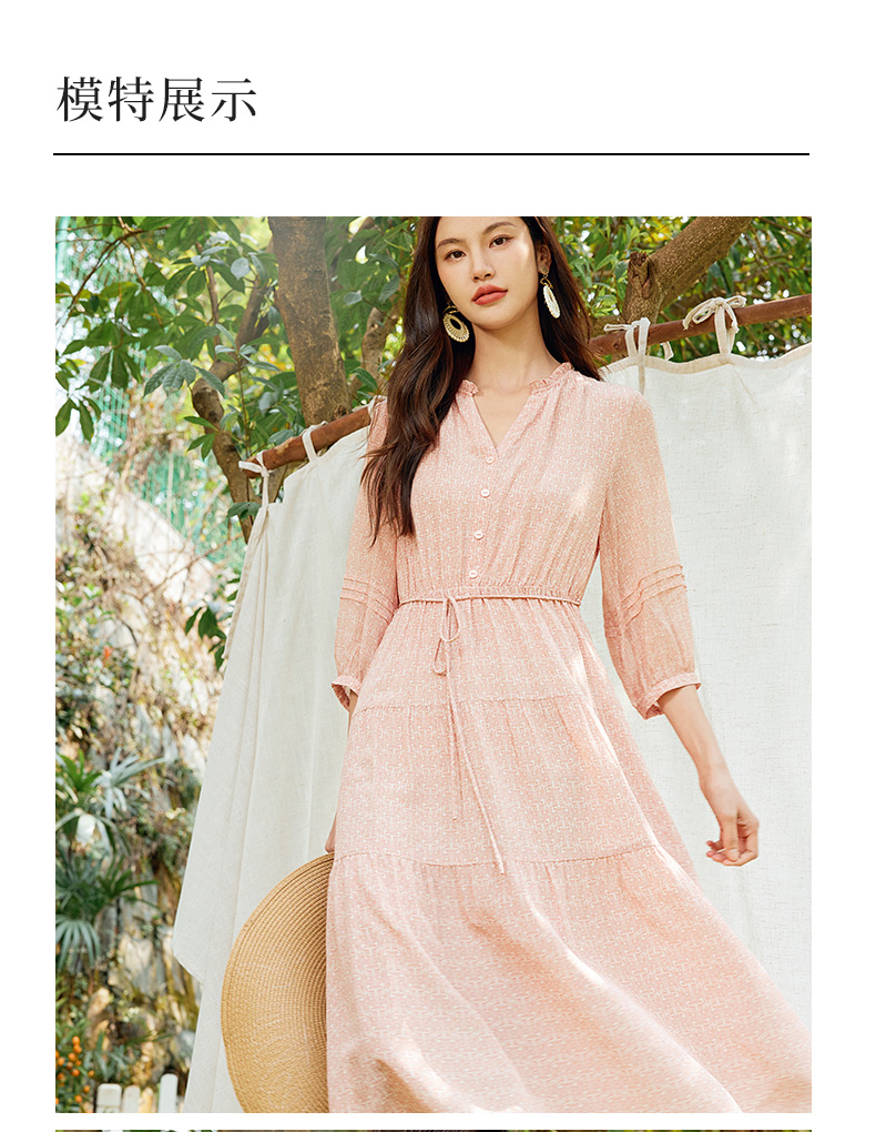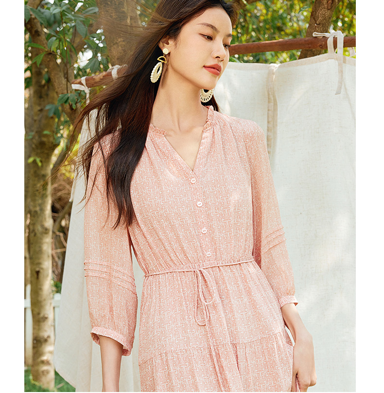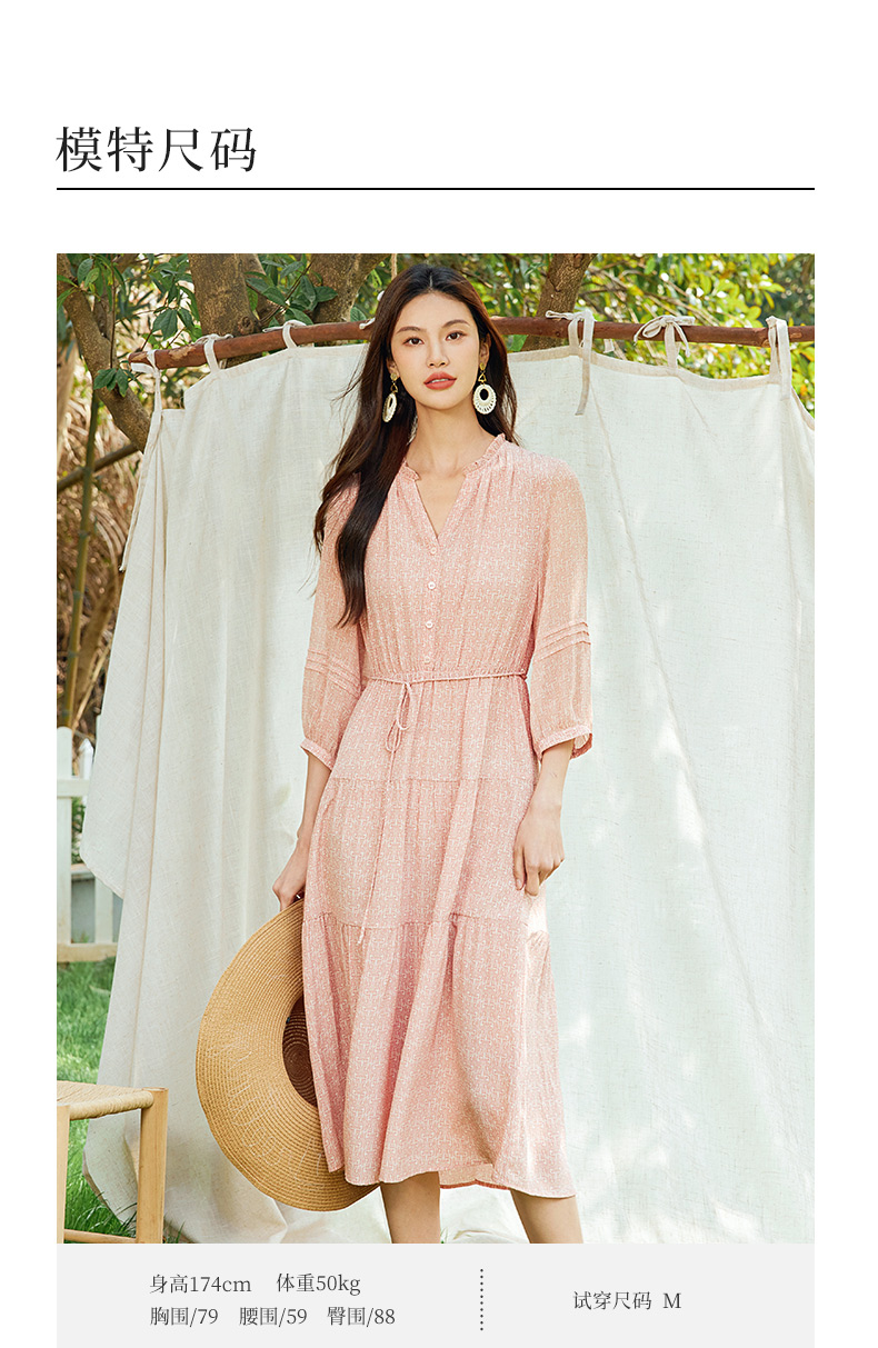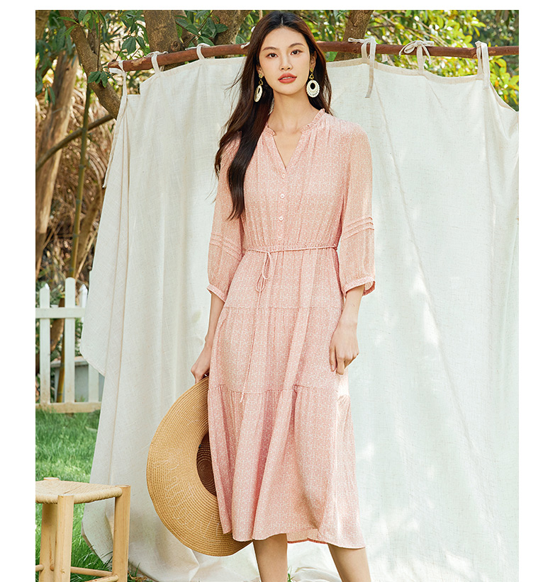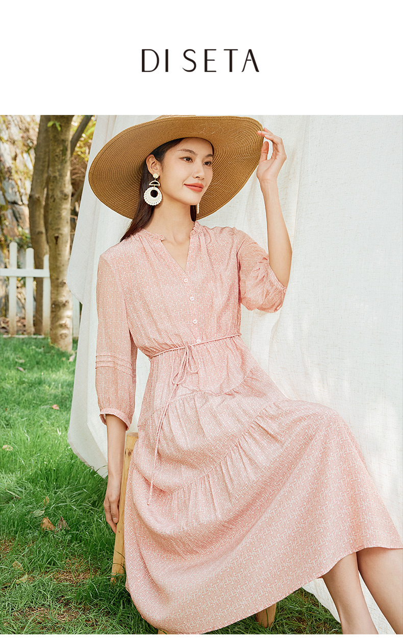 玳莎真丝V领蛋糕连衣裙2024新款休闲粉色印花夏季收腰中长款裙子 EB35310