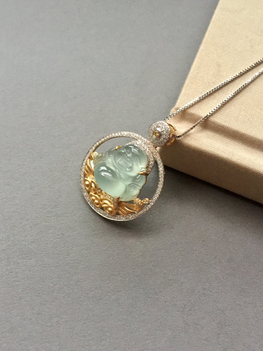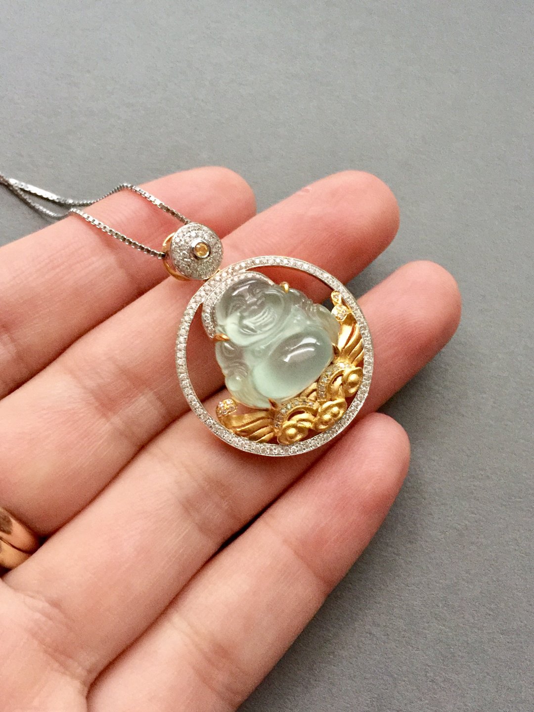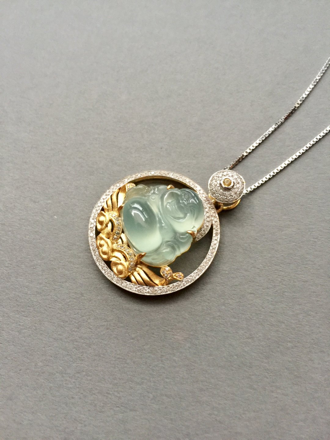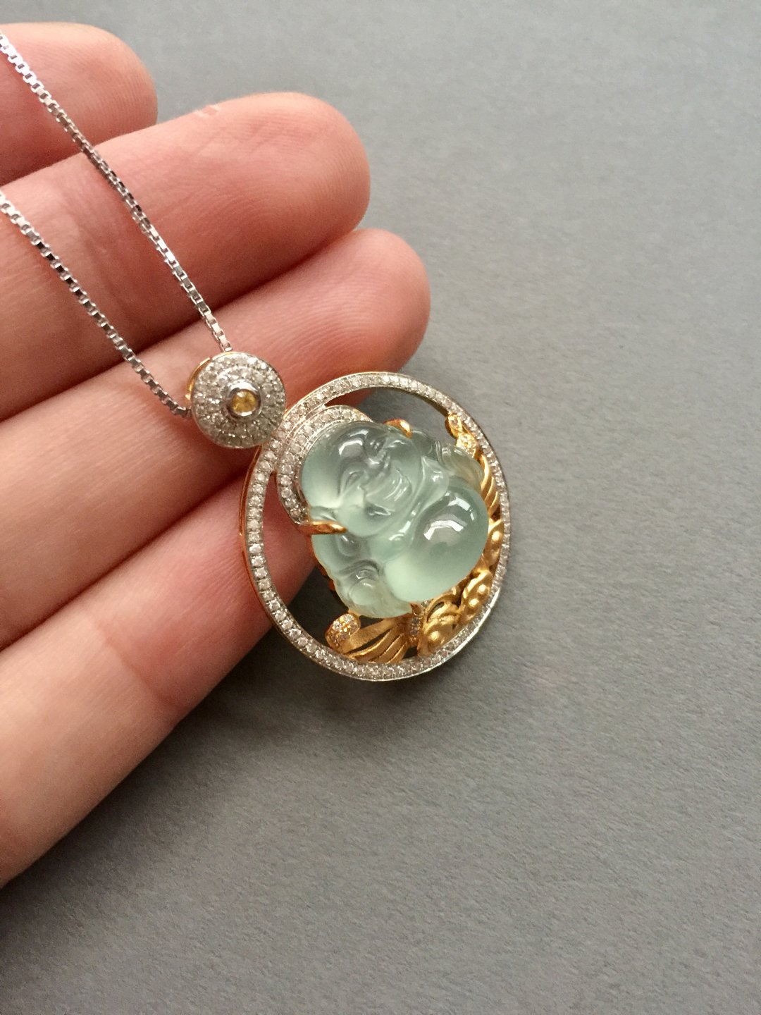 高冰种弥勒佛,16*16.5*7.8mm,镶嵌后33.7*26.2*10.7mm,晶莹剔透的种水,荧光四射,这饱满的身形和精致的雕工看得人心醉,佛公开怀大笑,让人忘却尘世的烦恼,18k白金和黄金混合镶嵌工艺加上满满的钻石,华丽而又时尚,这样一件好东西,无论是犒劳自己还是馈赠长辈都是不二选择