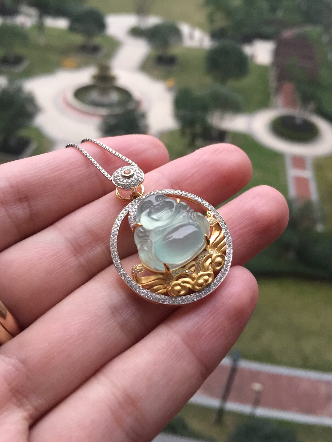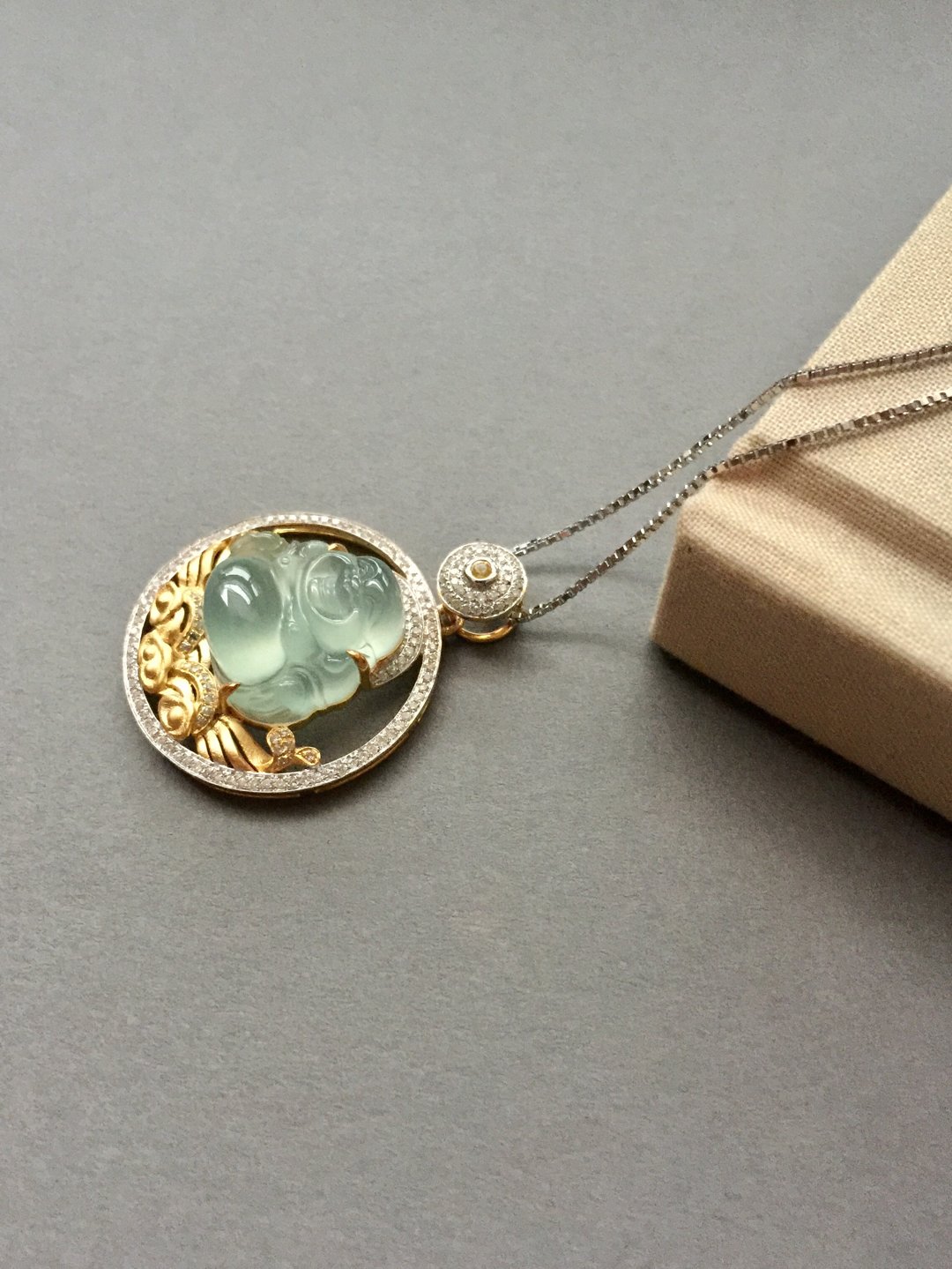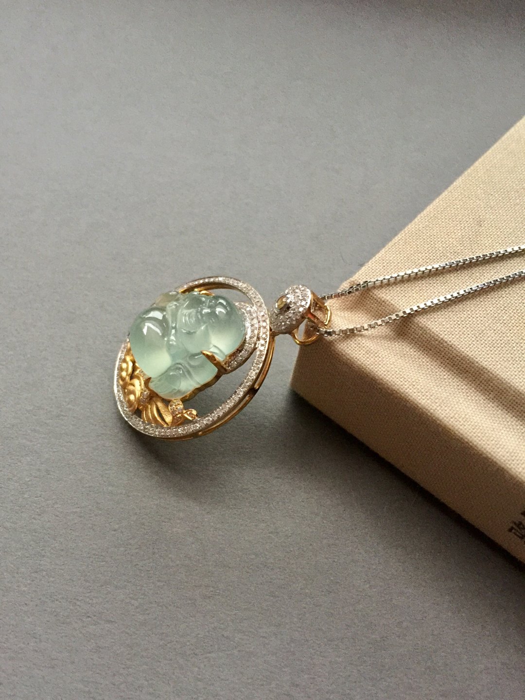 高冰种弥勒佛,16*16.5*7.8mm,镶嵌后33.7*26.2*10.7mm,晶莹剔透的种水,荧光四射,这饱满的身形和精致的雕工看得人心醉,佛公开怀大笑,让人忘却尘世的烦恼,18k白金和黄金混合镶嵌工艺加上满满的钻石,华丽而又时尚,这样一件好东西,无论是犒劳自己还是馈赠长辈都是不二选择
