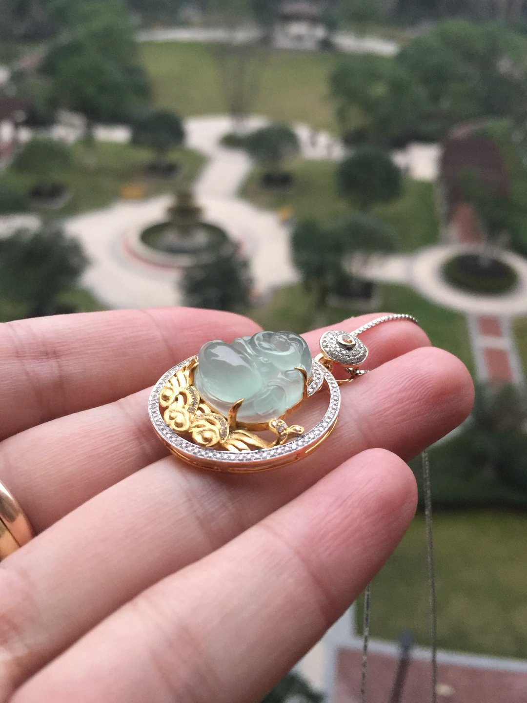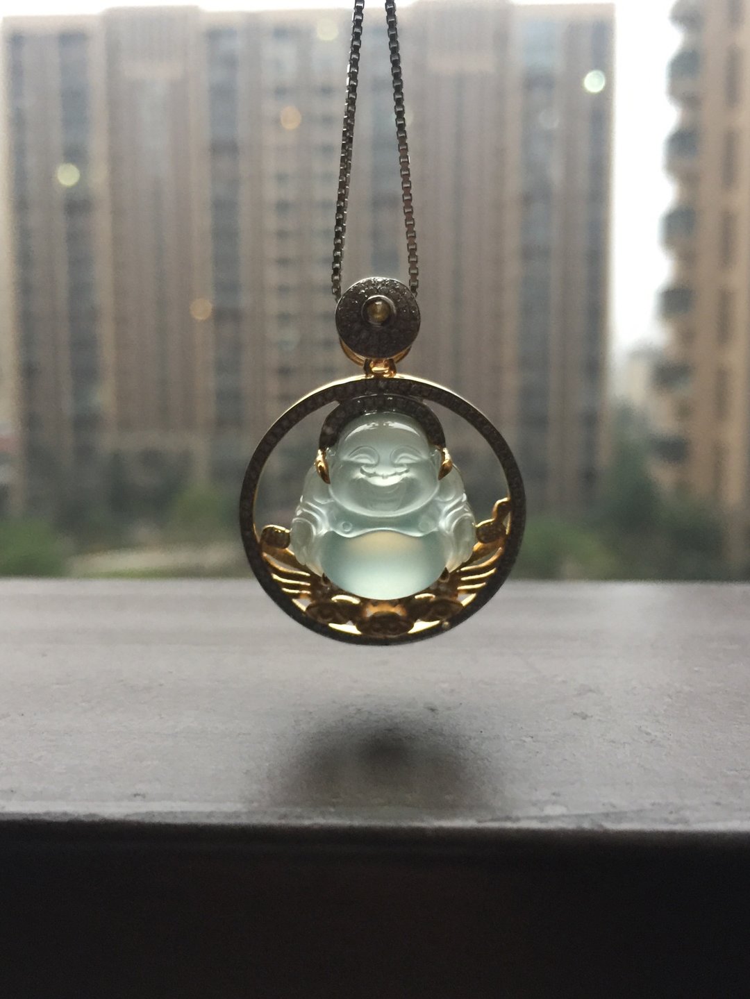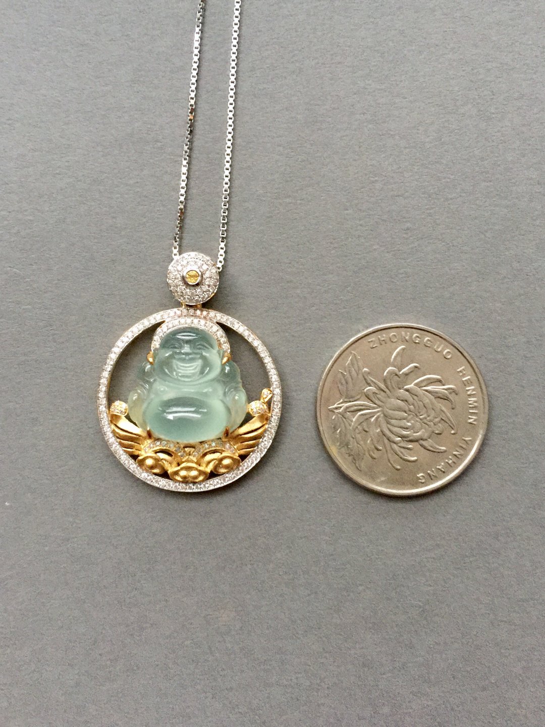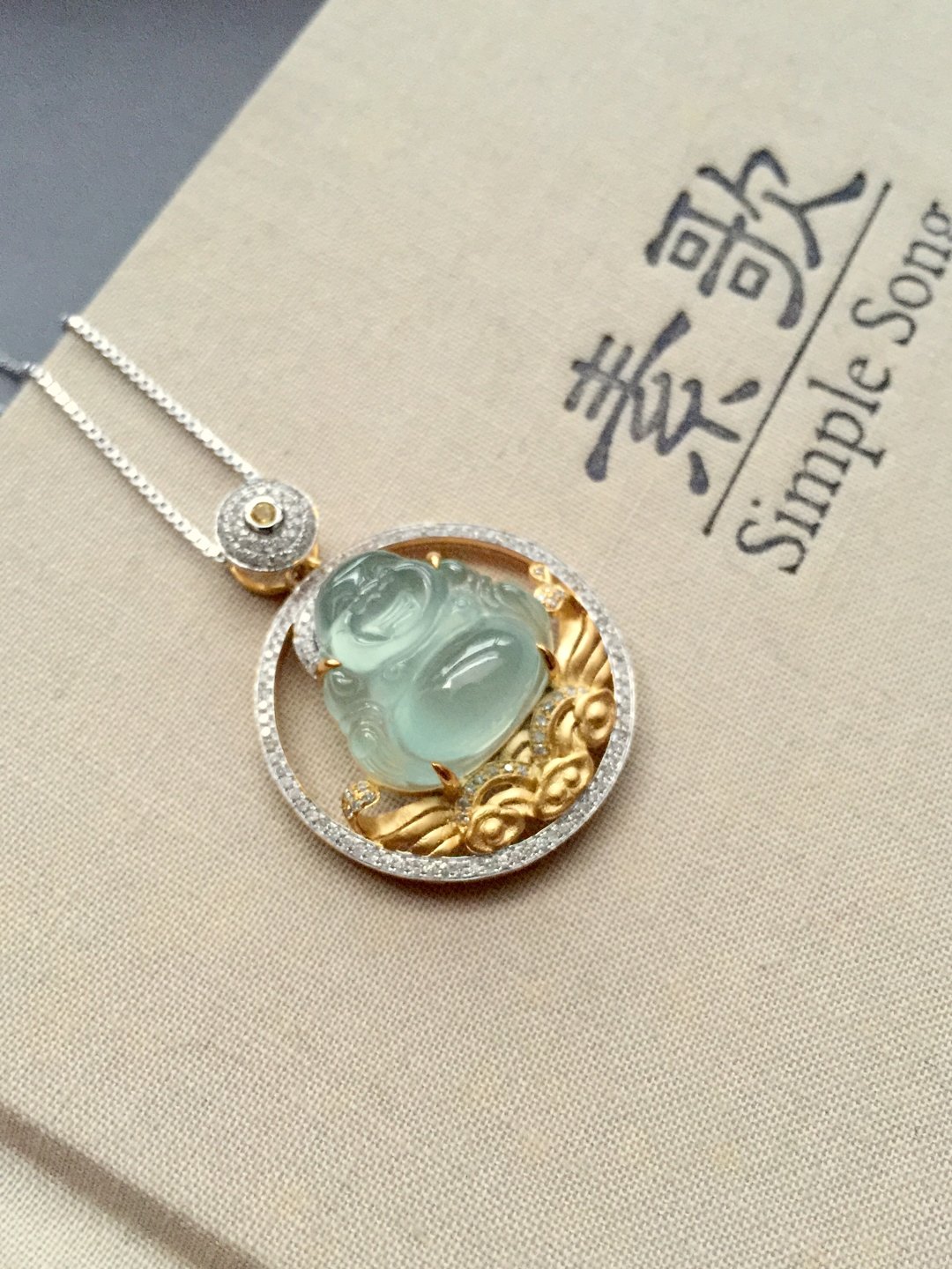 高冰种弥勒佛,16*16.5*7.8mm,镶嵌后33.7*26.2*10.7mm,晶莹剔透的种水,荧光四射,这饱满的身形和精致的雕工看得人心醉,佛公开怀大笑,让人忘却尘世的烦恼,18k白金和黄金混合镶嵌工艺加上满满的钻石,华丽而又时尚,这样一件好东西,无论是犒劳自己还是馈赠长辈都是不二选择
