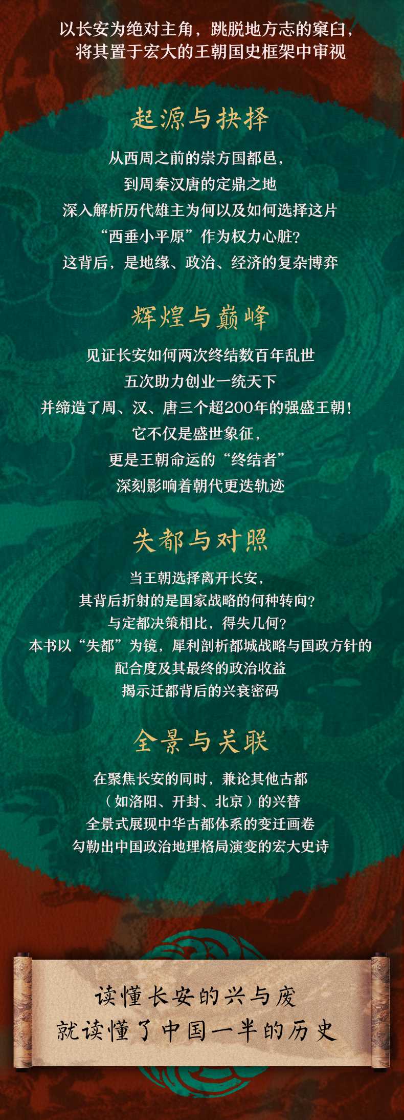 一部长安;逆袭史一座城,如何决定一个朝代的生死:长安并非天生的都城;宠儿,它从西垂小平原起步,却两次结束数百年乱世,五次助力创业一统天下,还缔造了3个超200年的强盛王朝,在历史长河中屡屡成为朝代终结者。书中深度诠释长安;虽微必大,虽弱必强的逆袭之路,展现古都的非凡魅力。可以说,读懂长安的兴与废,就读懂了中国一半的历史。创新性通过推理补全长安在西周之前作为崇方国都邑的历史,首次完整呈现4000年西安历史。以都城视角看历史,为读者提供理解王朝兴衰的全新维度:本书以西安这座古都为;主角,横跨从夏代到清代的4000年历史时光,把西安放到国史而非地方史、城市史的框架中,讨论历代政治人物为何又如何选择西安成为古都的过程,并进一步解析一代代都城战略决策与国政方针的配合程度,以及最终收获得政治收益大小如何,兼其他古都的形成与发展,全景式展示中华古都变迁的宏大史诗。作者绘制80幅地图插图,方便读者更好的理解地理位置关系,提供更好的阅读体验:地理是历史的;子宫,历史是地理的第四维,他们之间高度相关,甚至互为因果。脉络清晰,分析模式去套路化,根据阶段主要矛盾的不同来调整分析重点和风格:乱世之时与治世之时,地缘格局不同,政治制衡形势不同,主次矛盾不同,帝王对都城议题的优先级认识不同,都城的功能与都城博弈的激烈程度亦有差别。如在秦汉部分,本书着重于地缘分析。毕竟这是帝制时代大地缘格局的形成阶段。而在魏晋南北朝,则结合乱世中各种维度的社会矛盾进行分析。隋代则强调帝王个人主观决策对都城格局的影响。唐代则将个人主观决策背后的经济形势、地缘形势和阶层形势,做进一步延展性探讨。而对于宋代以后,政治、经济中心东移完成,则凸出转移前后两大历史阶段的对比,挖掘暗藏在王朝周期性更迭背后,更大的时代之变。读历史,不能不知政治。读政治,不能不知地缘。读地缘,不能略过定都:只有看明白都城史背后的定都方略、定都之困,才能看清王朝的政治基础,看懂王朝的基本盘,看穿王朝兴亡更迭的本质规律不堪定都方略,怎知政治兴衰